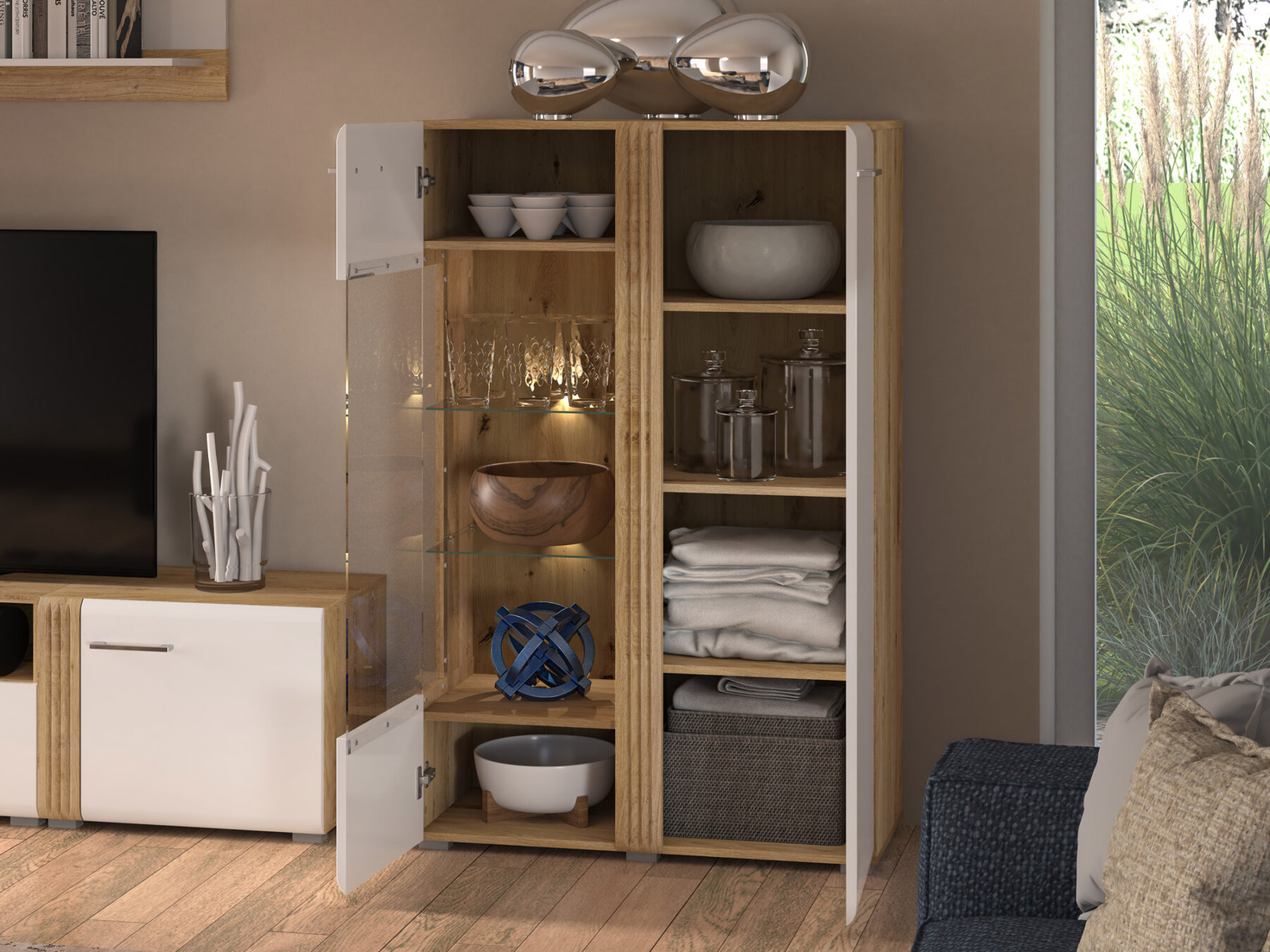 See mööbliese sobib suurepäraselt elutuppa või magamistuppa, ühendades funktsionaalsuse ja hea disaini.