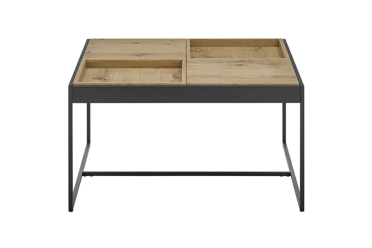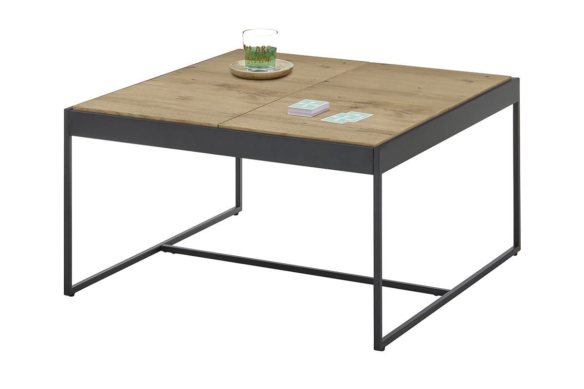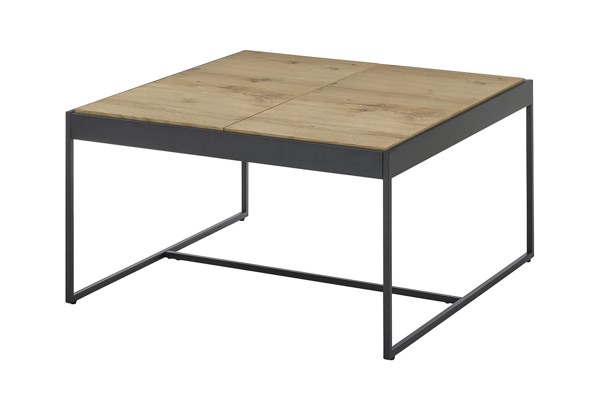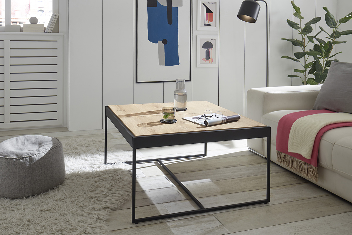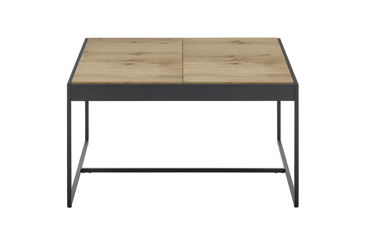 Tugev metallraam on viimistletud musta pulbervärviga, pakkudes stabiilsust ning modernset kontrasti puidupinnaga. Ruudukujuline vorm muudab laua kompaktseks ja hästi sobivaks erineva suurusega eluruumidesse.