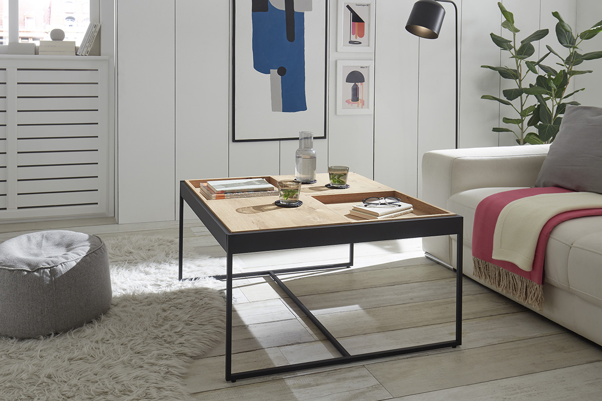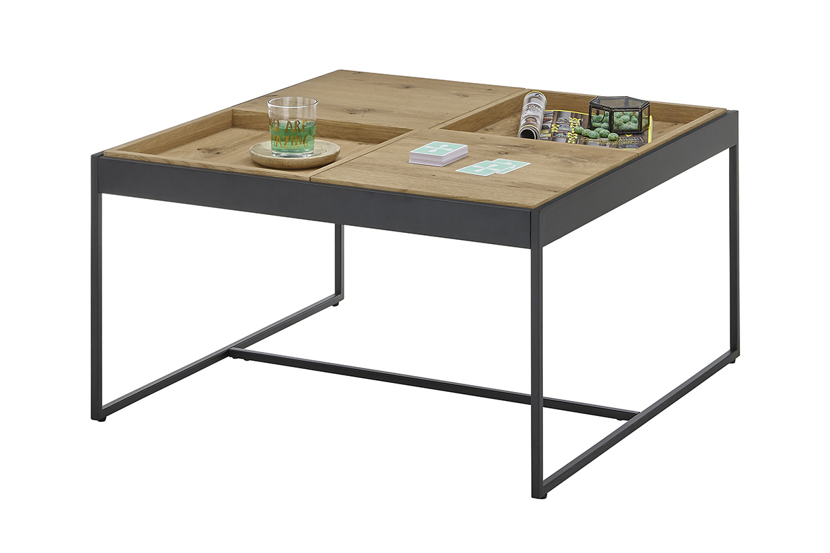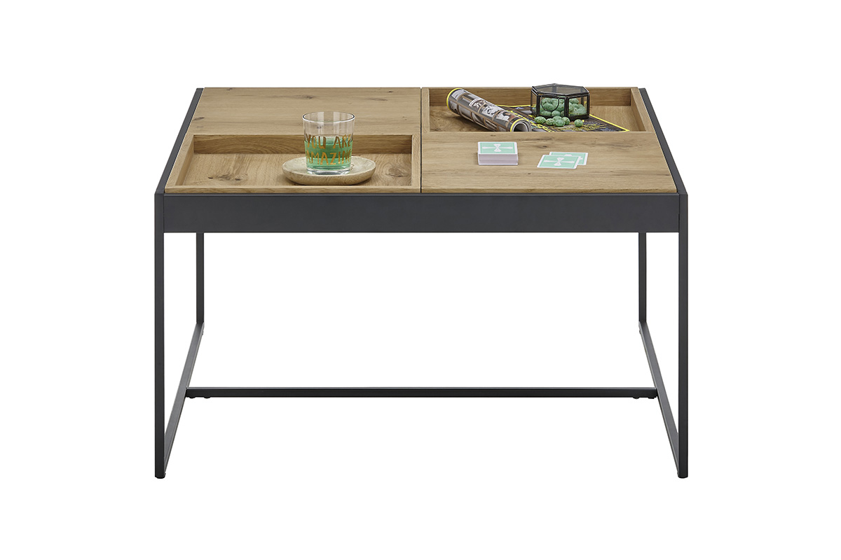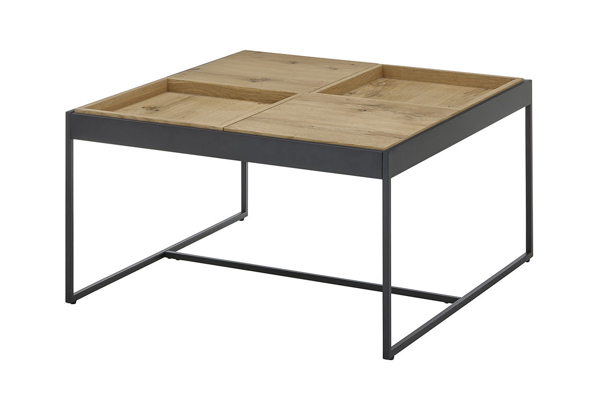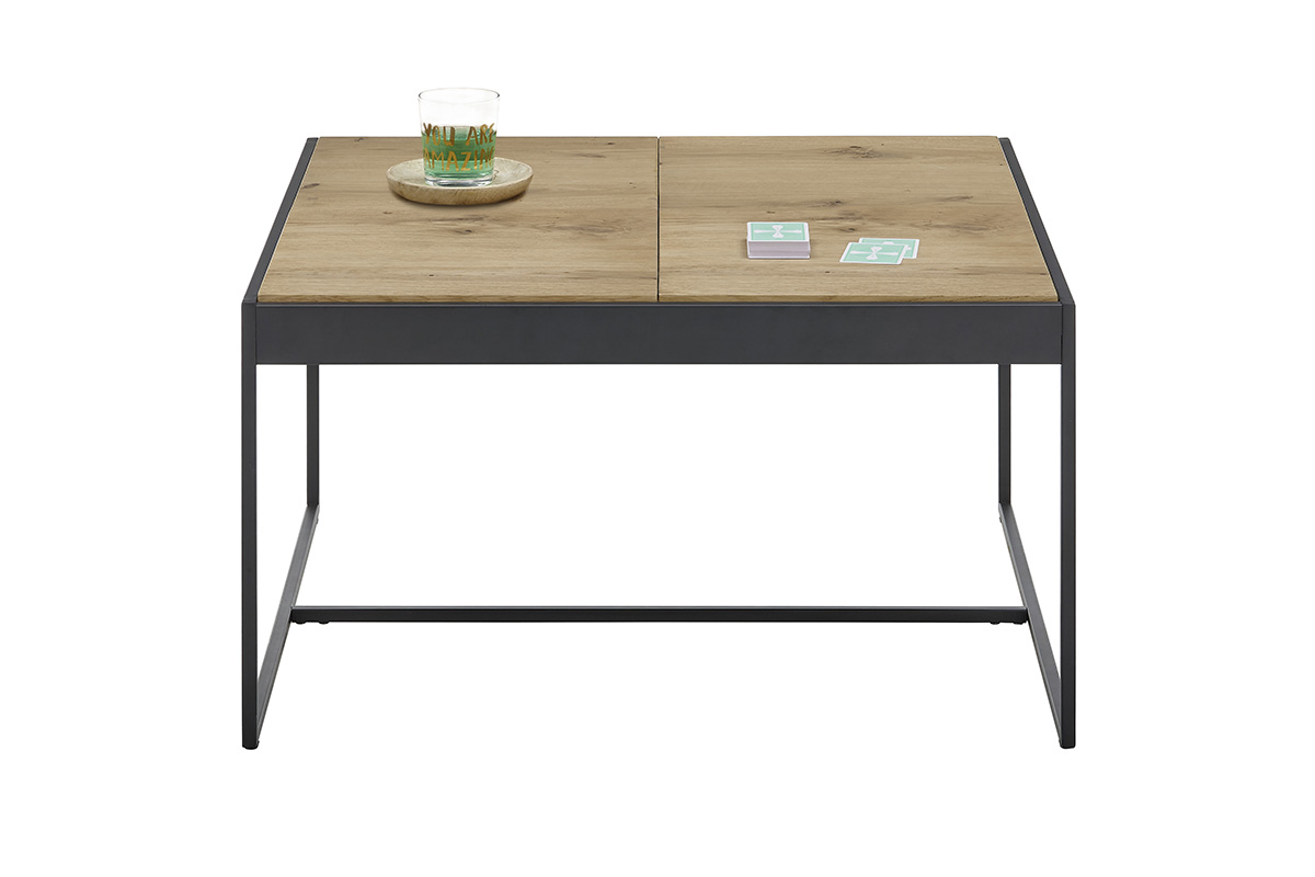 Tugev metallraam on viimistletud musta pulbervärviga, pakkudes stabiilsust ning modernset kontrasti puidupinnaga. Ruudukujuline vorm muudab laua kompaktseks ja hästi sobivaks erineva suurusega eluruumidesse.