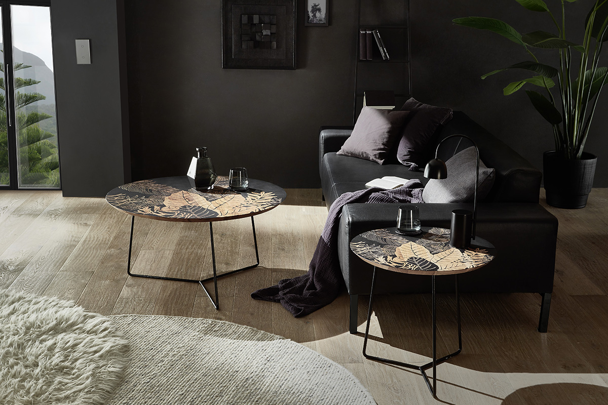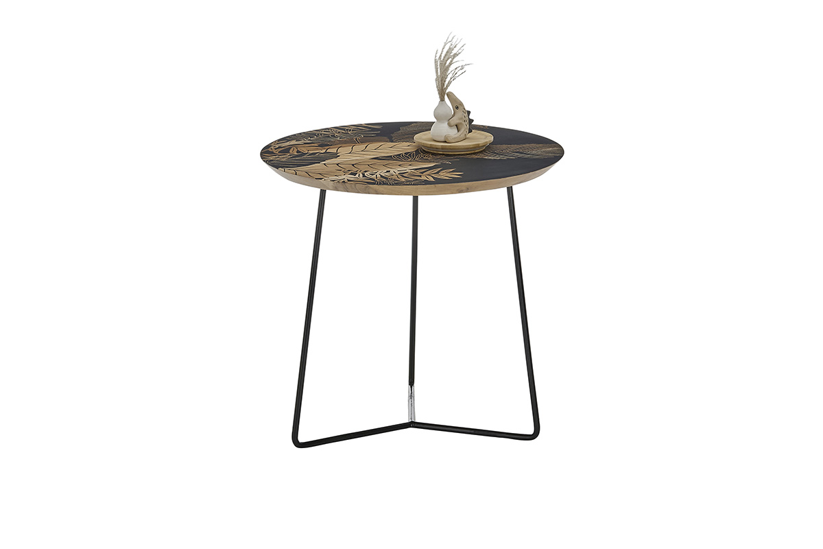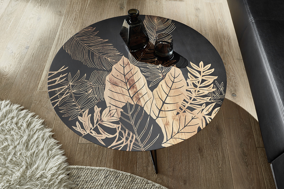 Diivanilaud Mirandel on pilkupüüdev ja isikupärase disainiga ümmargune diivanilaud, mis ühendab naturaalse puidu ja kunstilise mustri modernse metallkonstruktsiooniga. Selle dekoratiivne lauaplaat muudab iga ruumi stiilseks ja ainulaadseks.