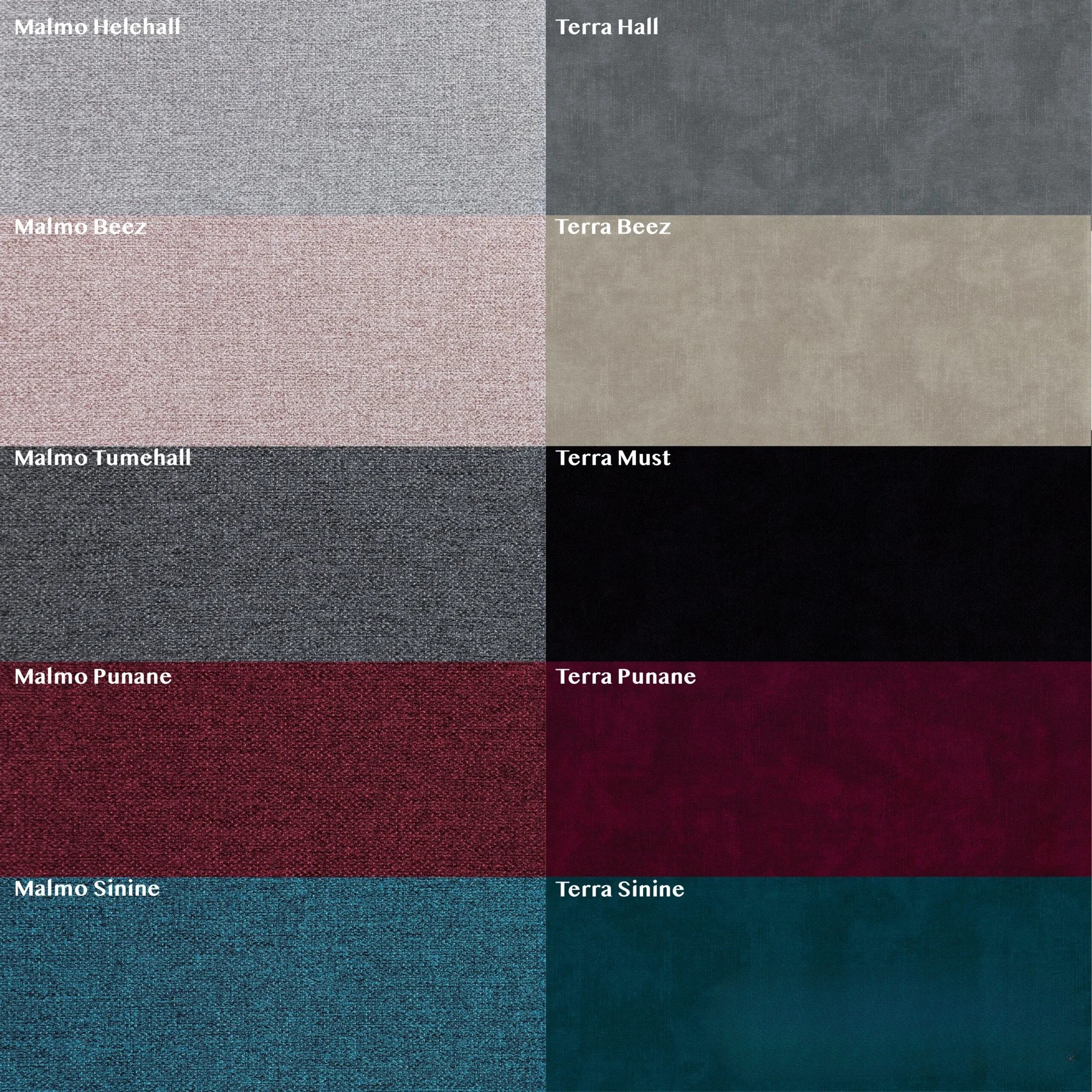 Malmo Beež, Malmo Helehall, Malmo Tumehall, Malmo Sinine, Malmo Punane, Terra Beež, Terra Hall, Terra Sinine, Terra Punane, Terra Must