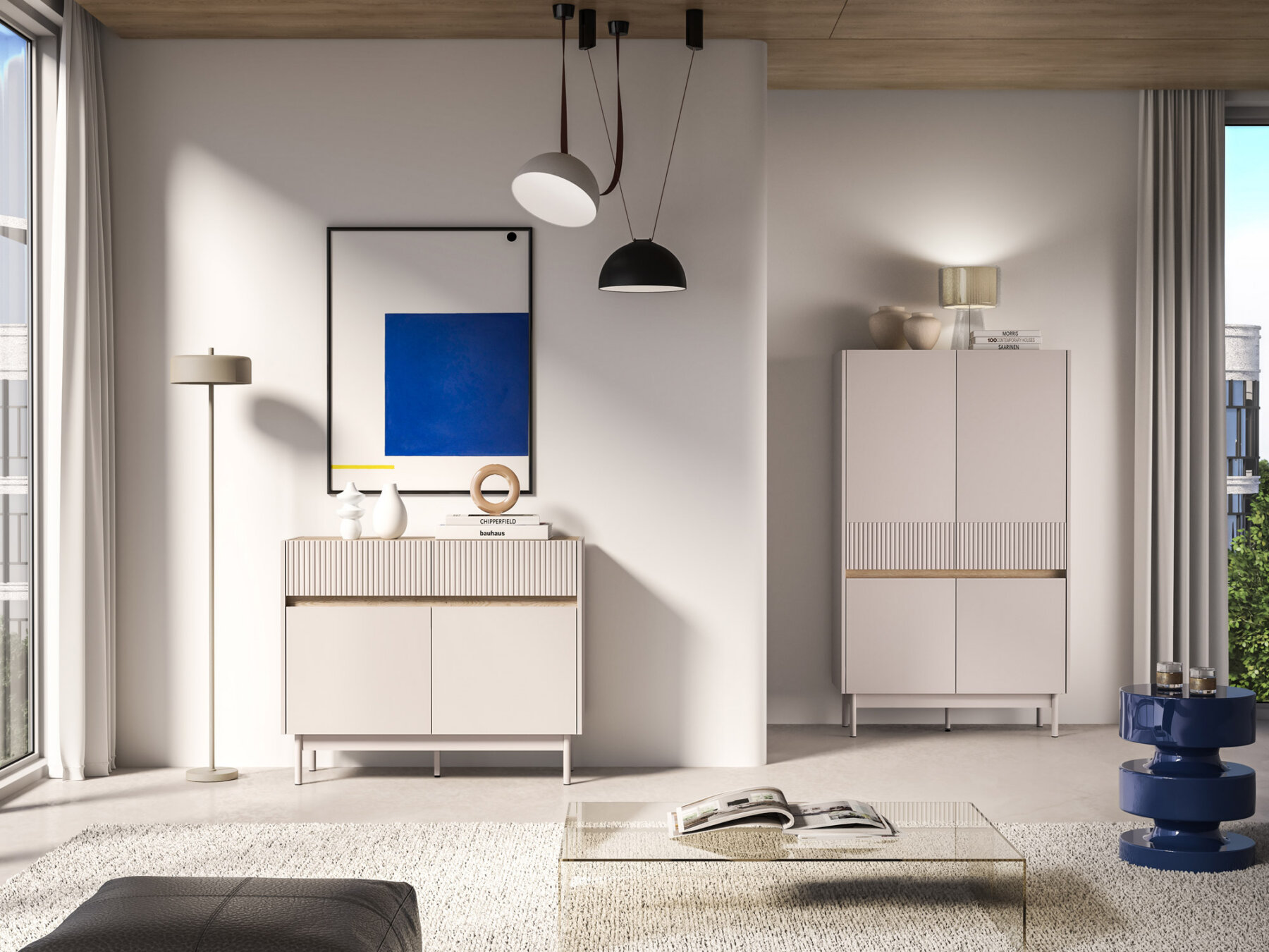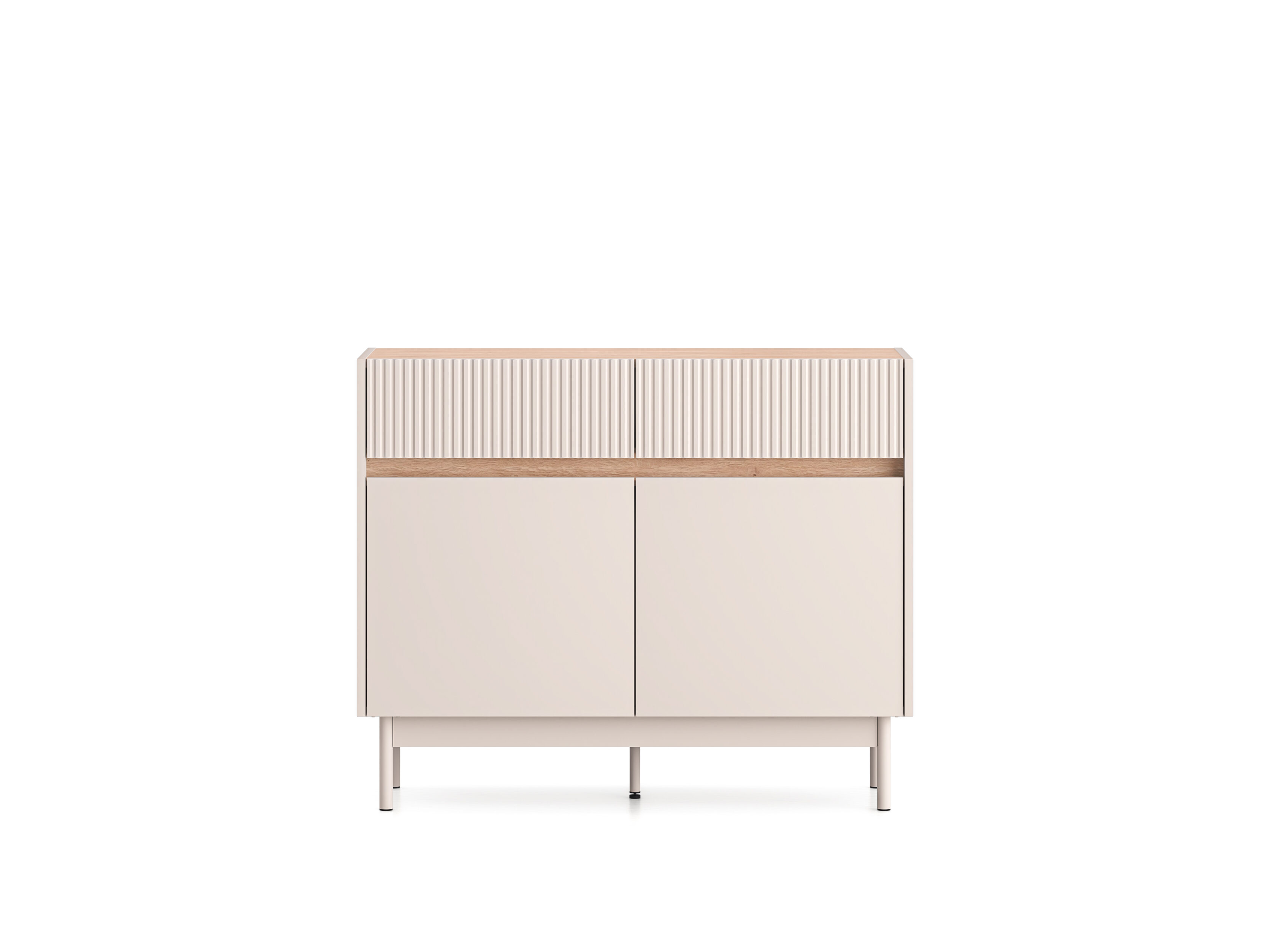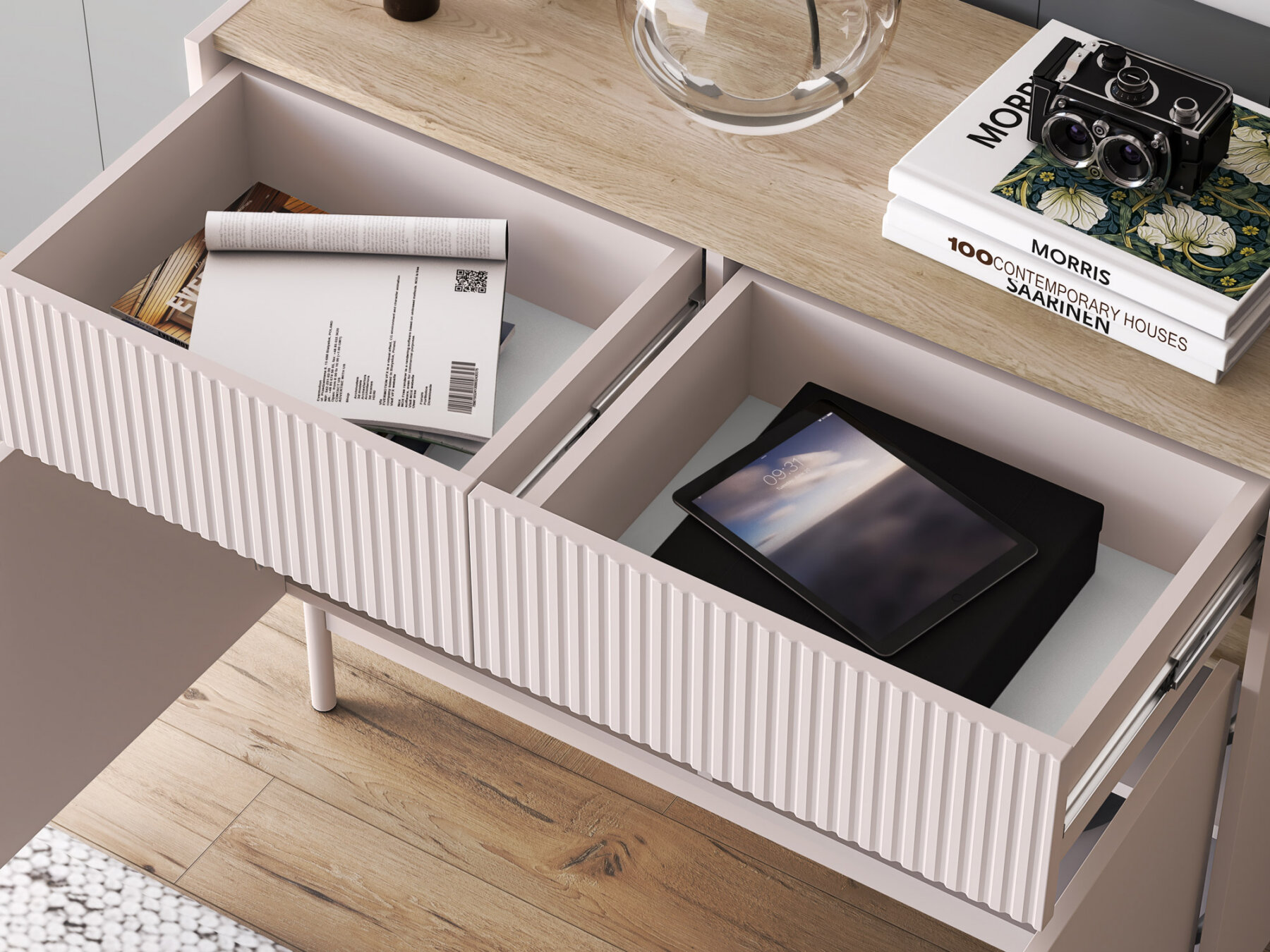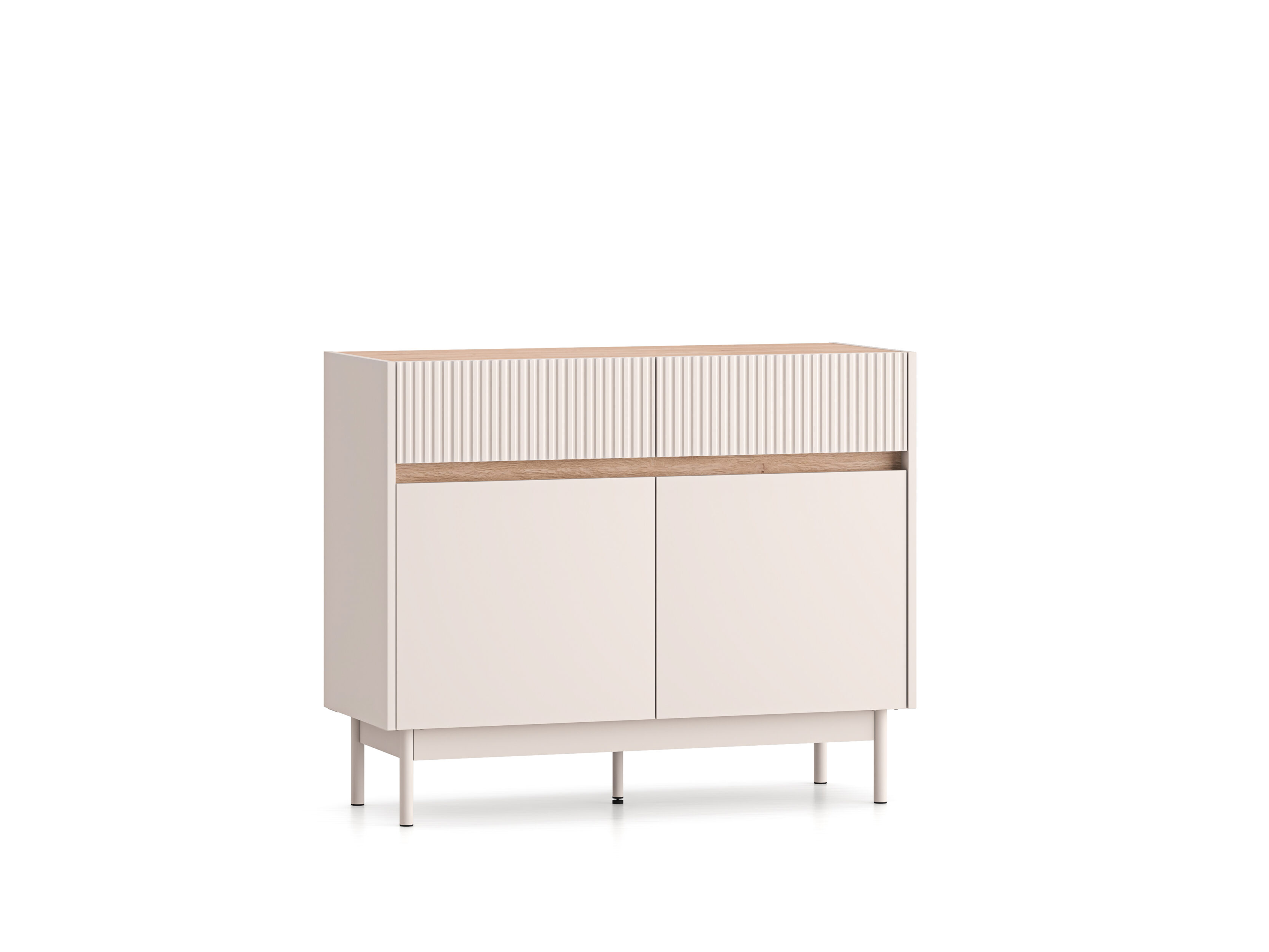 Mööbli ülemises osas paiknevad kaks sahtlit, mis on ideaalsed dokumentide või kodutekstiilide hoiustamiseks. Lai pealispind pakub suurepärast võimalust elegantsete vaaside, dekoratiivesemete või reisidelt toodud suveniiride eksponeerimiseks.