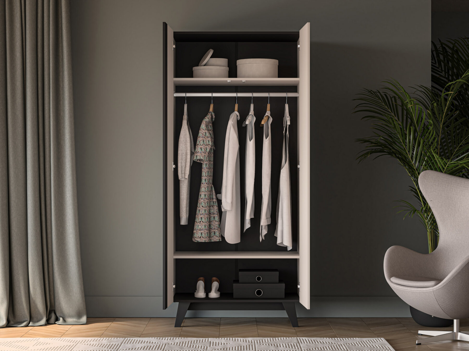 Virge 01 kaheukseline riidekapp on praktiline mööbliese, mis sobib suurepäraselt riiete, aksessuaaride ja muude kodutekstiilide hoiustamiseks. See aitab hoida interjööri korras ning tõstab igapäevase kasutusmugavuse uuele tasemele.