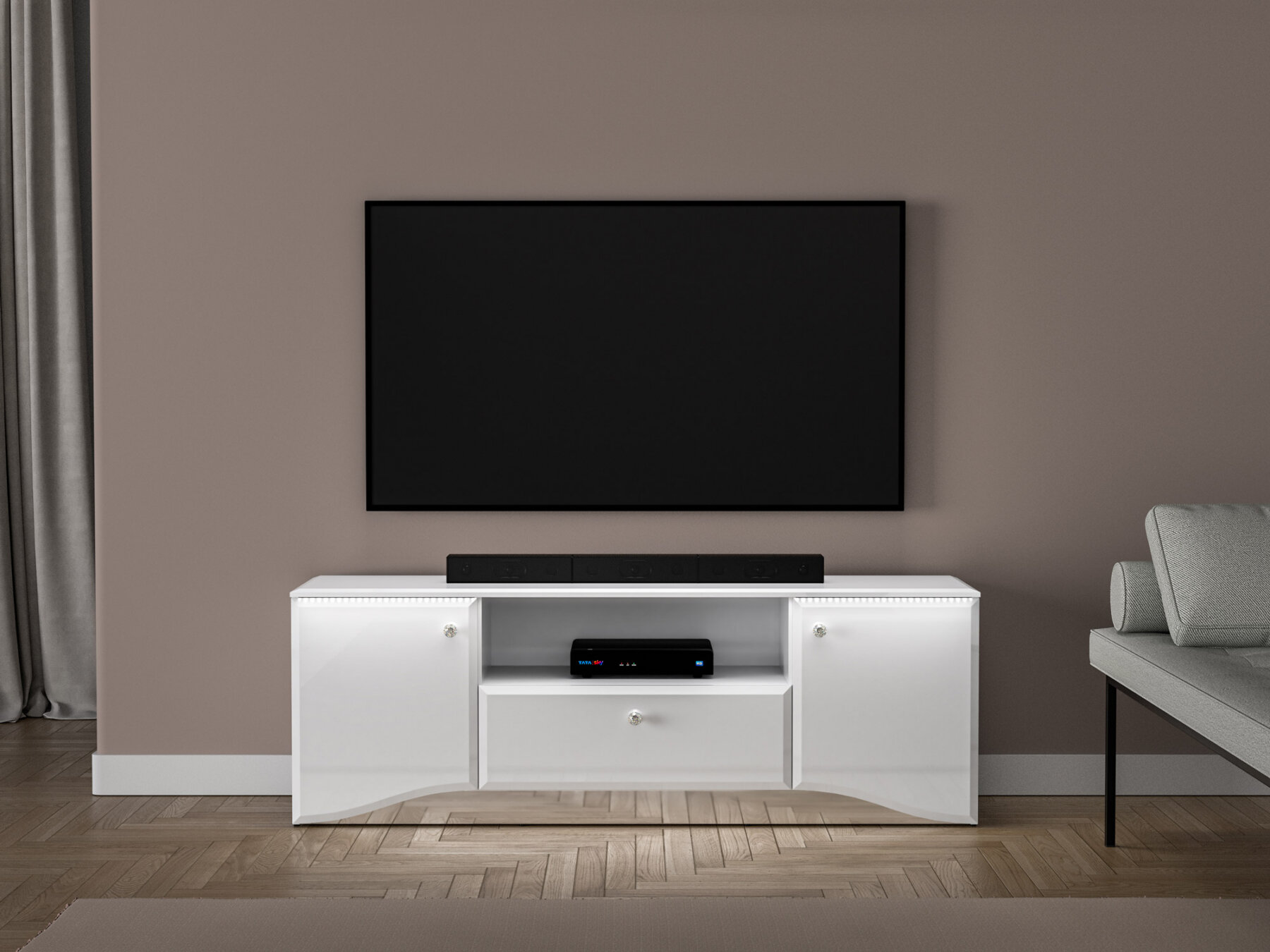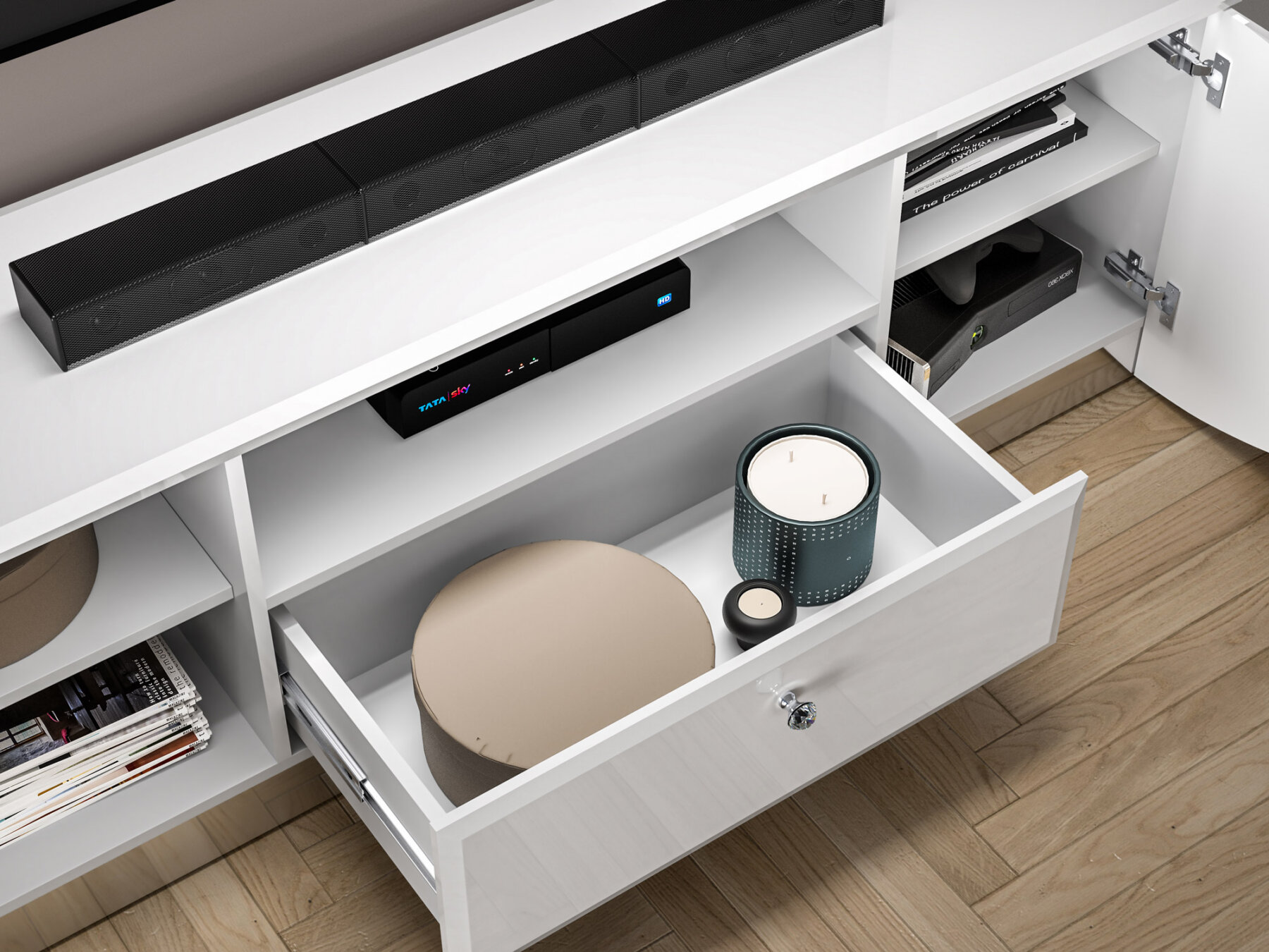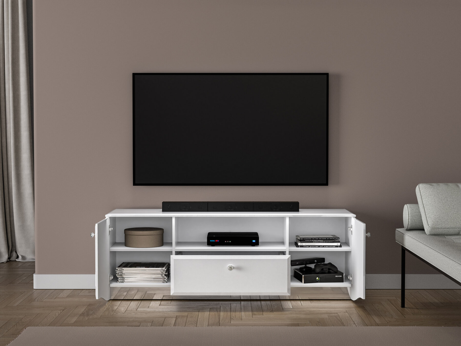 Tänu oma mahukale sisemusele pakub kapp rohkelt ruumi teleritarvikute, mängukonsooli ja muude seadmete hoiustamiseks.