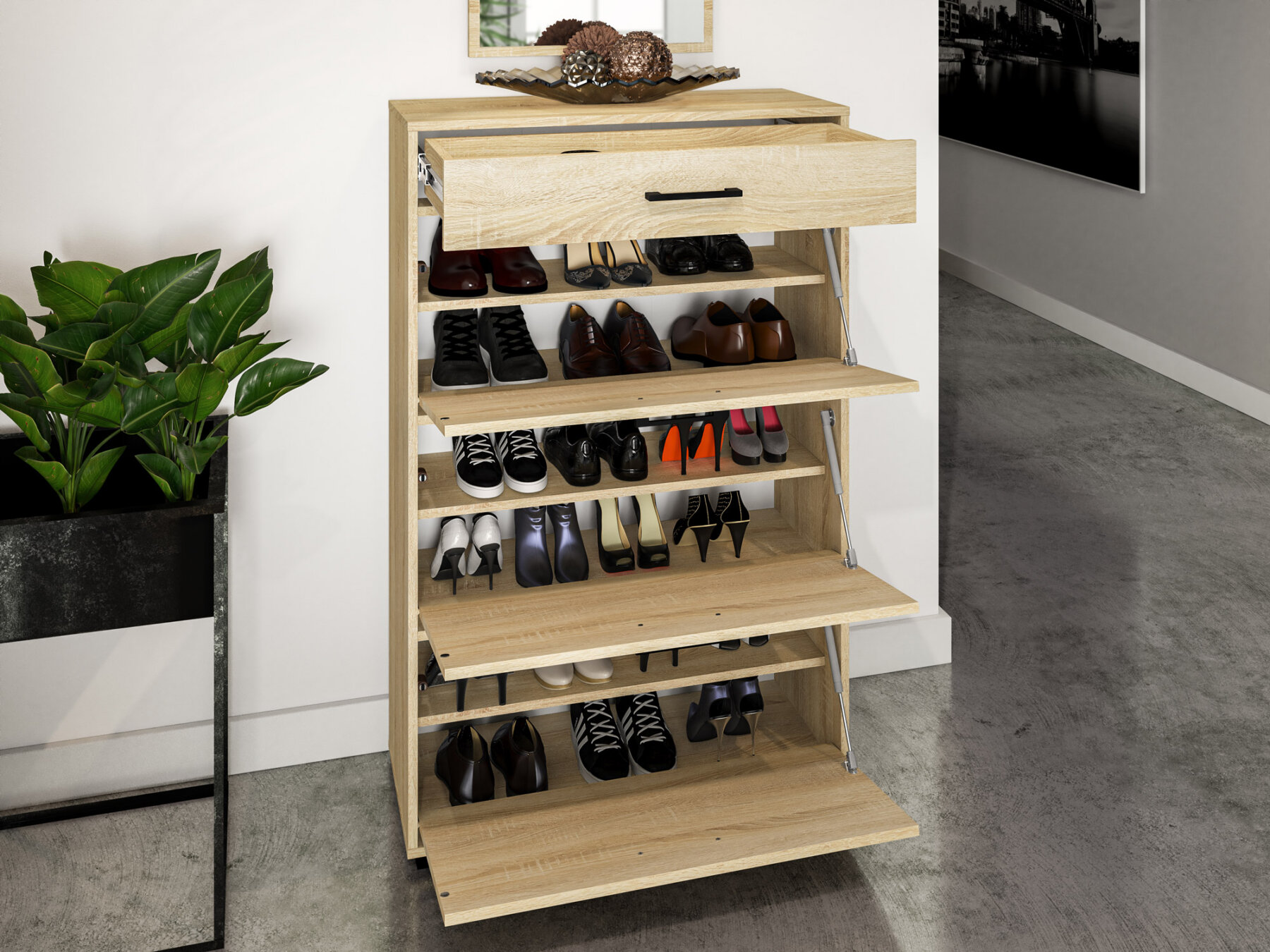 Mööbliese pakub kuut mahukat sektsiooni jalanõude hoiustamiseks.