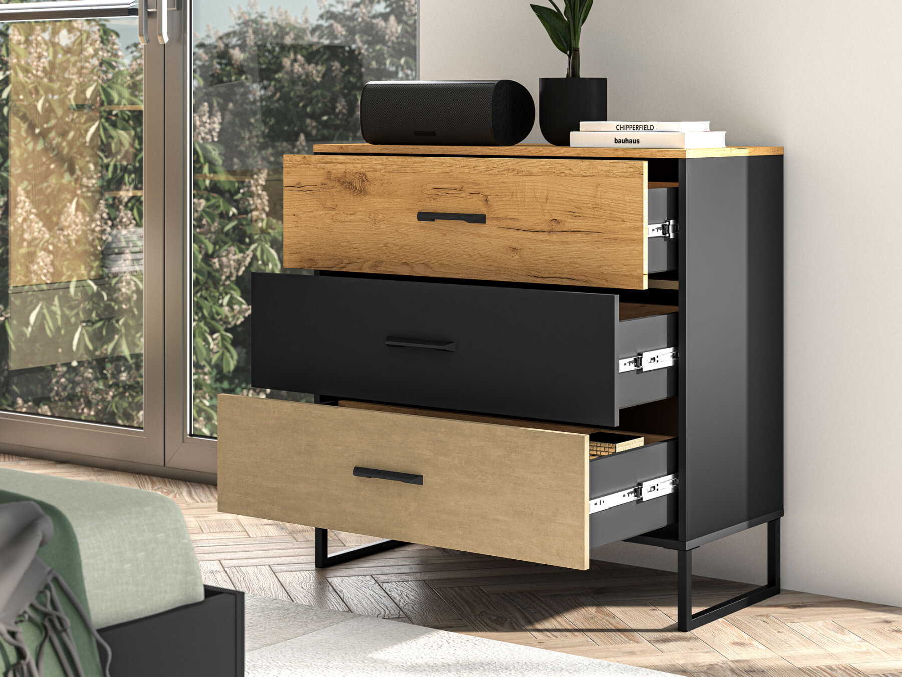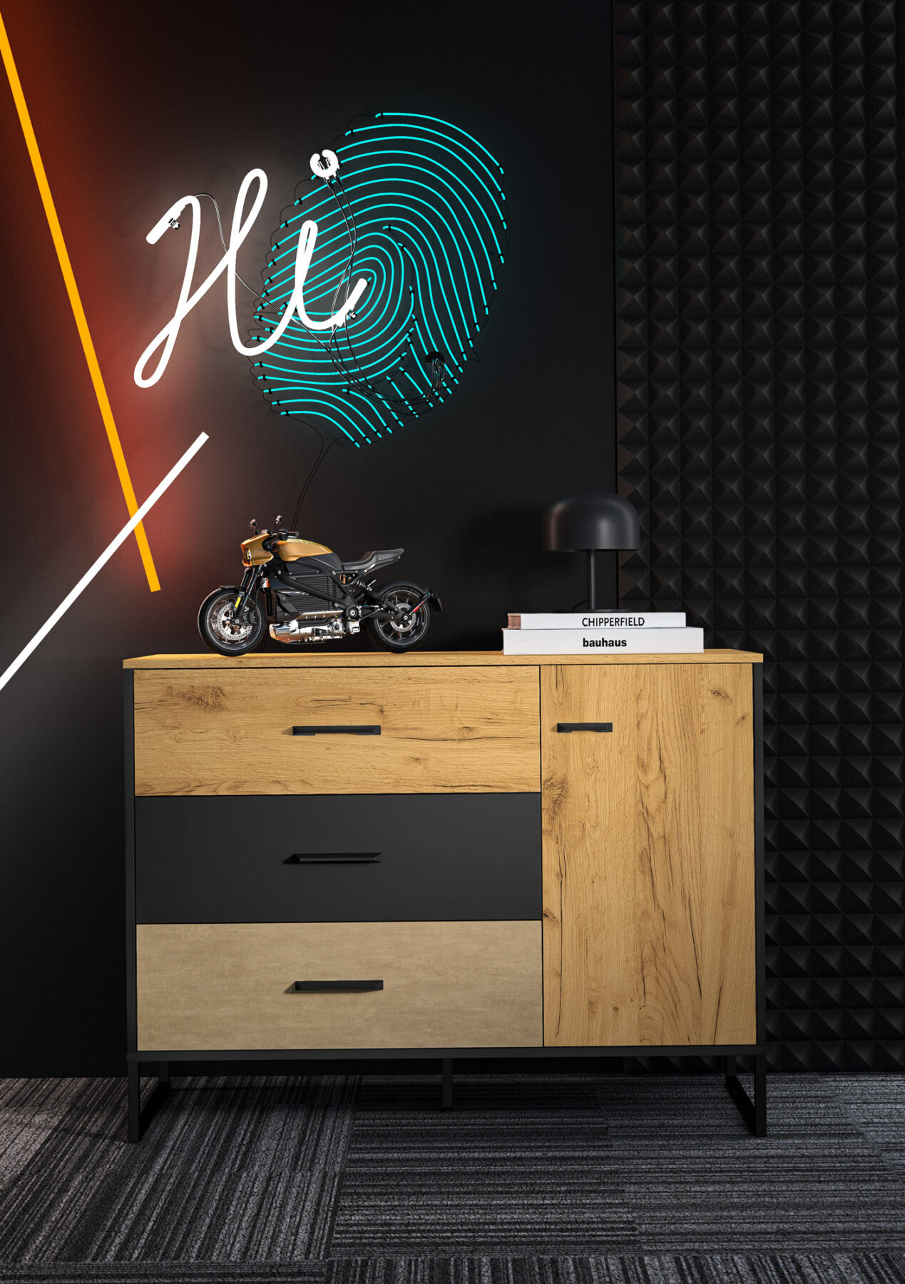 Mööbli disain ja dünaamiline viimistluste kombinatsioon – soe Craft-tamm, toore terase toon Premium Steel ning kontrastne must – rõhutavad noorte individuaalset stiili ja isikupära.
