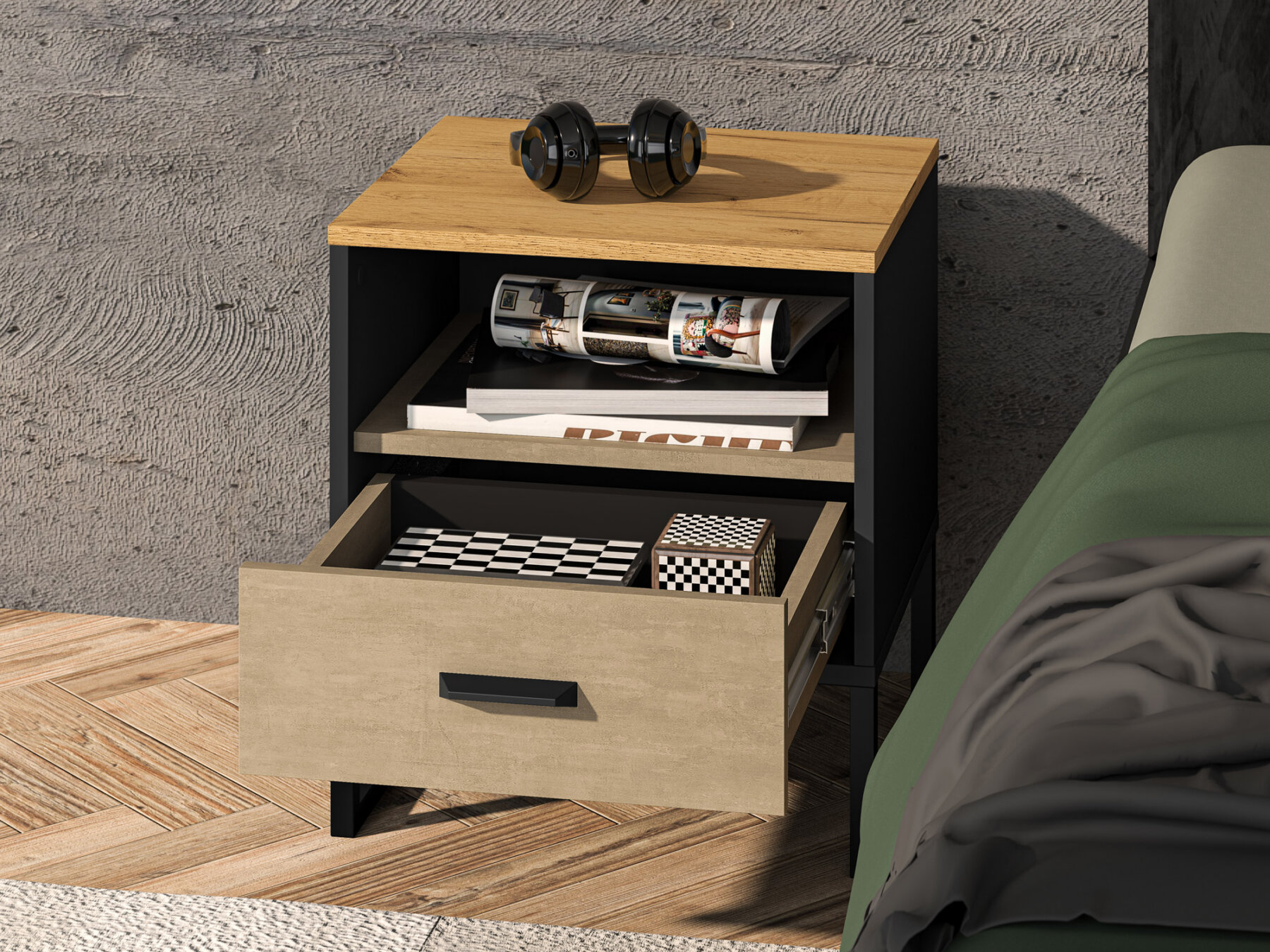Mööbli disain ja dünaamiline viimistluste kombinatsioon – soe Craft-tamm, toore terase toon Premium Steel ning kontrastne must – rõhutavad noorte individuaalset stiili ja isikupära.