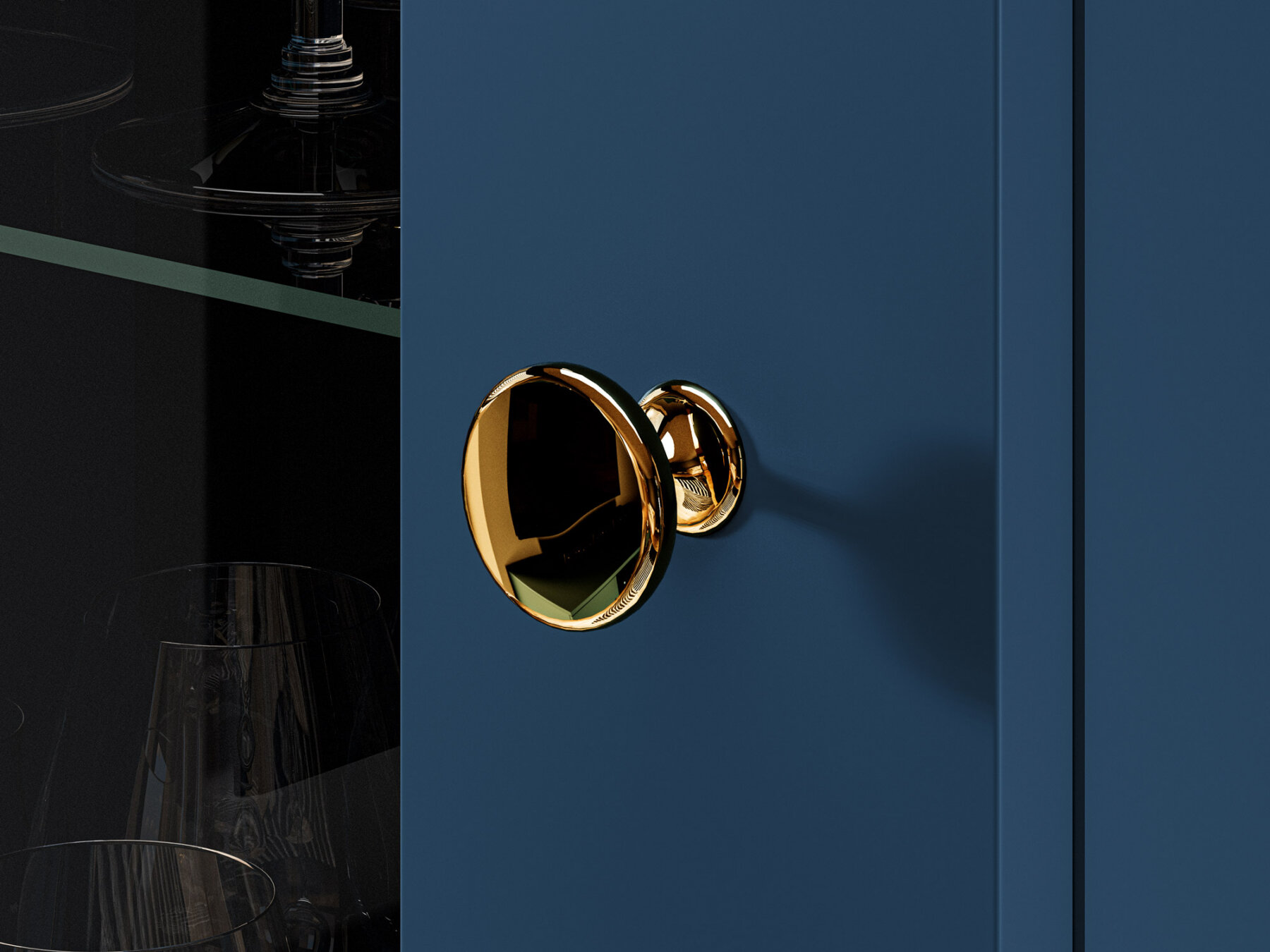 Kolm klaasriiulit jaotavad klaasukse taga oleva ruumi neljaks sektsiooniks, muutes lemmikesemete esitlemise lihtsaks ja nauditavaks.