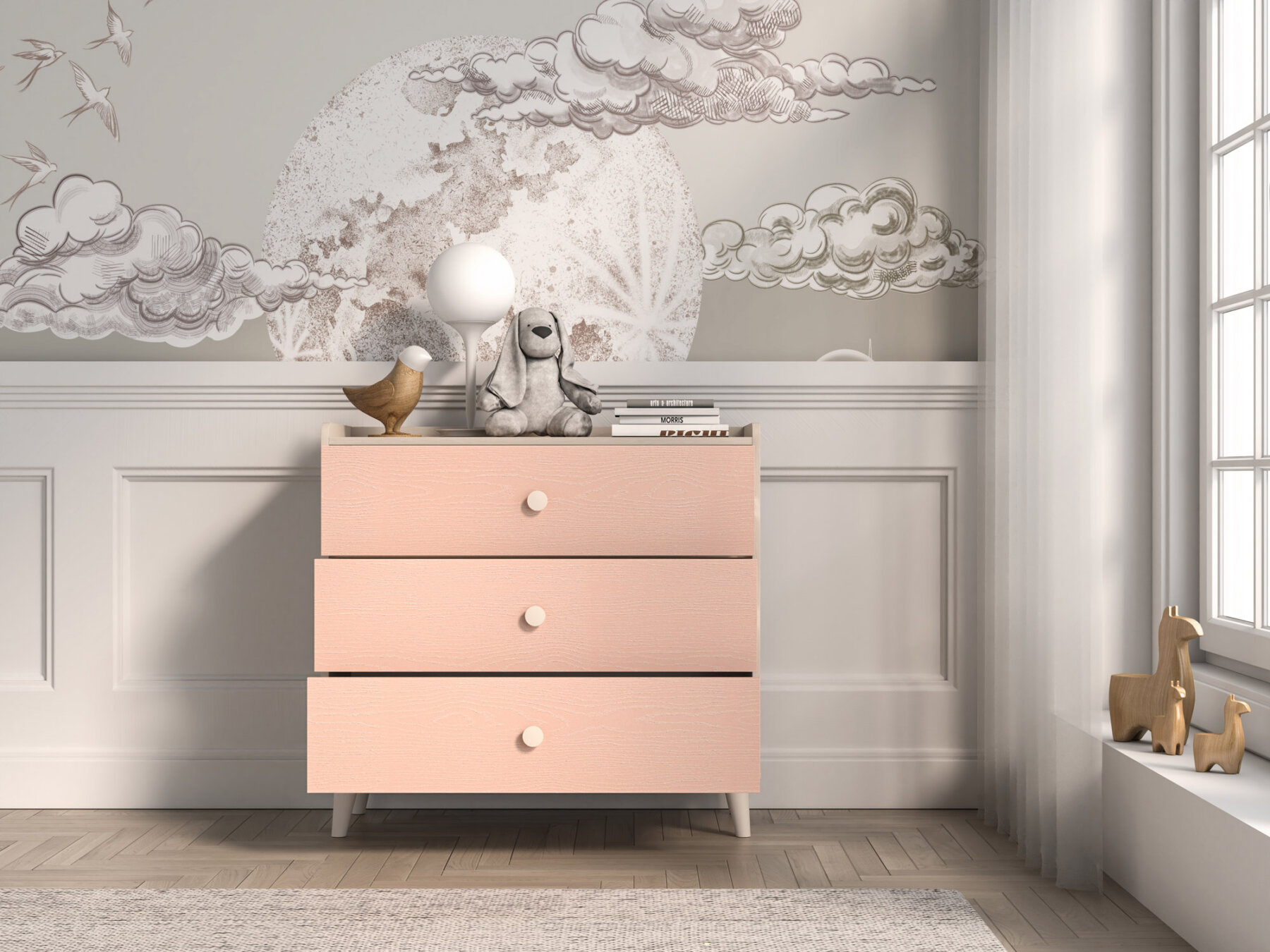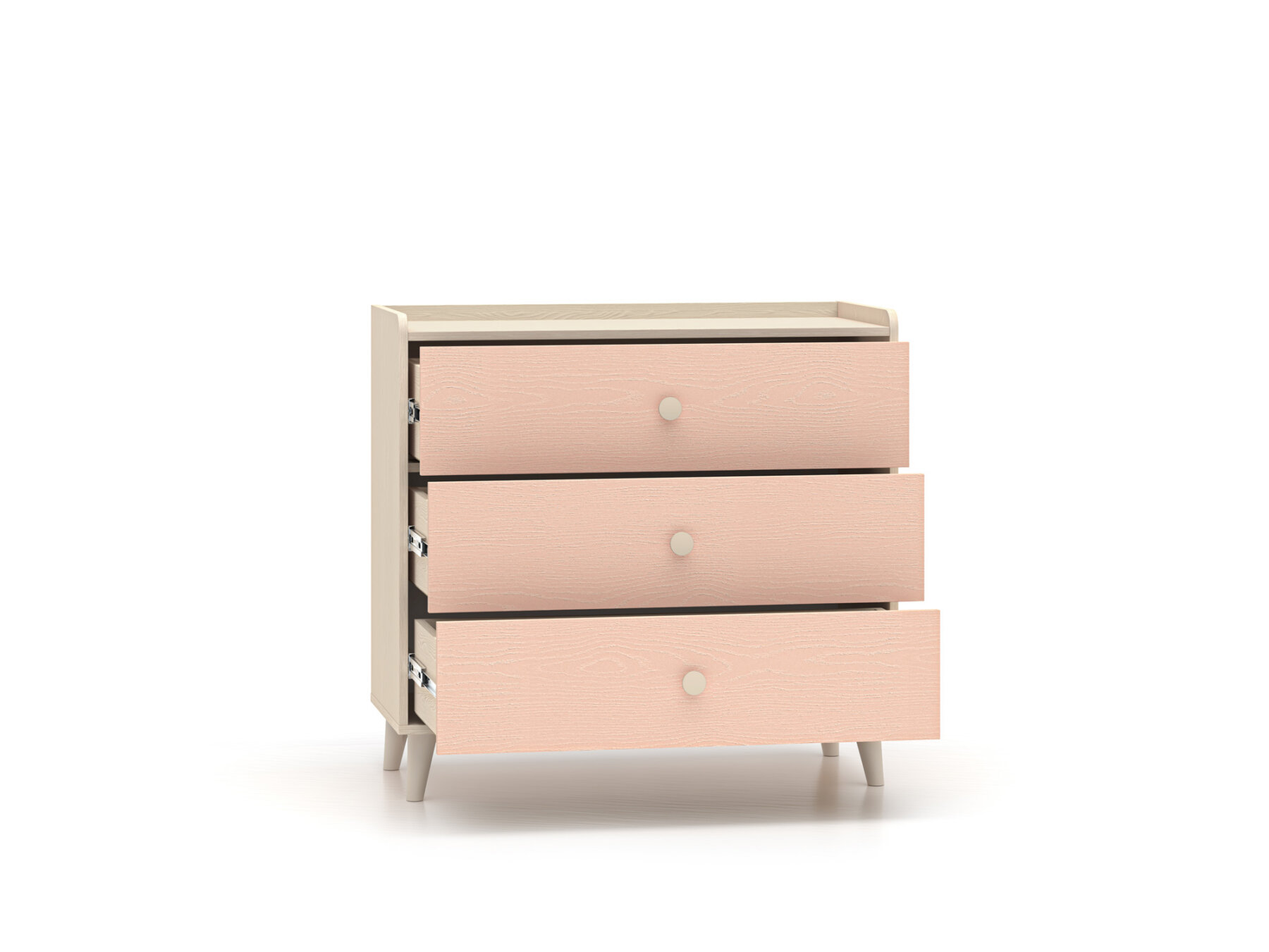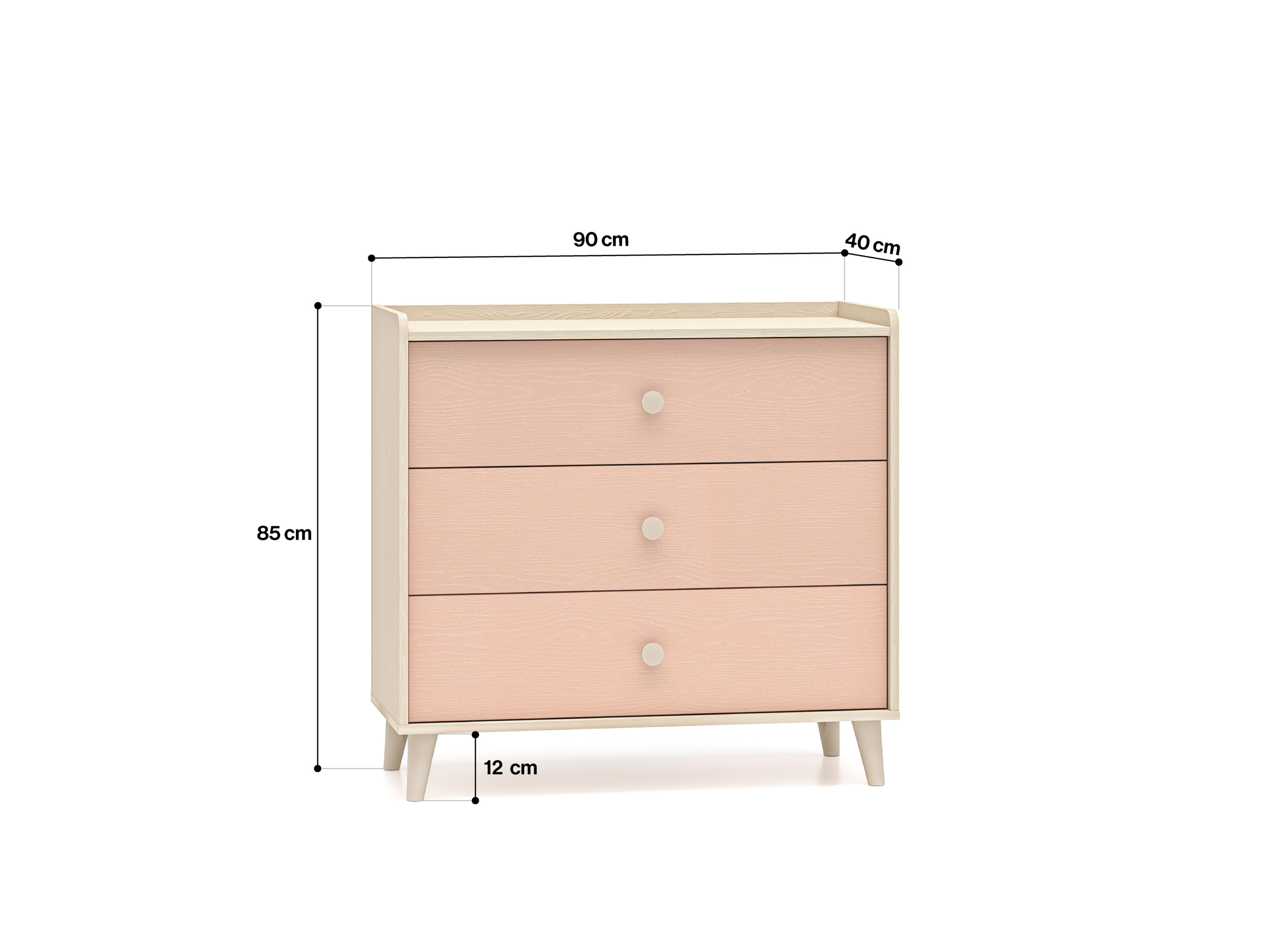 Kummutil on kolm avarat sahtlit, kuhu saab mugavalt paigutada aluspesu, sokke või voodipesu. Suur pealispind sobib ideaalselt raamatute asetamiseks või lemmikmänguasjade väljapanekuks. Madalam ülemine serv ja tagumine lisariba aitavad vältida esemete maha kukkumist – nii ei satu ükski mänguasi mööbli taha.