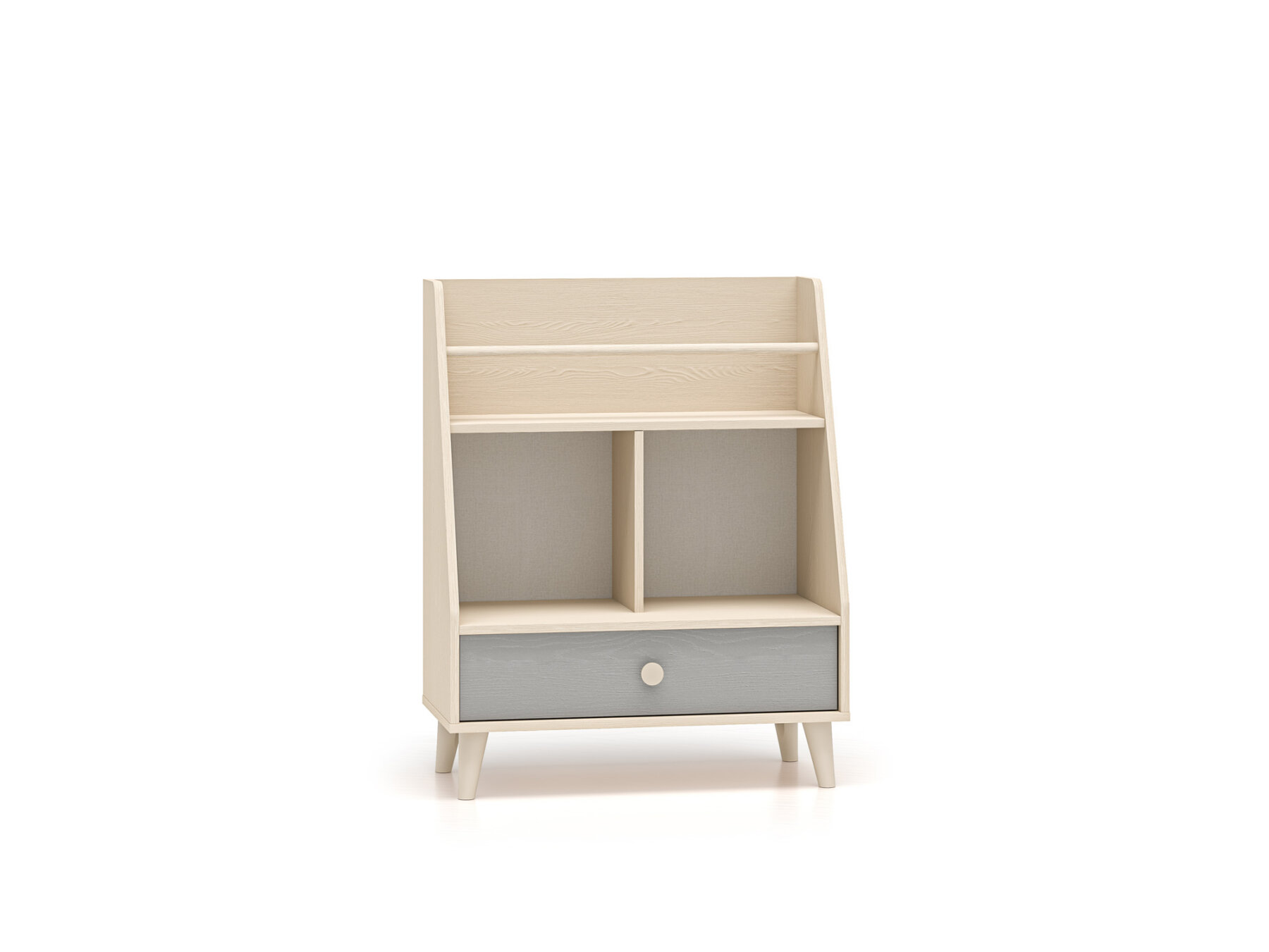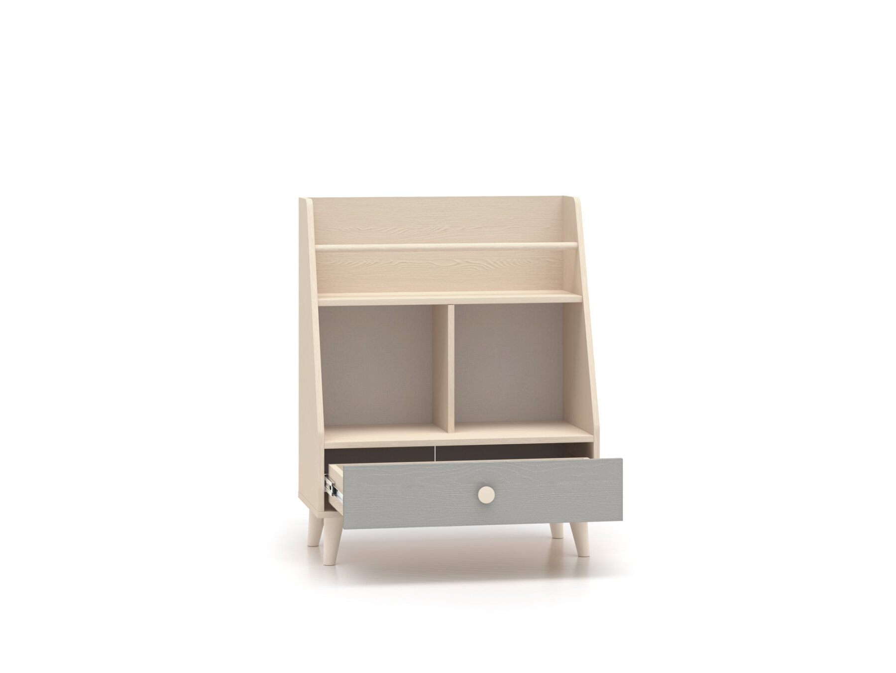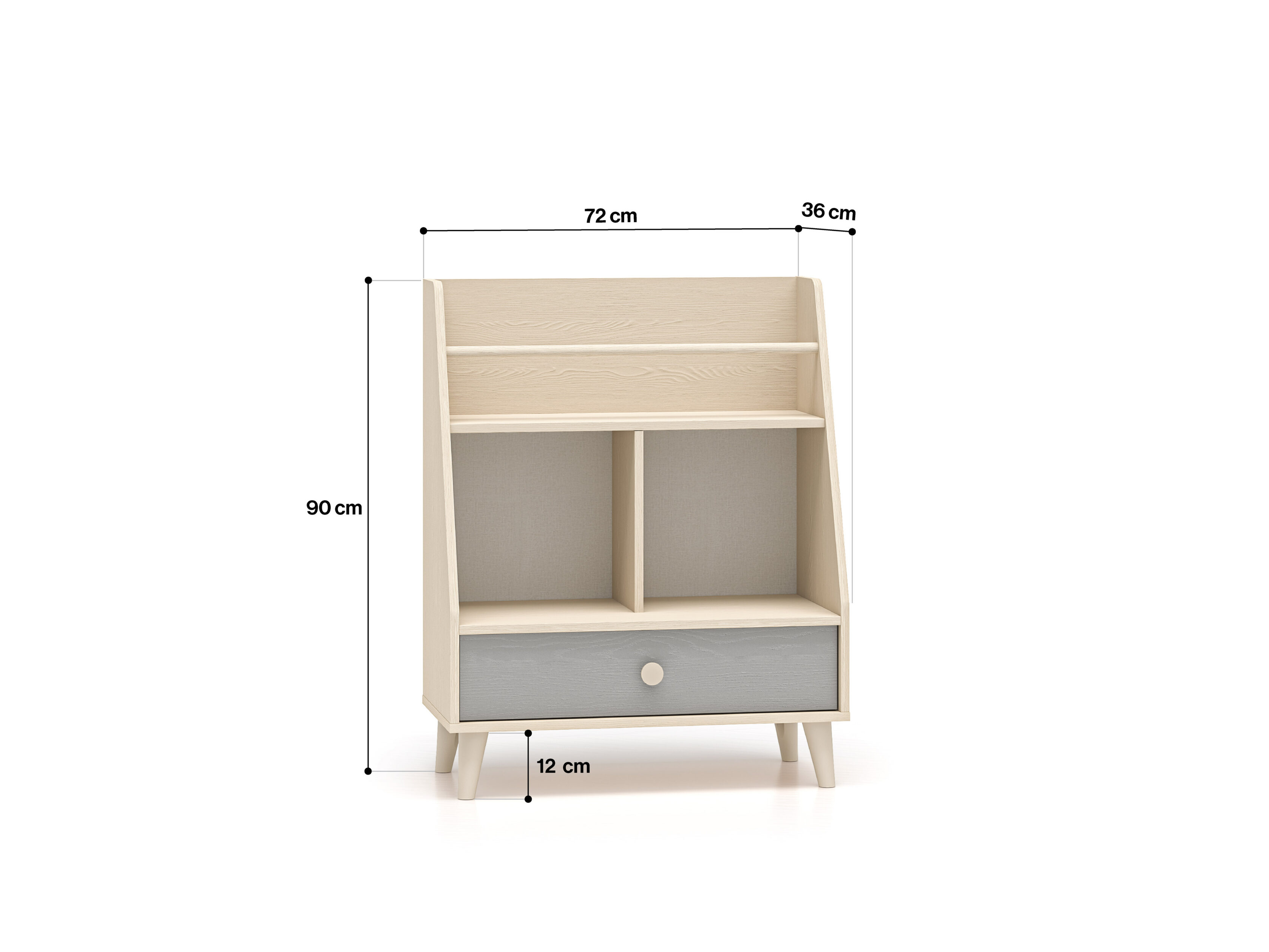 Raamaturiiulil on avar sahtel, kuhu saab mugavalt paigutada aluspesu, sokke või voodipesu. Kaks laia avatud riiulit – üks kitsa vaheseinaga ja teine turvapiirdega – loovad ideaalse koha raamatutele, lemmikmänguasjadele või kujukeste kollektsioonile.