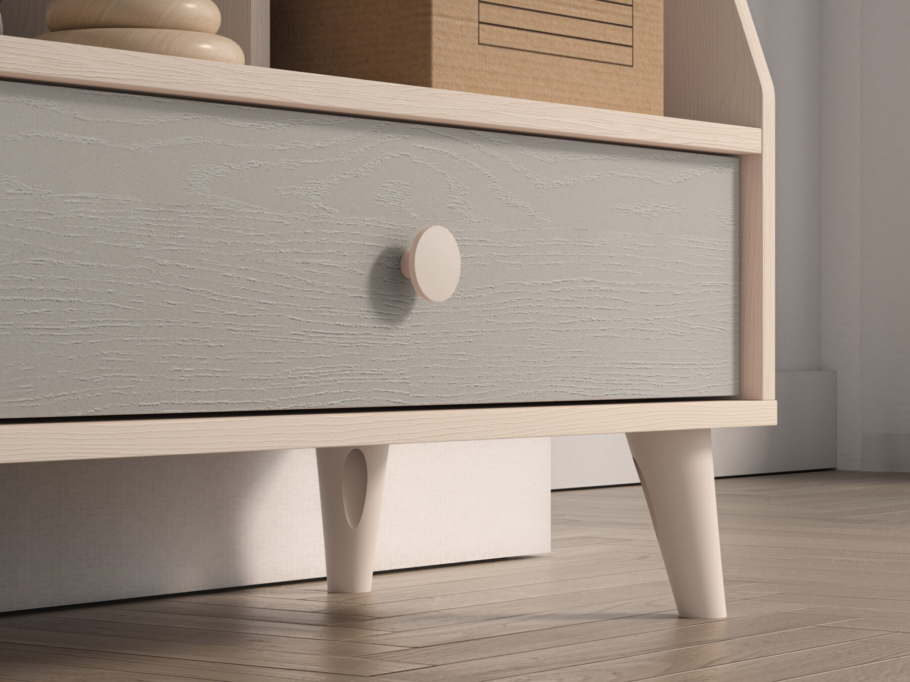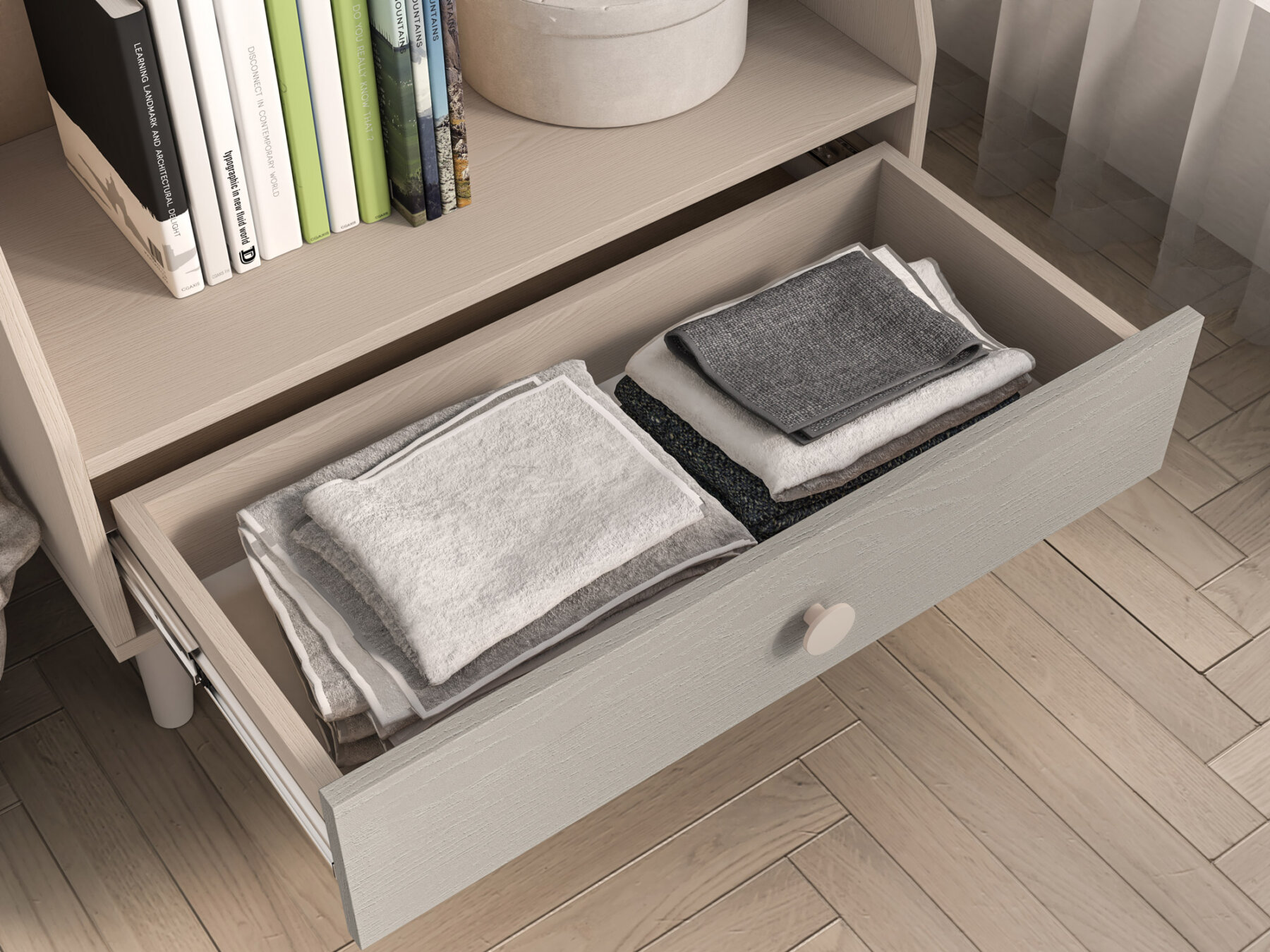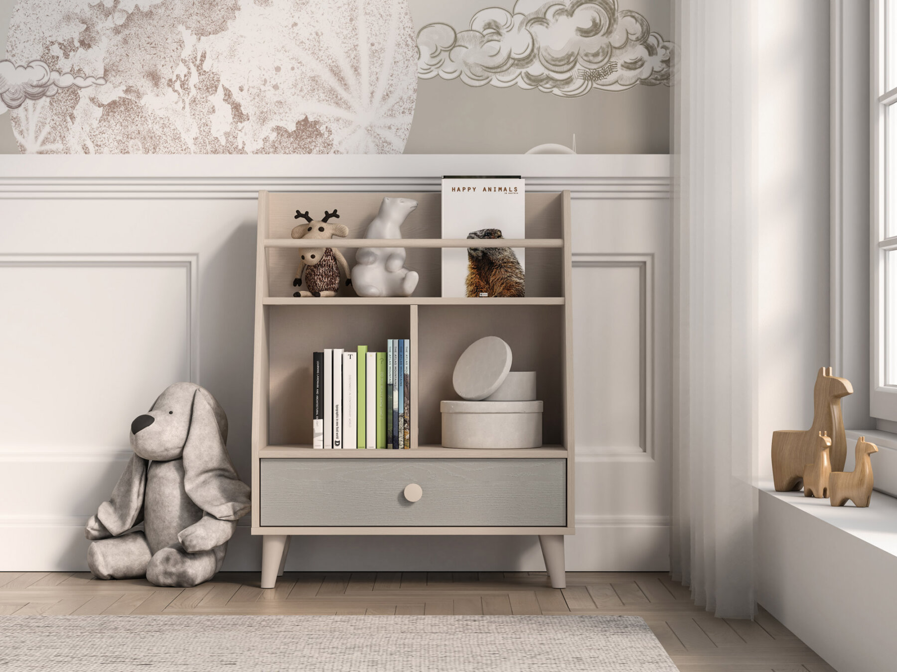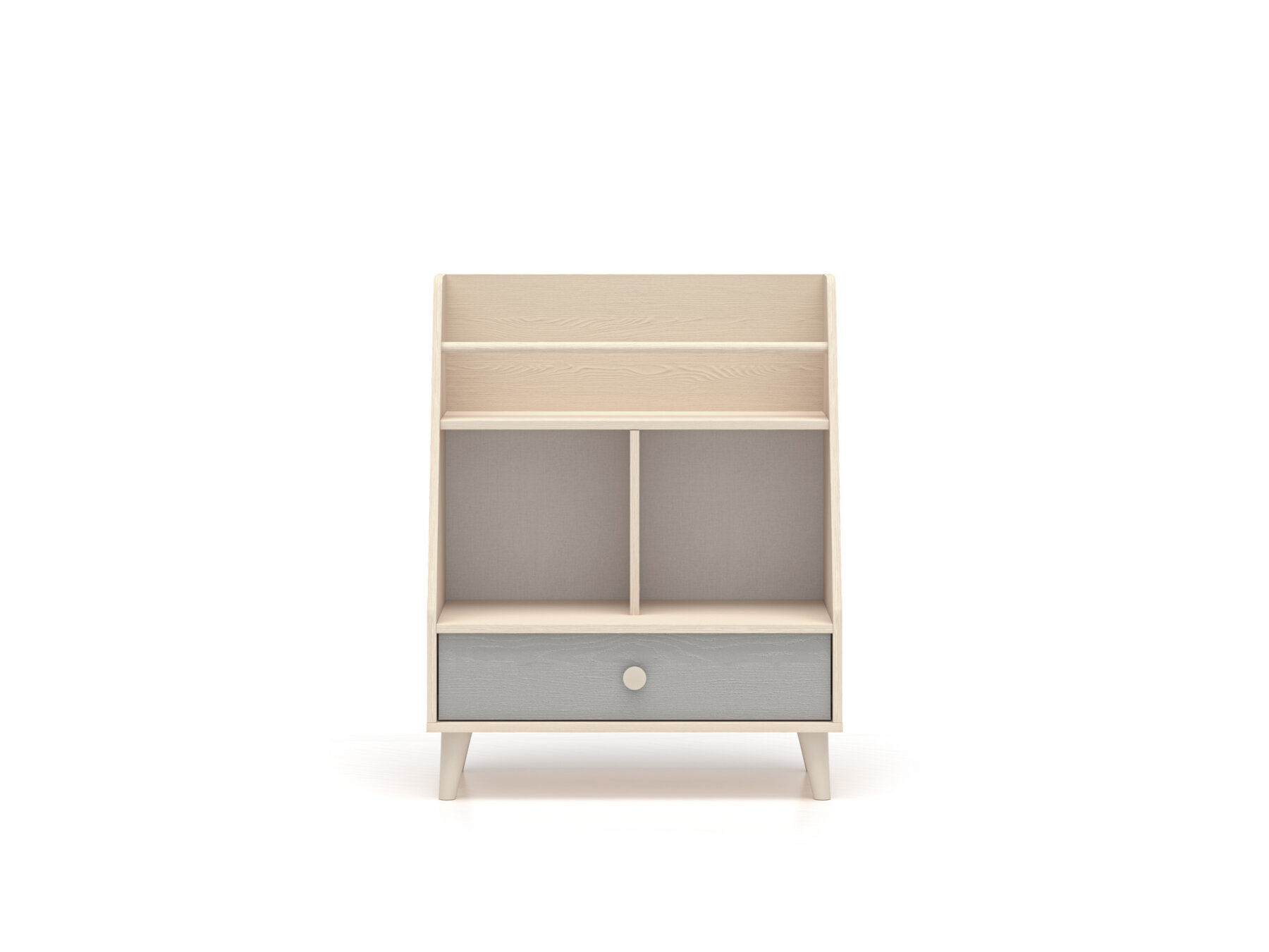 Raamaturiiulil on avar sahtel, kuhu saab mugavalt paigutada aluspesu, sokke või voodipesu. Kaks laia avatud riiulit – üks kitsa vaheseinaga ja teine turvapiirdega – loovad ideaalse koha raamatutele, lemmikmänguasjadele või kujukeste kollektsioonile.