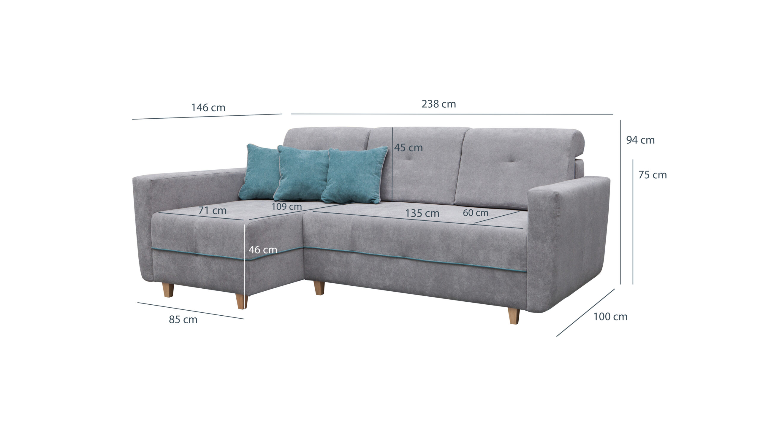 • Seljatoe kõrgus (ilma peatugedeta): 75 cm, koos peatugedega 94 cm