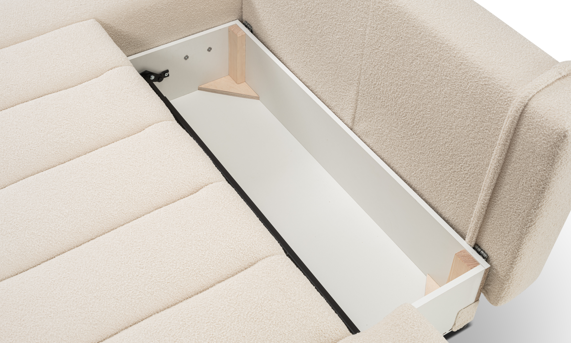 Paloo nurgadiivanvoodi on varustatud lihtsalt kasutatava lahtikäimismehhanismiga, mille abil saab diivani kiiresti muuta avaraks ja mugavaks magamispinnaks. Integreeritud panipaik pakub praktilist hoiuruumi voodipesu ja muude esemete jaoks.