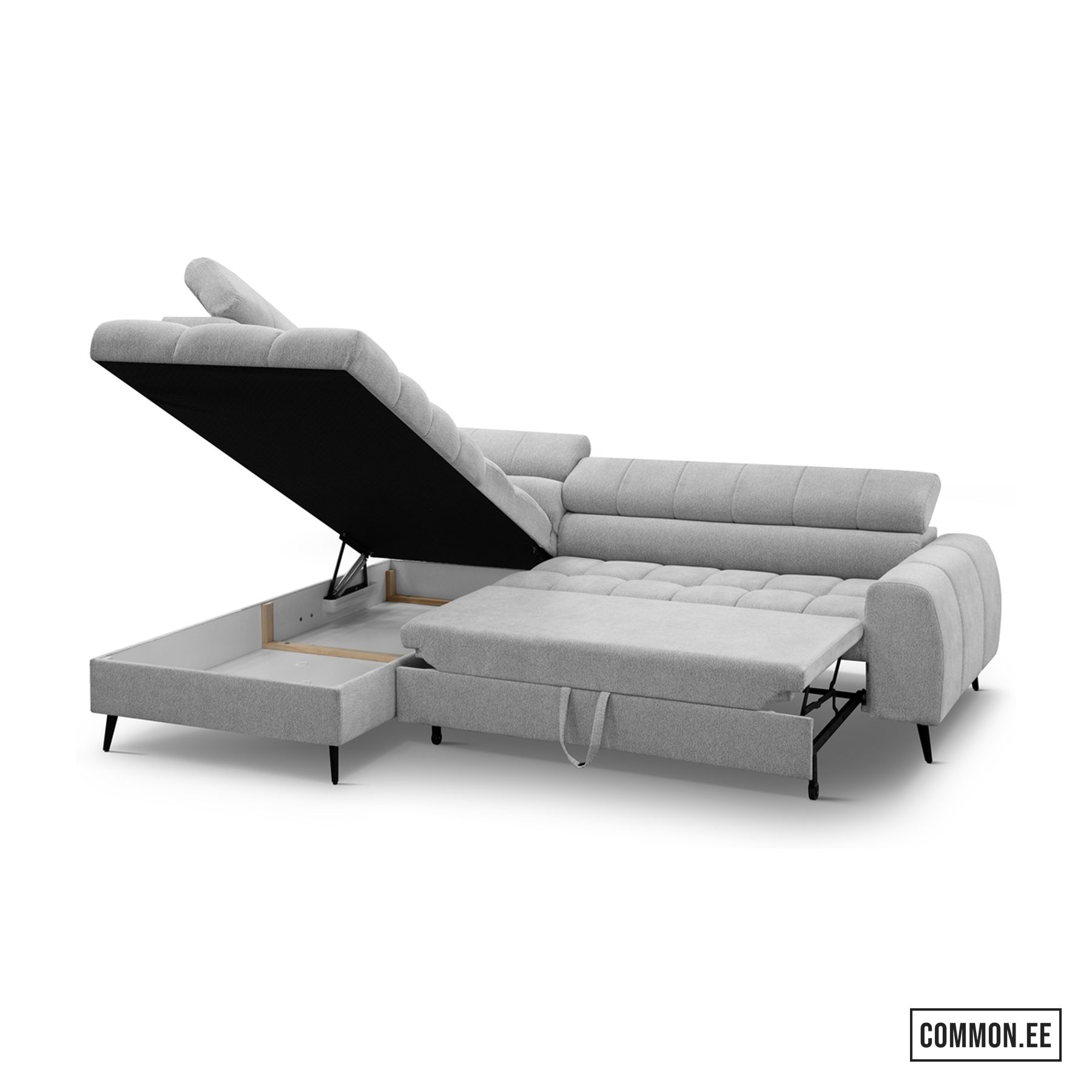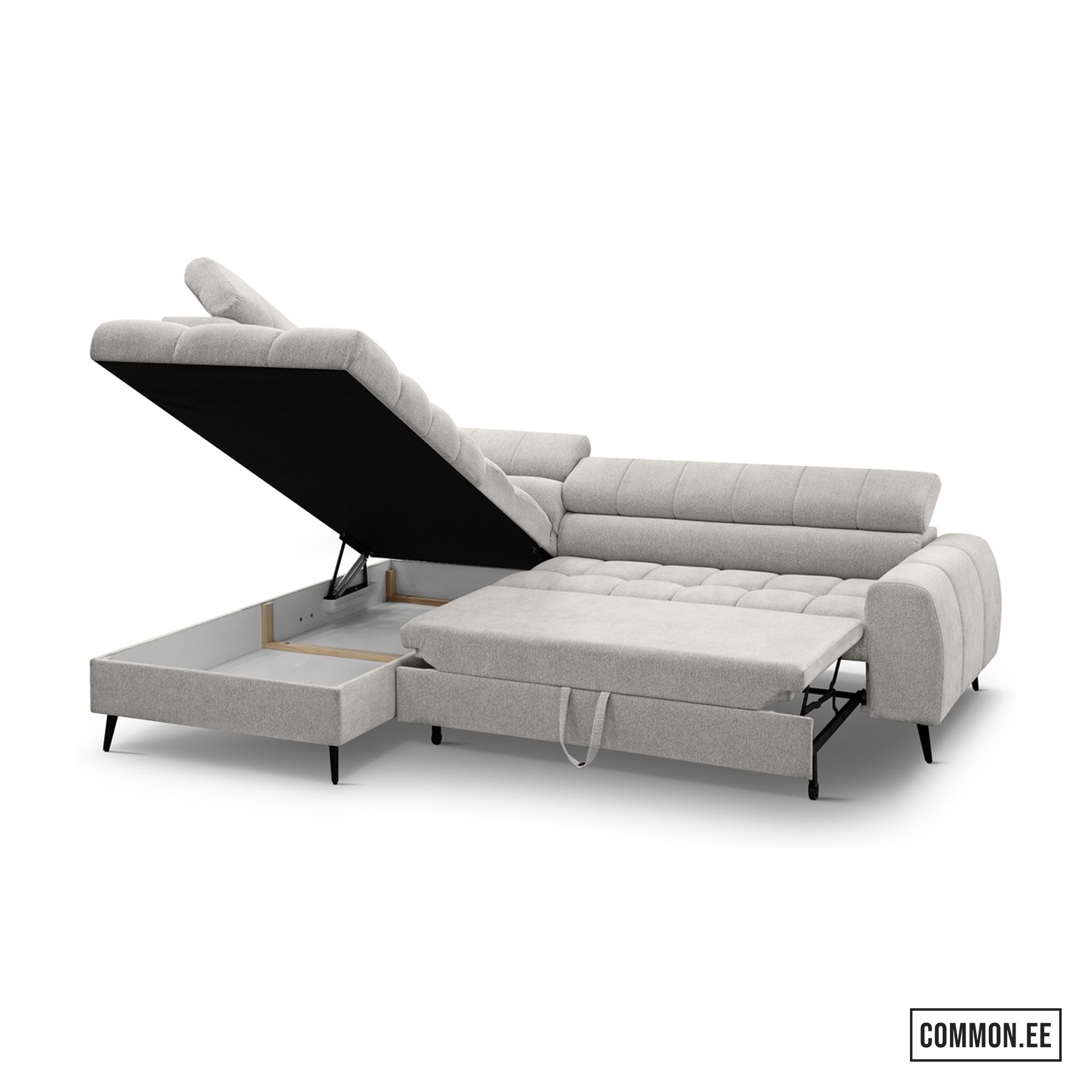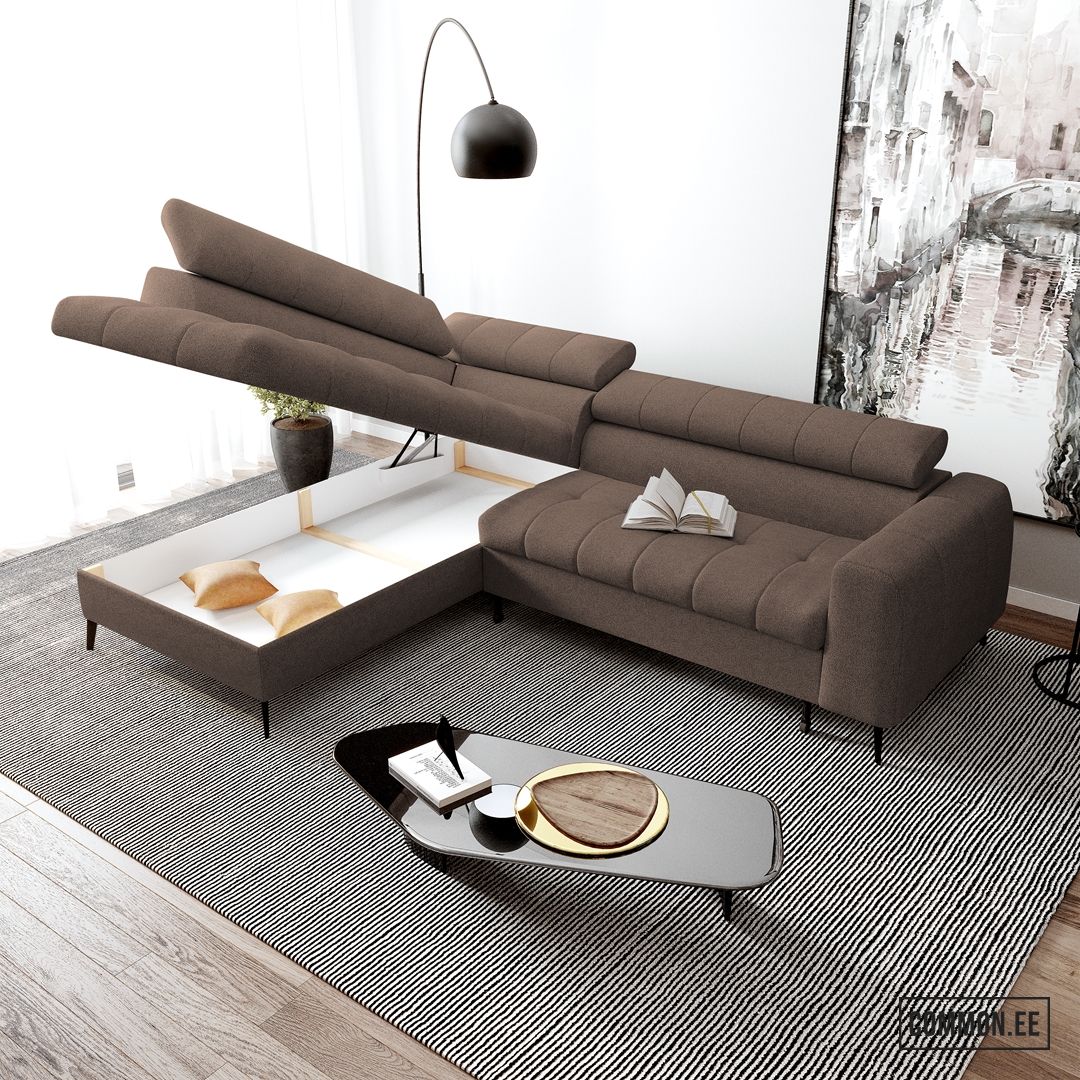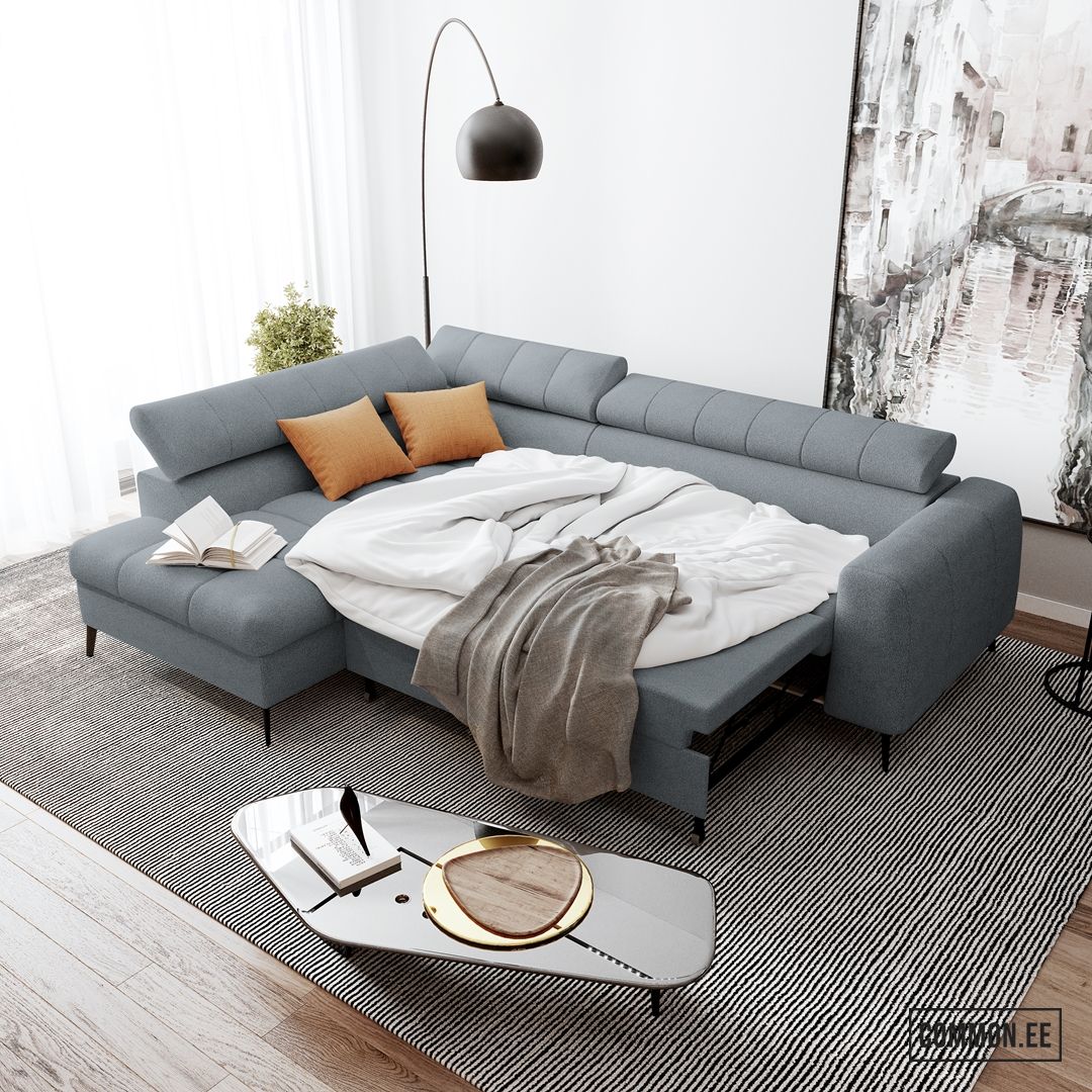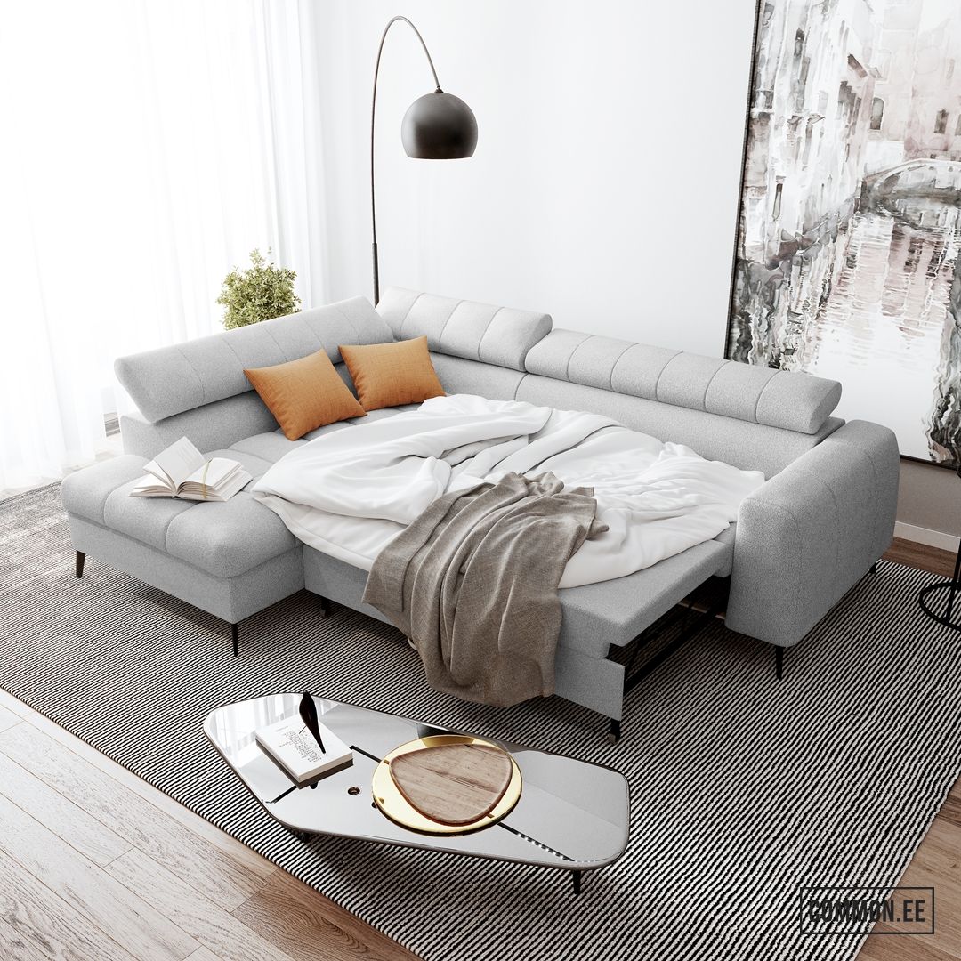 Integreeritud panipaik võimaldab mugavalt hoiustada voodipesu ja muud vajalikku, hoides elutoa alati korras.