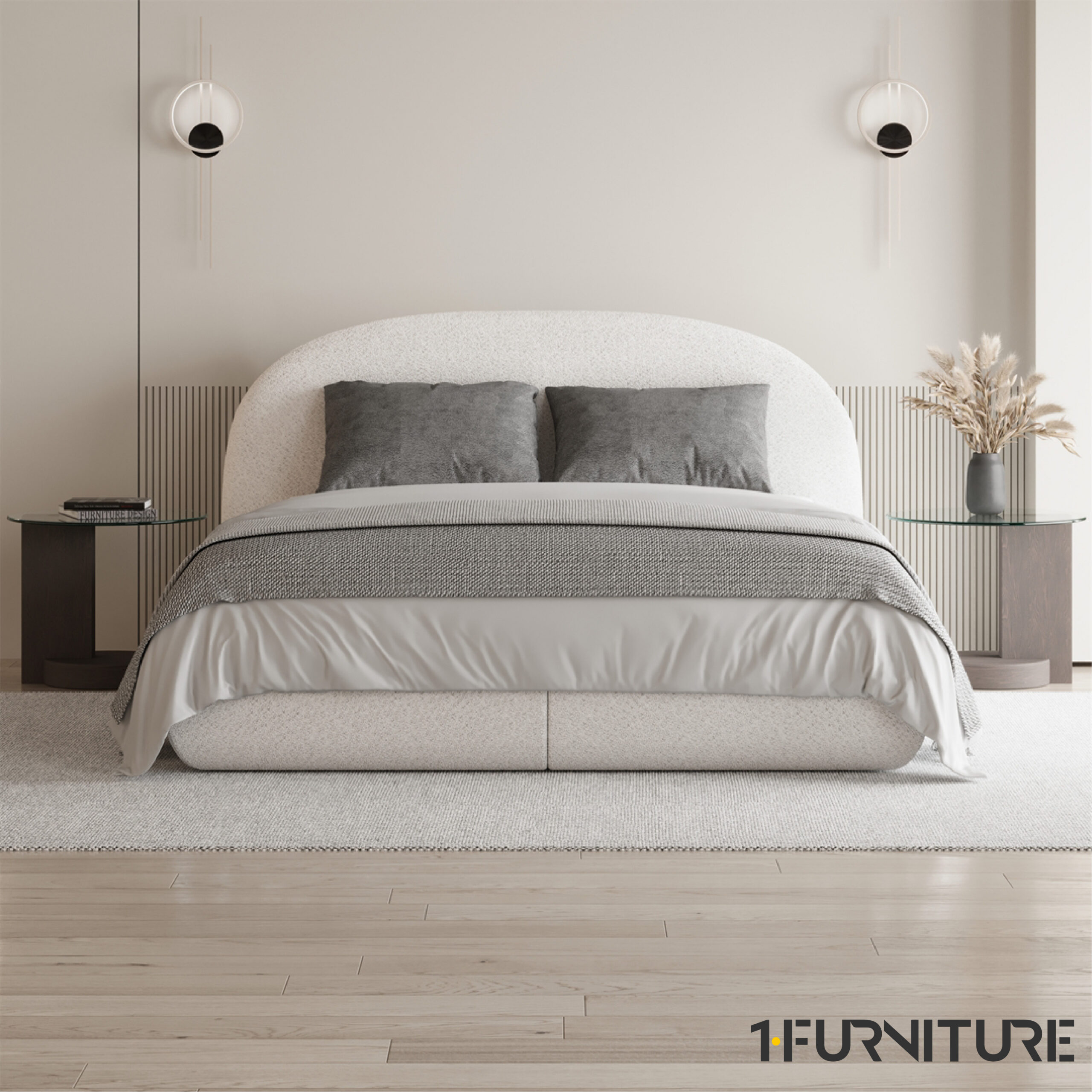 Stiilne disain – bouclé-kangas ja pehme, kumer peats loovad luksusliku ilme.
