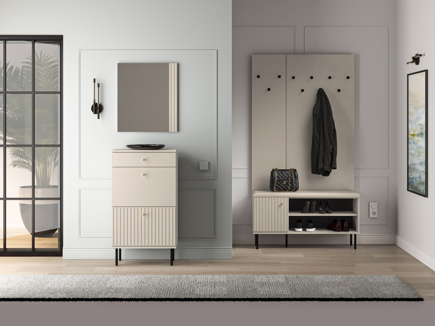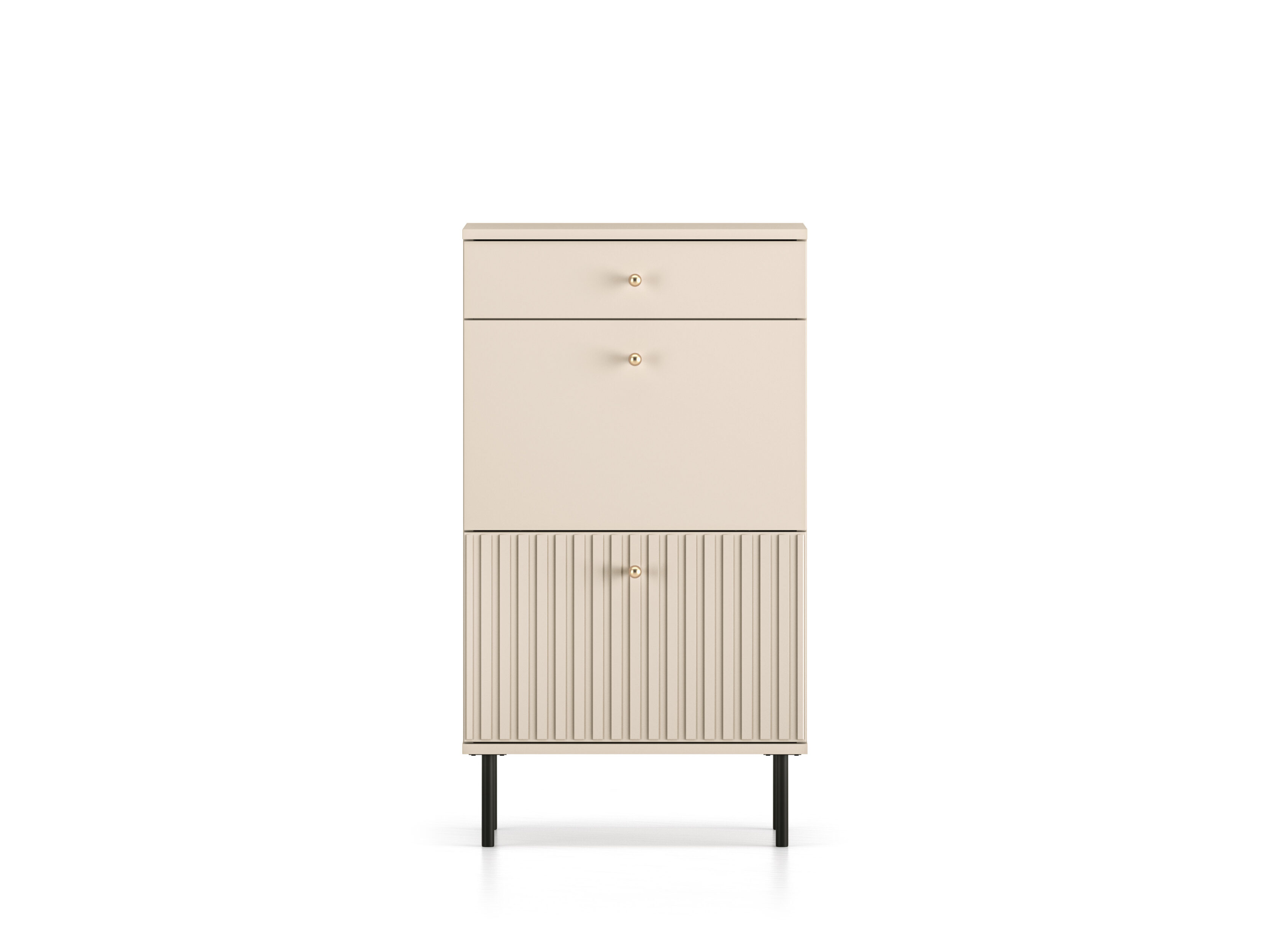 Kašmiiritooni viimistlus, soonitud MDF-esipaneelid, harjatud kuldset tooni nupud ning tagasihoidlikud mustad jalad iseloomustavad kogu Sofie kollektsiooni.