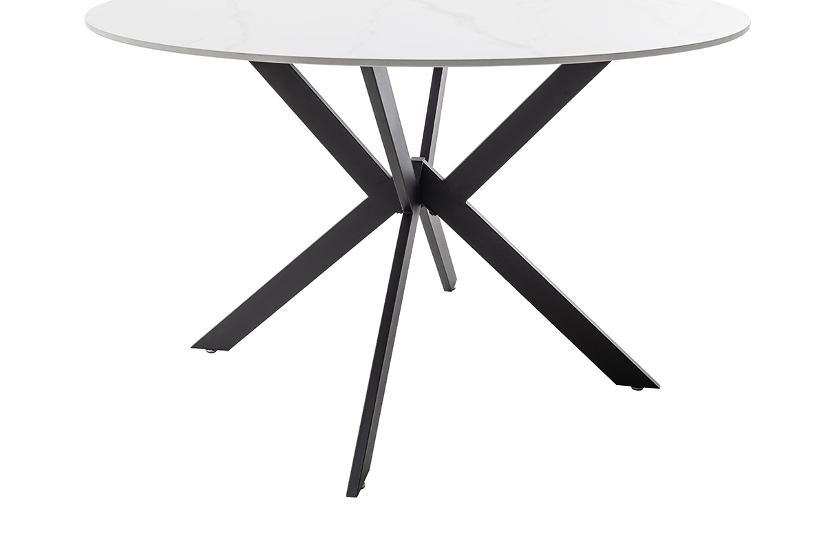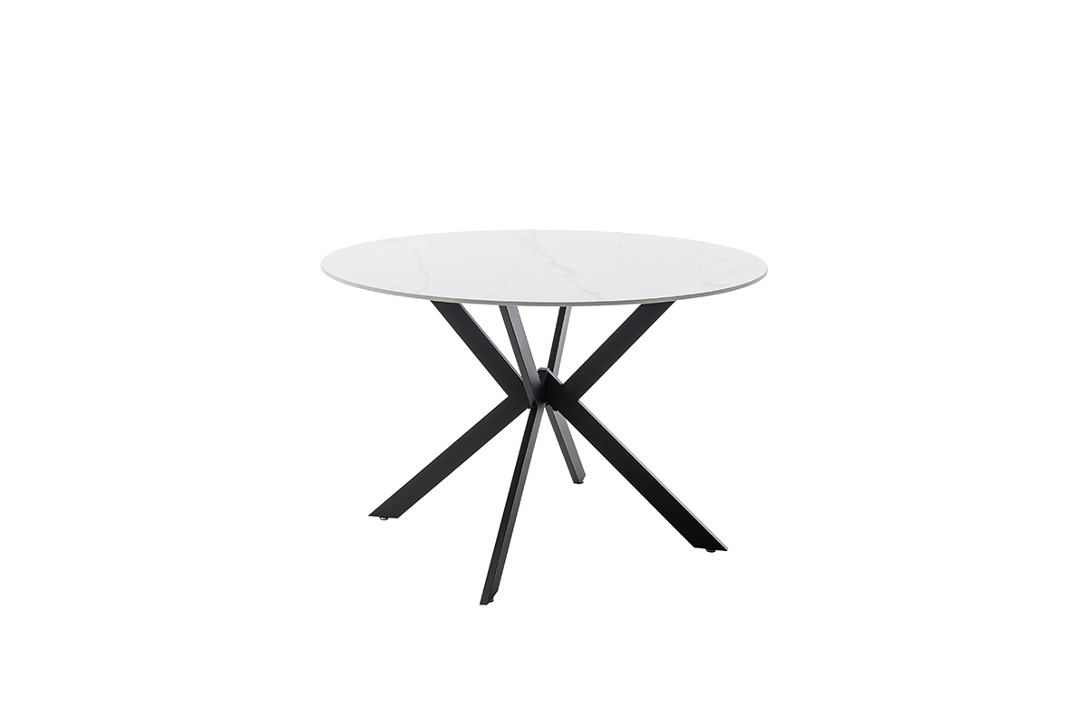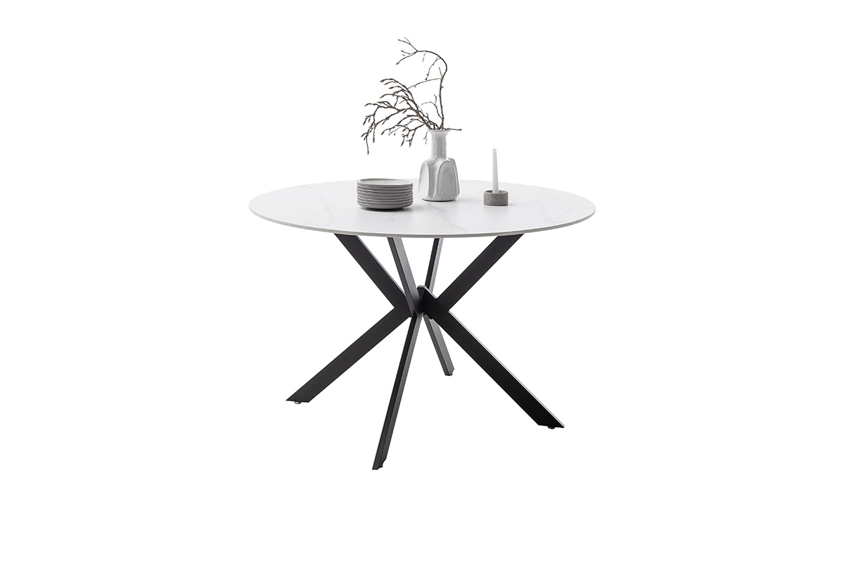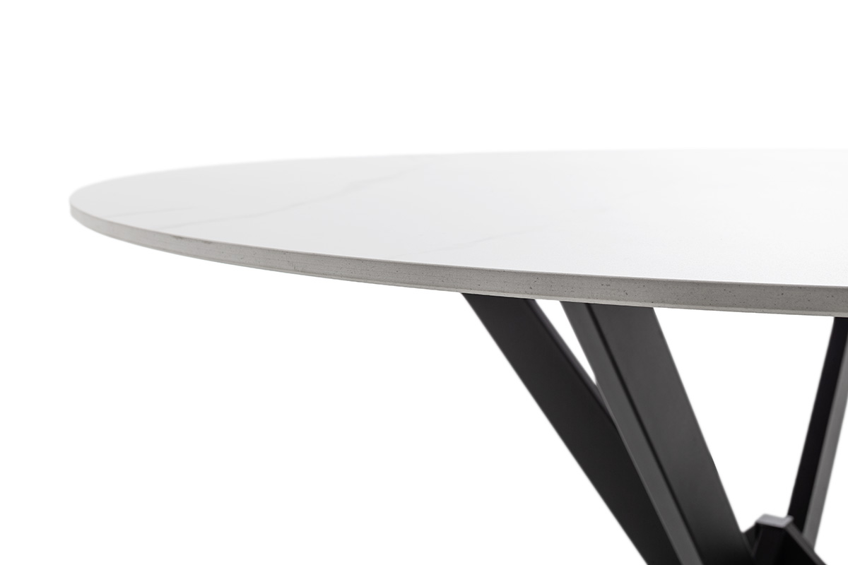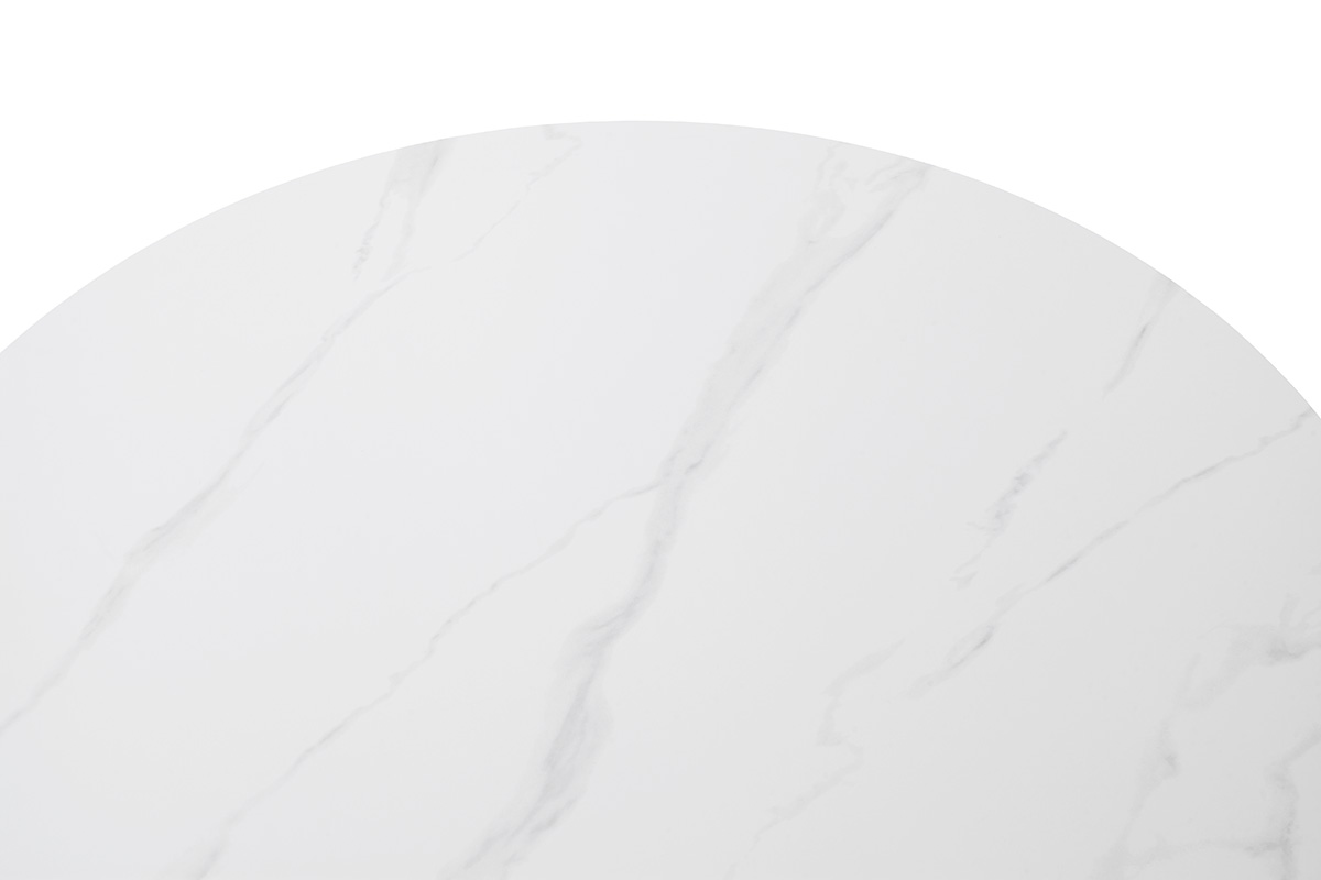 Laua ümmargune pealisplaat on valmistatud vastupidavast naturaalset kivi imiteerivast keraamilisest materjalist. 12 mm paksune pind on kuumakindel, kriimustuskindel ning lihtsasti hooldatav, pakkudes praktilist lahendust igapäevaseks kasutamiseks. Elegantne valge marmorimuster lisab lauale luksuslikku ilmet.