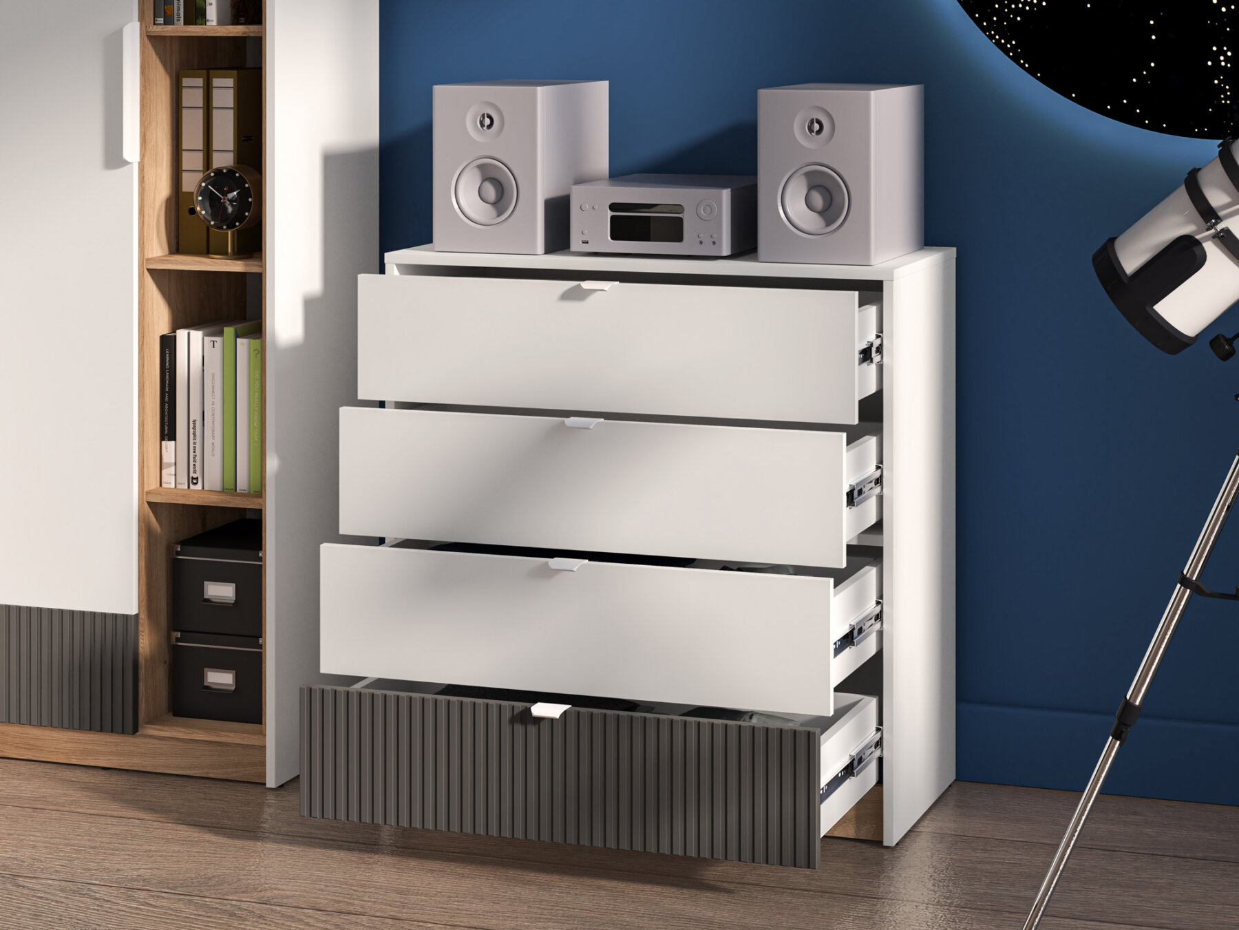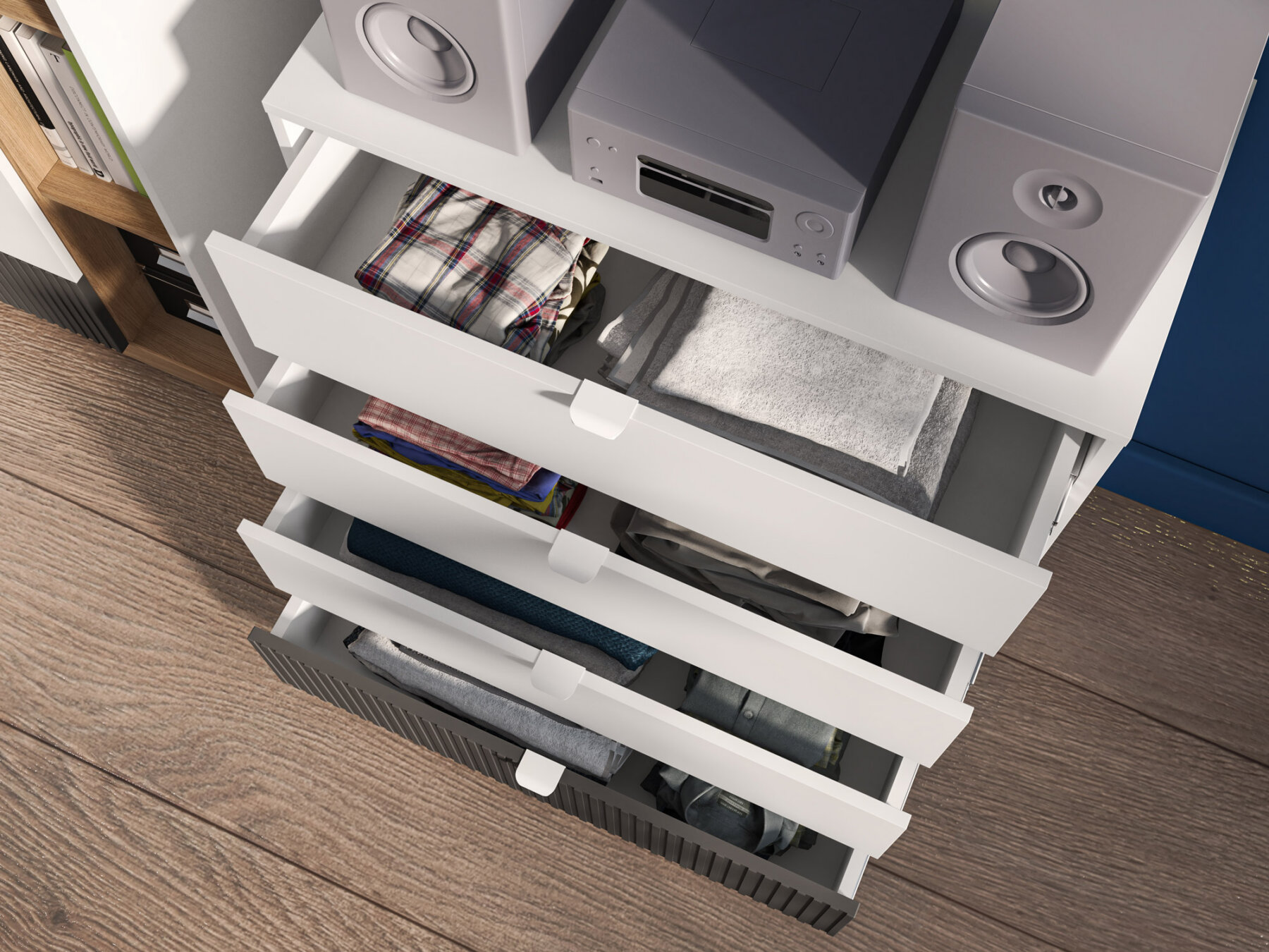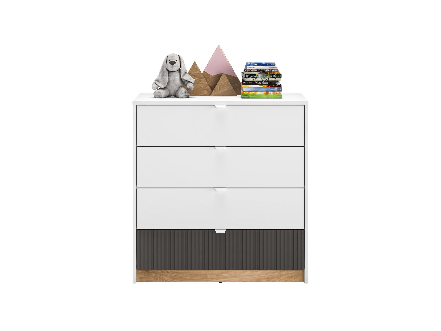 Kummutil on neli avarat sahtlit, kuhu saab mugavalt paigutada aluspesu, sokke või voodipesu. Suur pealispind sobib ideaalselt raamatute asetamiseks või lemmikmänguasjade väljapanekuks. Madalam ülemine serv ja tagumine lisariba aitavad vältida esemete maha kukkumist – nii ei satu ükski mänguasi mööbli taha.