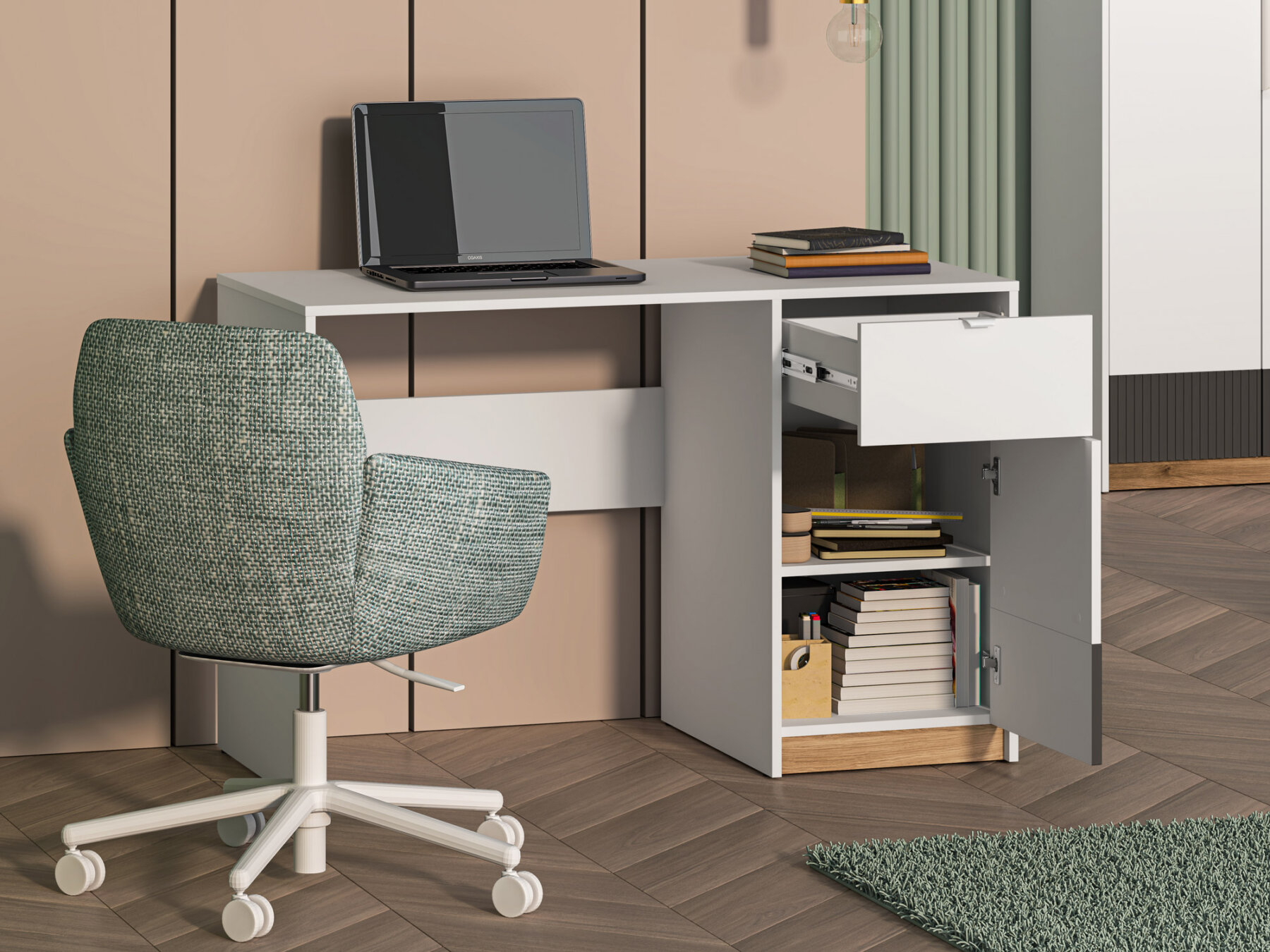 Konstruktsioon on varustatud praktilise täielikult väljatõmmatava sahtliga, mis muudab koolitarvete kättesaamise lihtsaks.