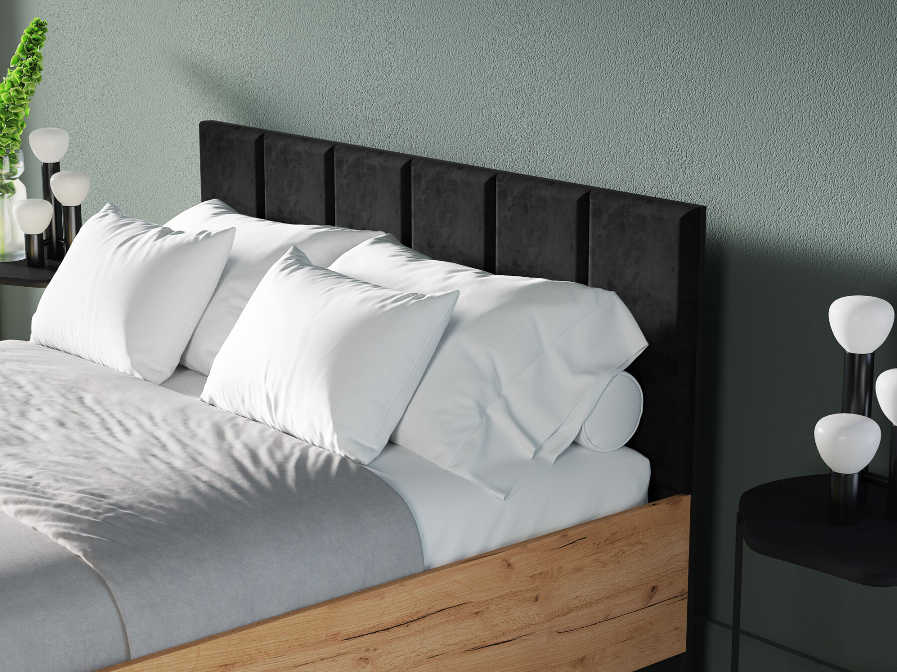 Polsterdatud peats lisab interjöörile elegantsi ning must sametkangas loob luksusliku ja stiilse üldmulje.