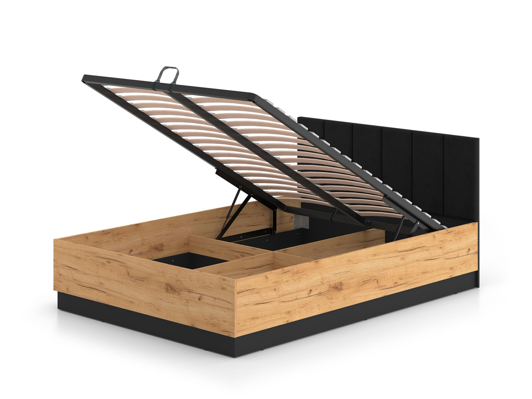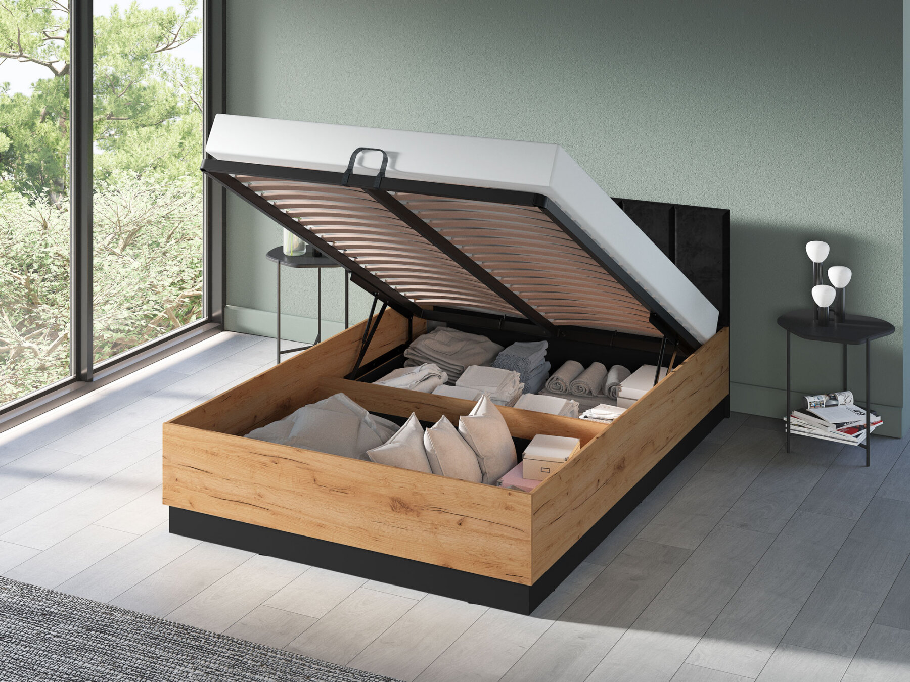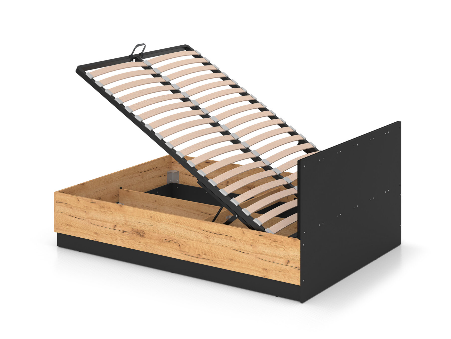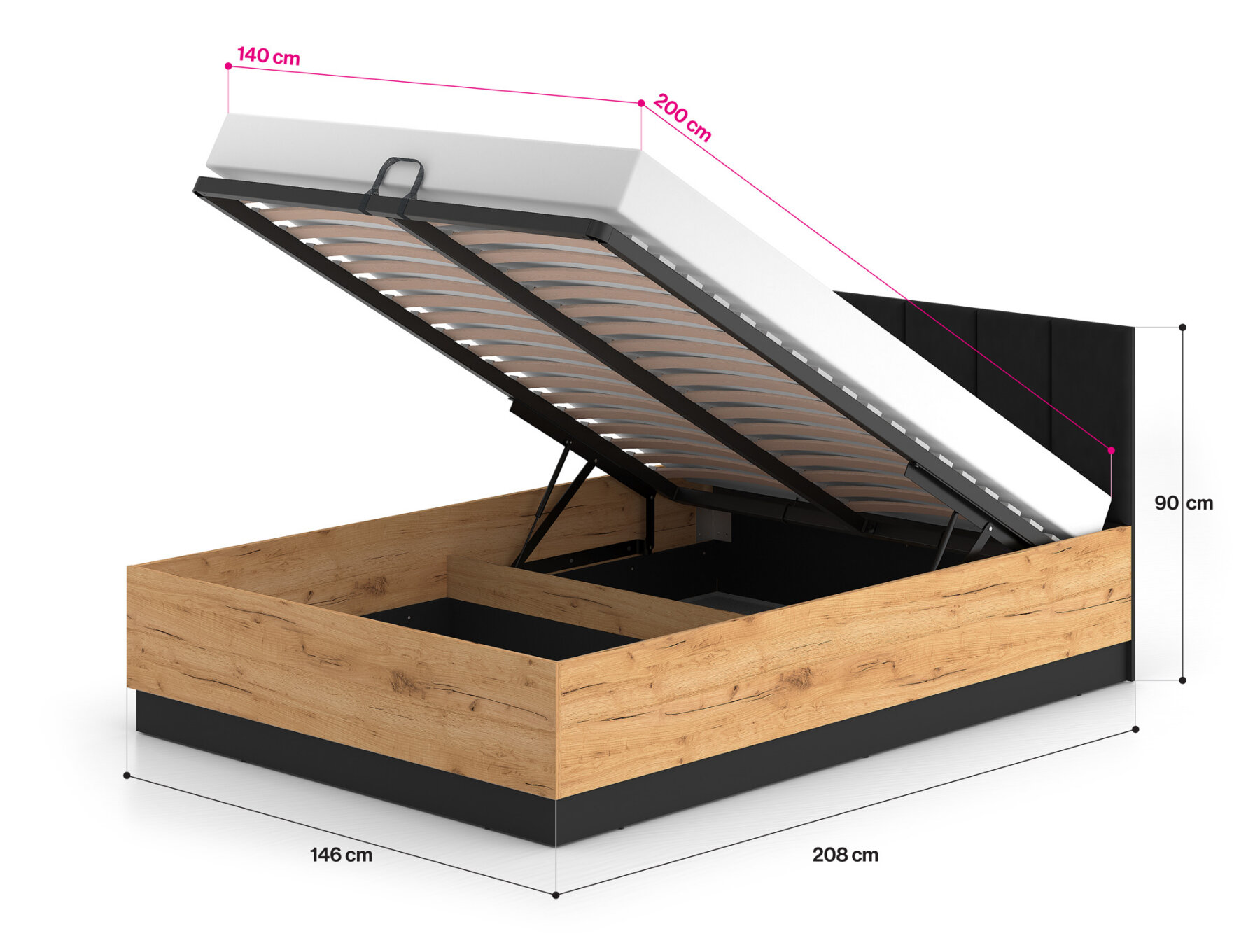 Gaasitõstukitega mehhanism võimaldab kogu raami koos madratsiga hõlpsasti üles tõsta, pakkudes lihtsat ligipääsu mahukale pesukastile.