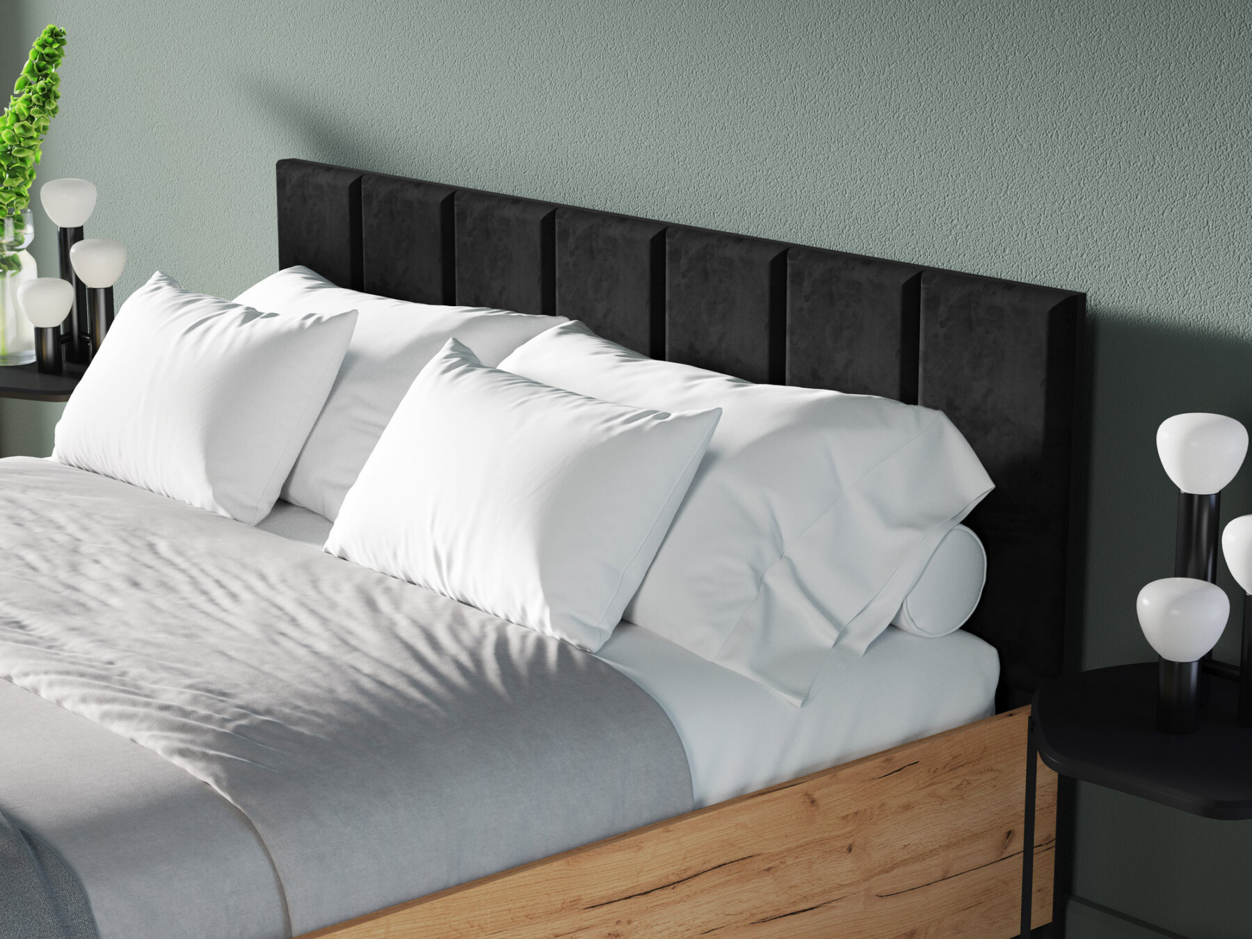 Polsterdatud peats lisab interjöörile elegantsi ning must sametkangas loob luksusliku ja stiilse üldmulje.