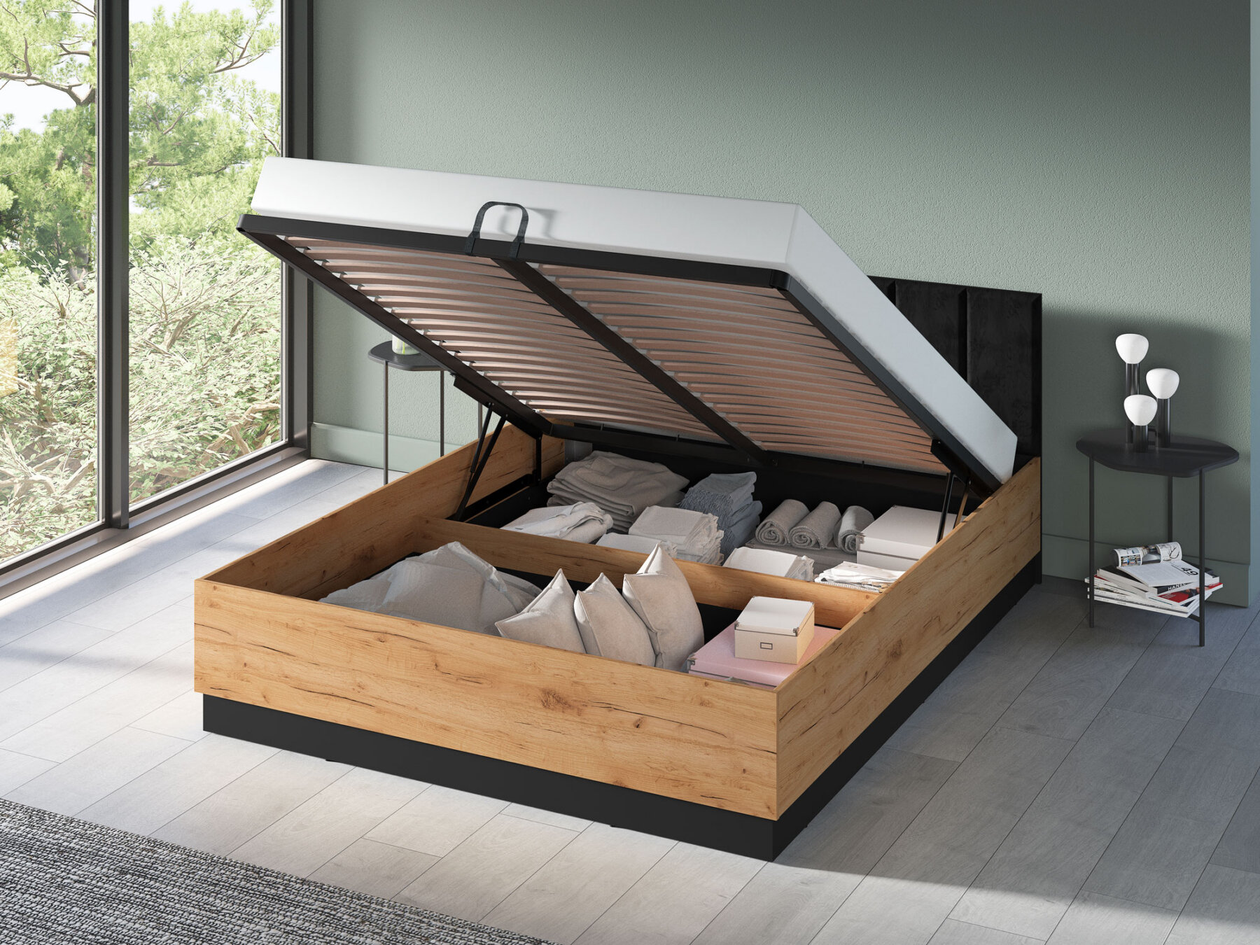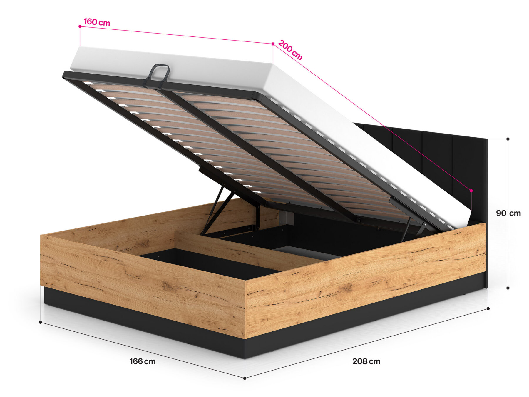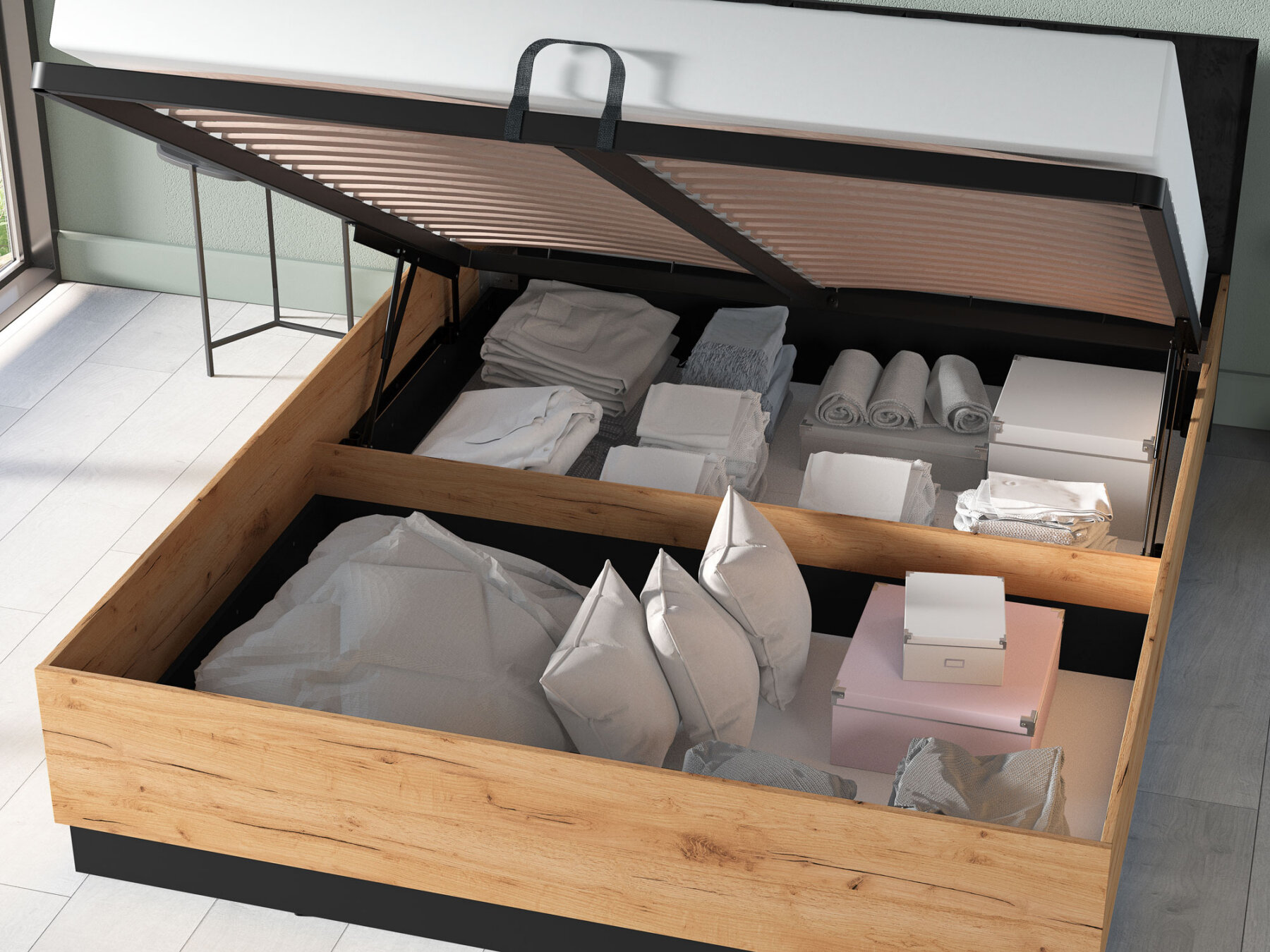 Gaasitõstukitega mehhanism võimaldab kogu raami koos madratsiga hõlpsasti üles tõsta, pakkudes mugavat ligipääsu mahukale pesukastile.