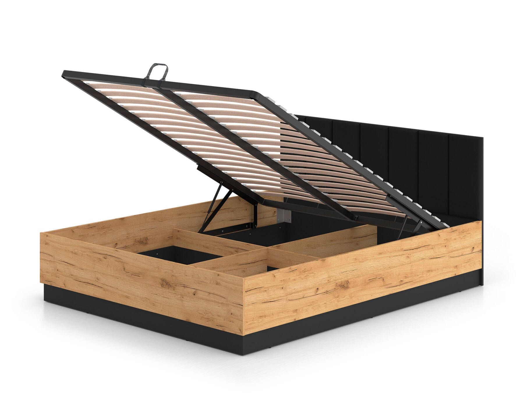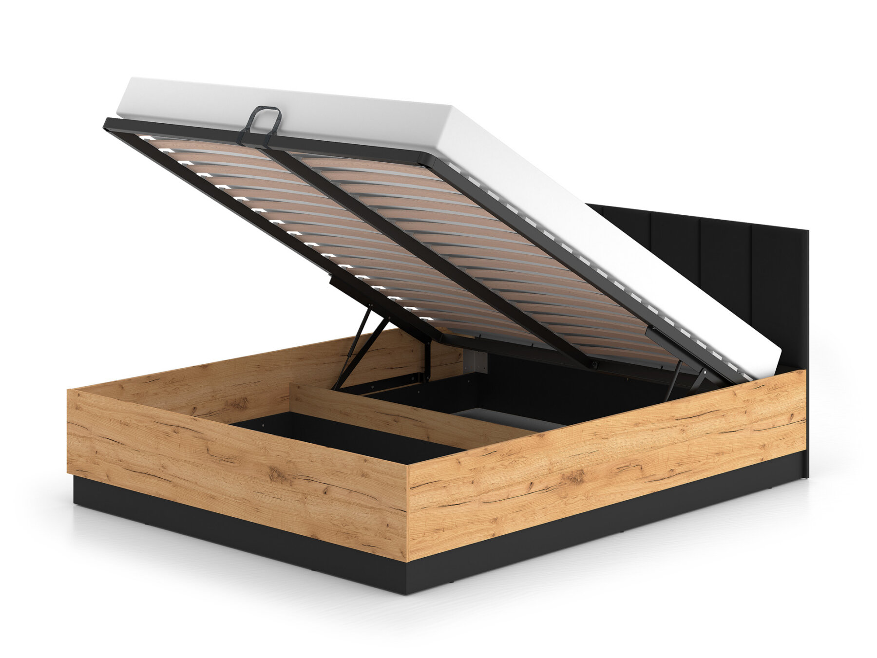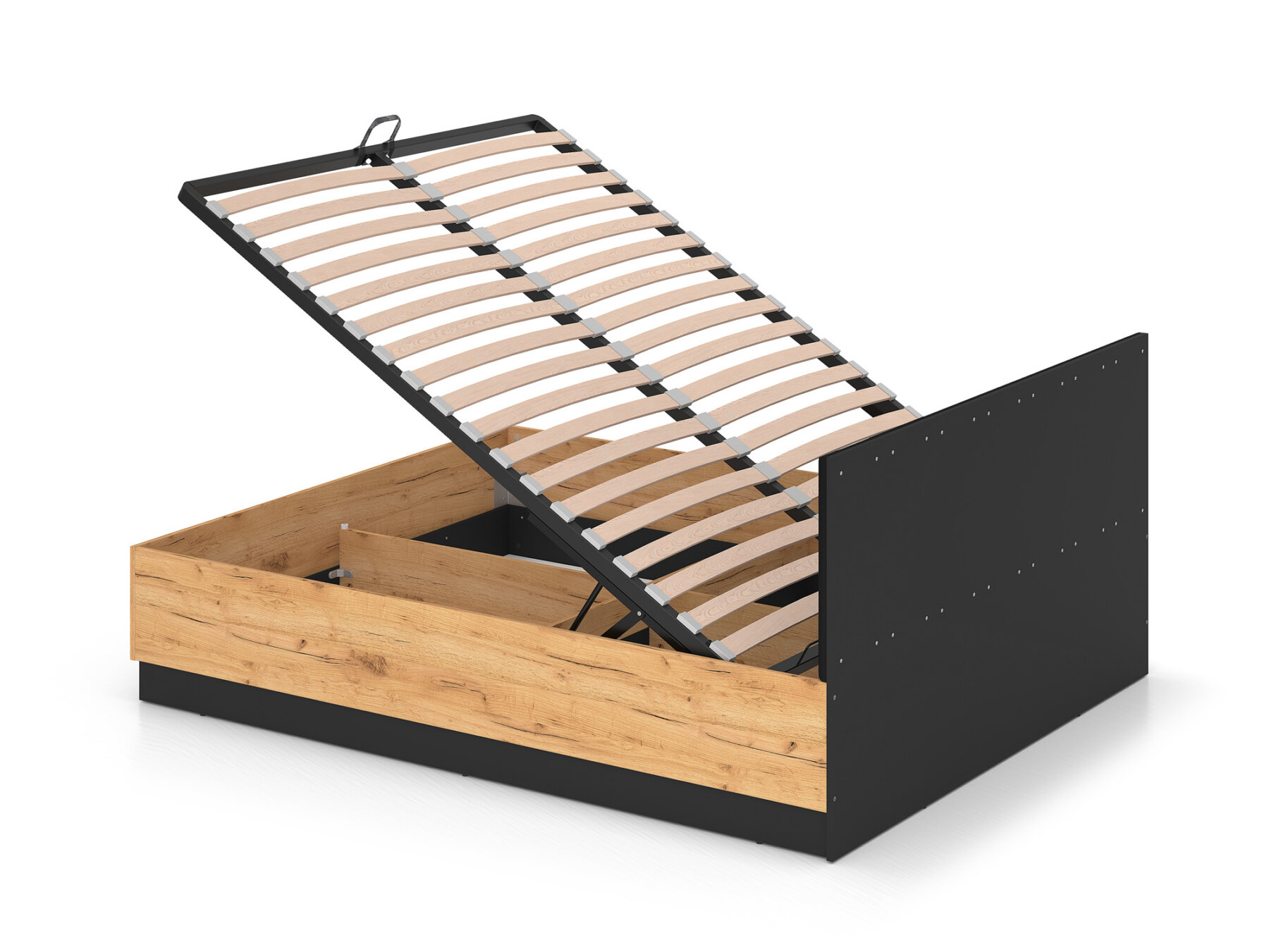 Gaasitõstukitega mehhanism võimaldab kogu raami koos madratsiga hõlpsasti üles tõsta, pakkudes mugavat ligipääsu mahukale pesukastile.
