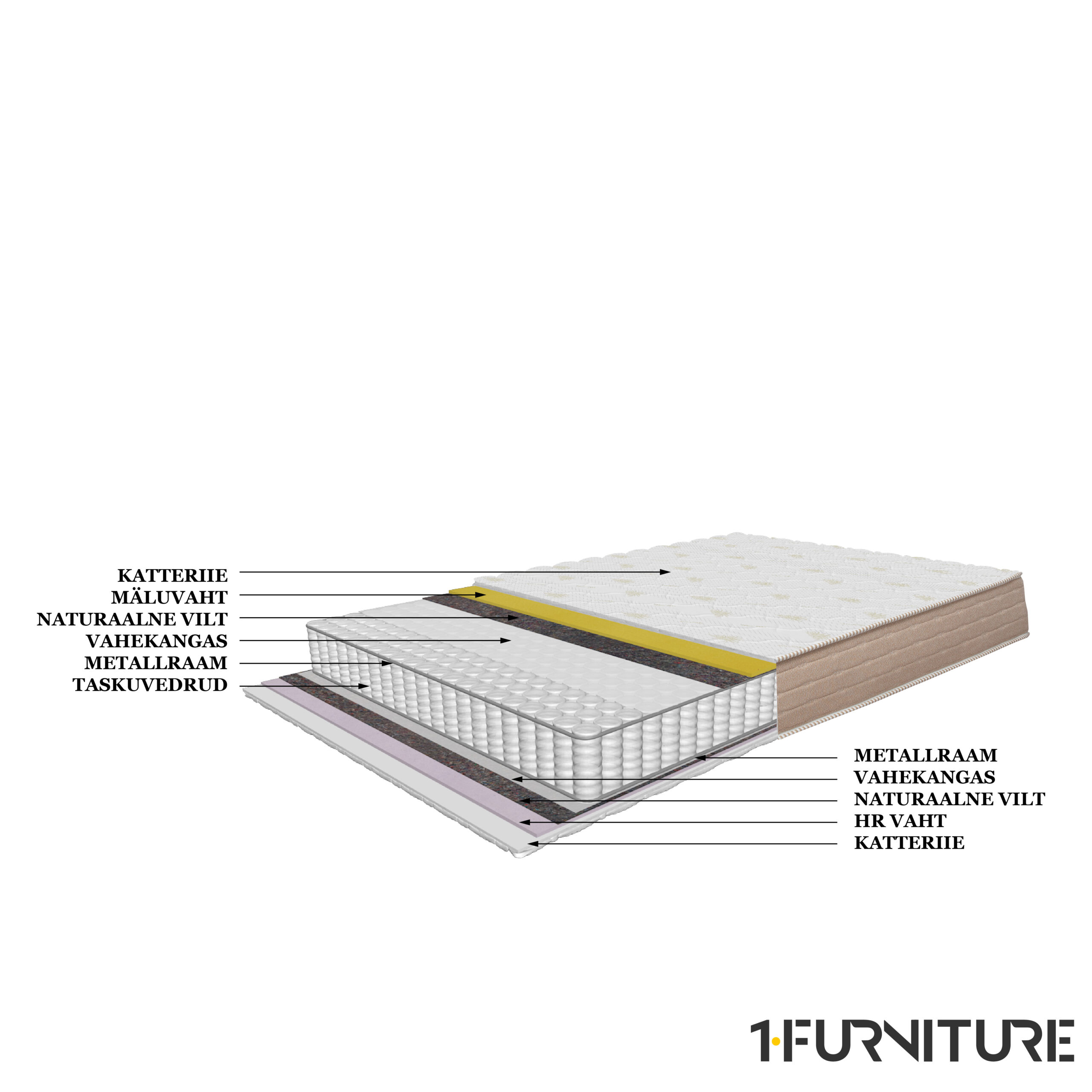 - Vedruplokk on tugevdatud metallraami ja vildikihiga, mis tagab selle, et madrats ei kaotaks oma kuju ning vormi.