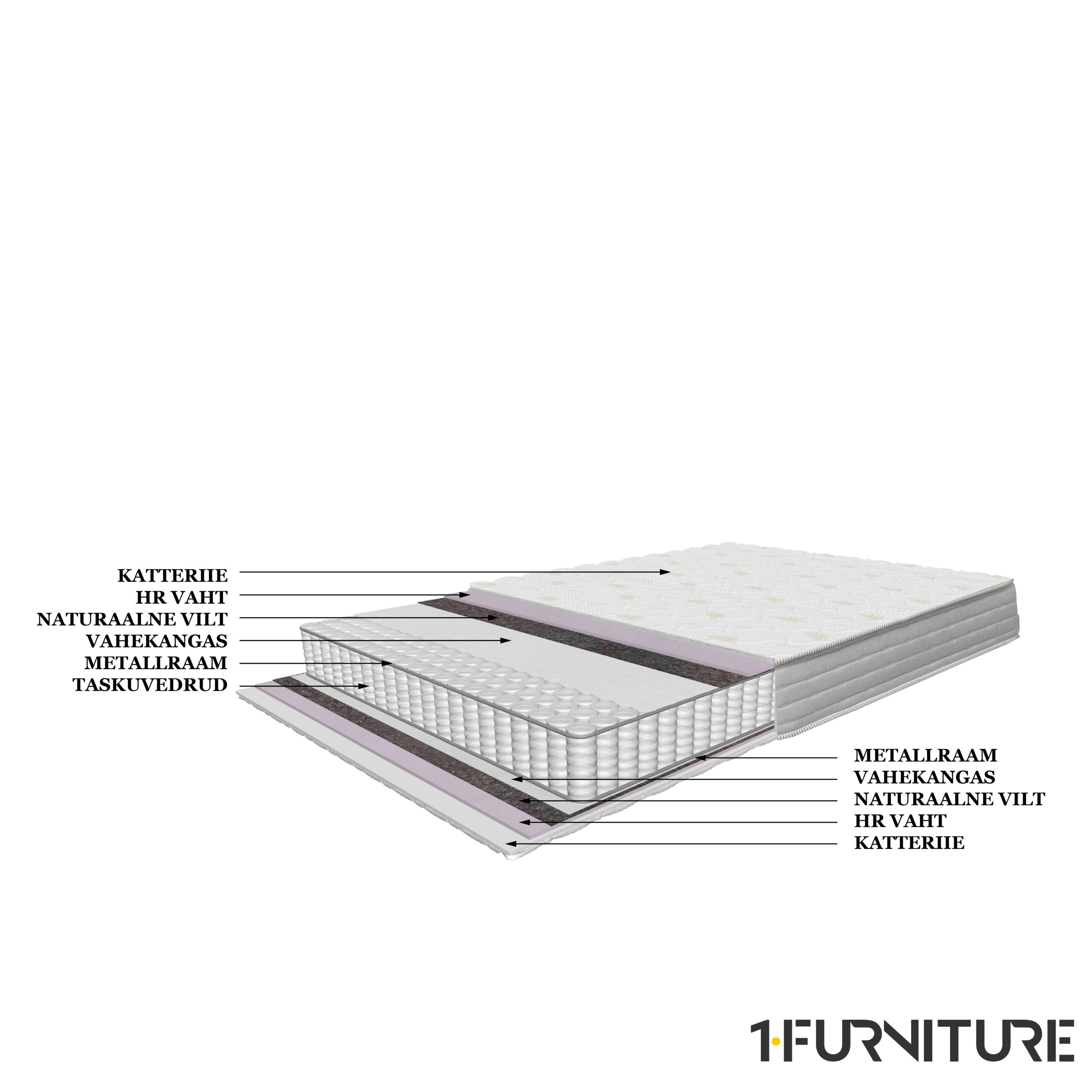- Vedruplokk on tugevdatud metallraami ja vildikihiga, mis tagab selle, et madrats ei kaotaks oma kuju ning vormi.