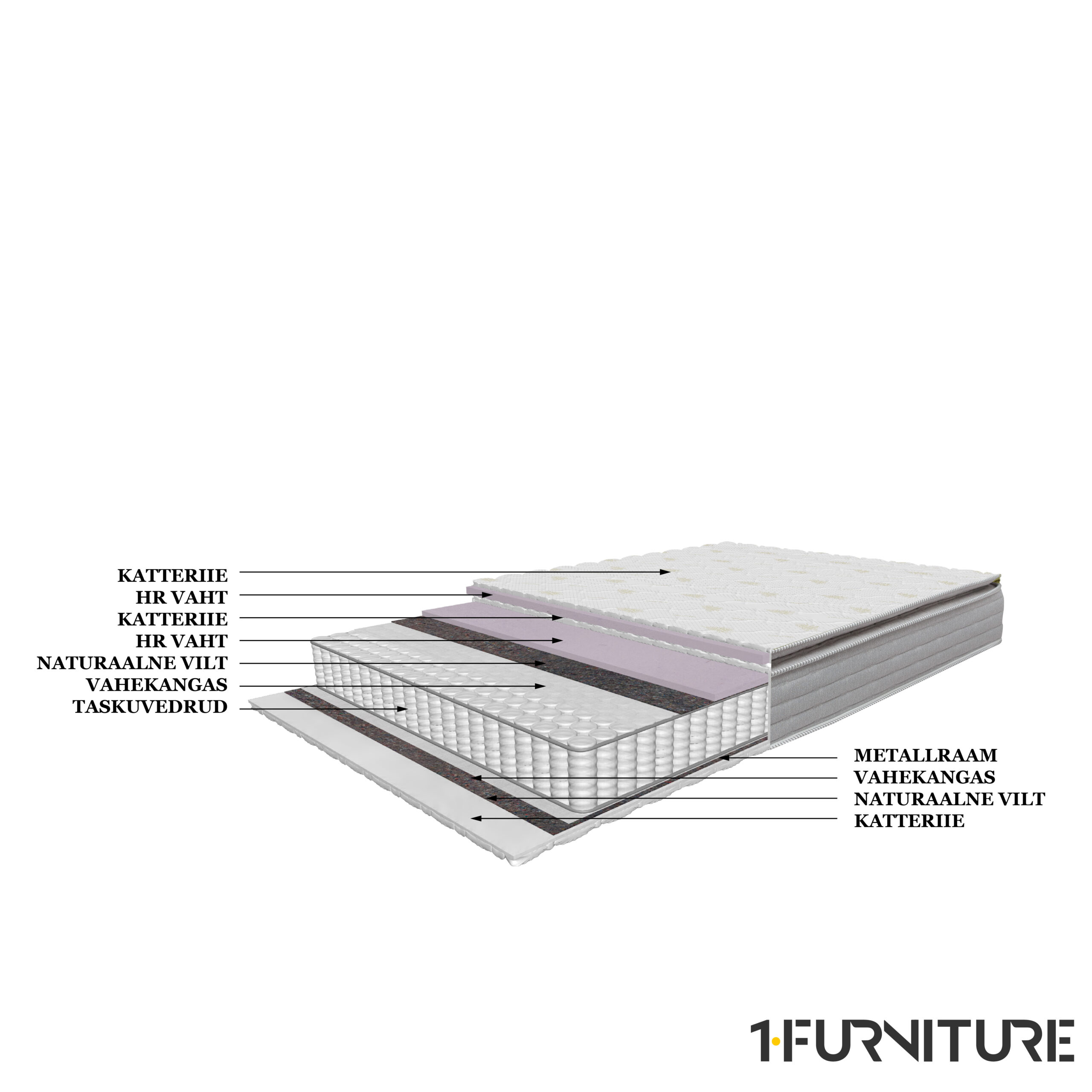 • Vedruplokk on tugevdatud metallraami ja vildikihiga, mis tagab selle, et madrats ei kaotaks oma kuju ning vormi.