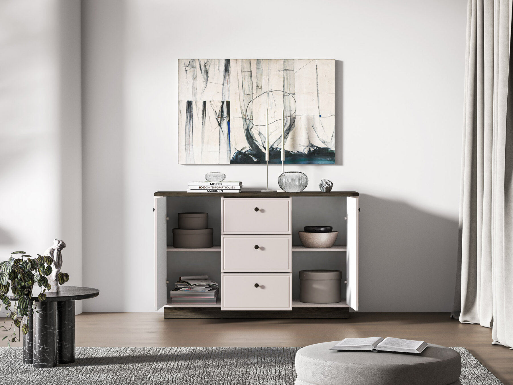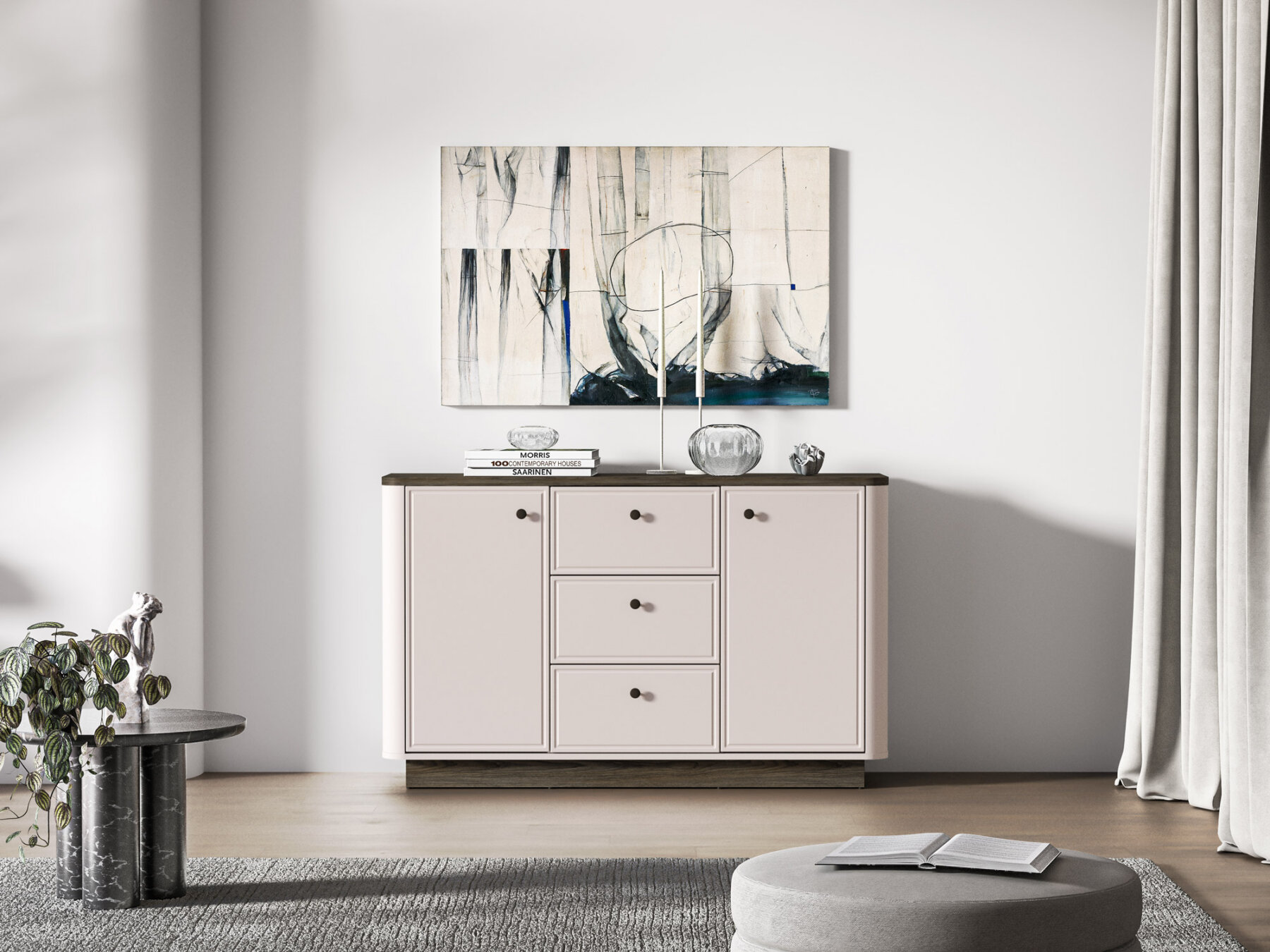 Kummut sobib suurepäraselt nii elutuppa kui ka magamistuppa. Lai pealispind on ideaalne elegantsete vaaside, reisilt toodud suveniiride või lemmikaksessuaaride väljapanekuks.