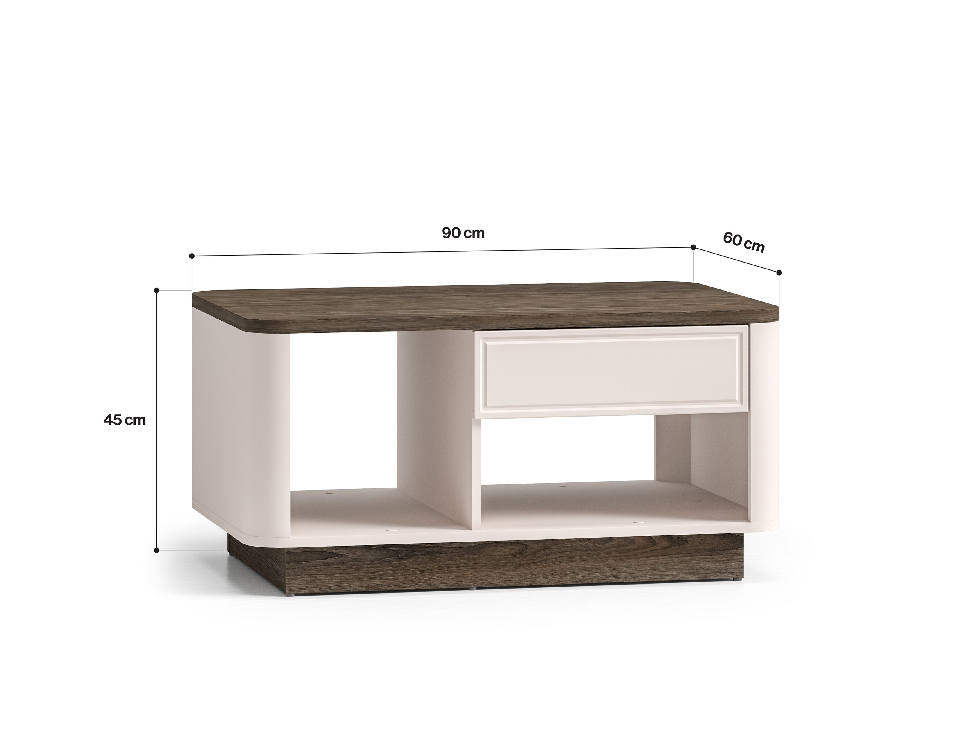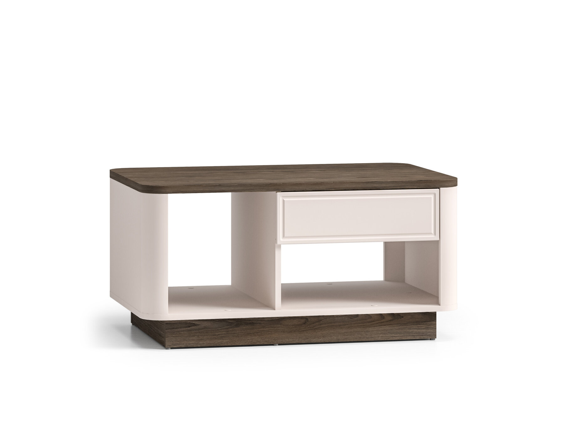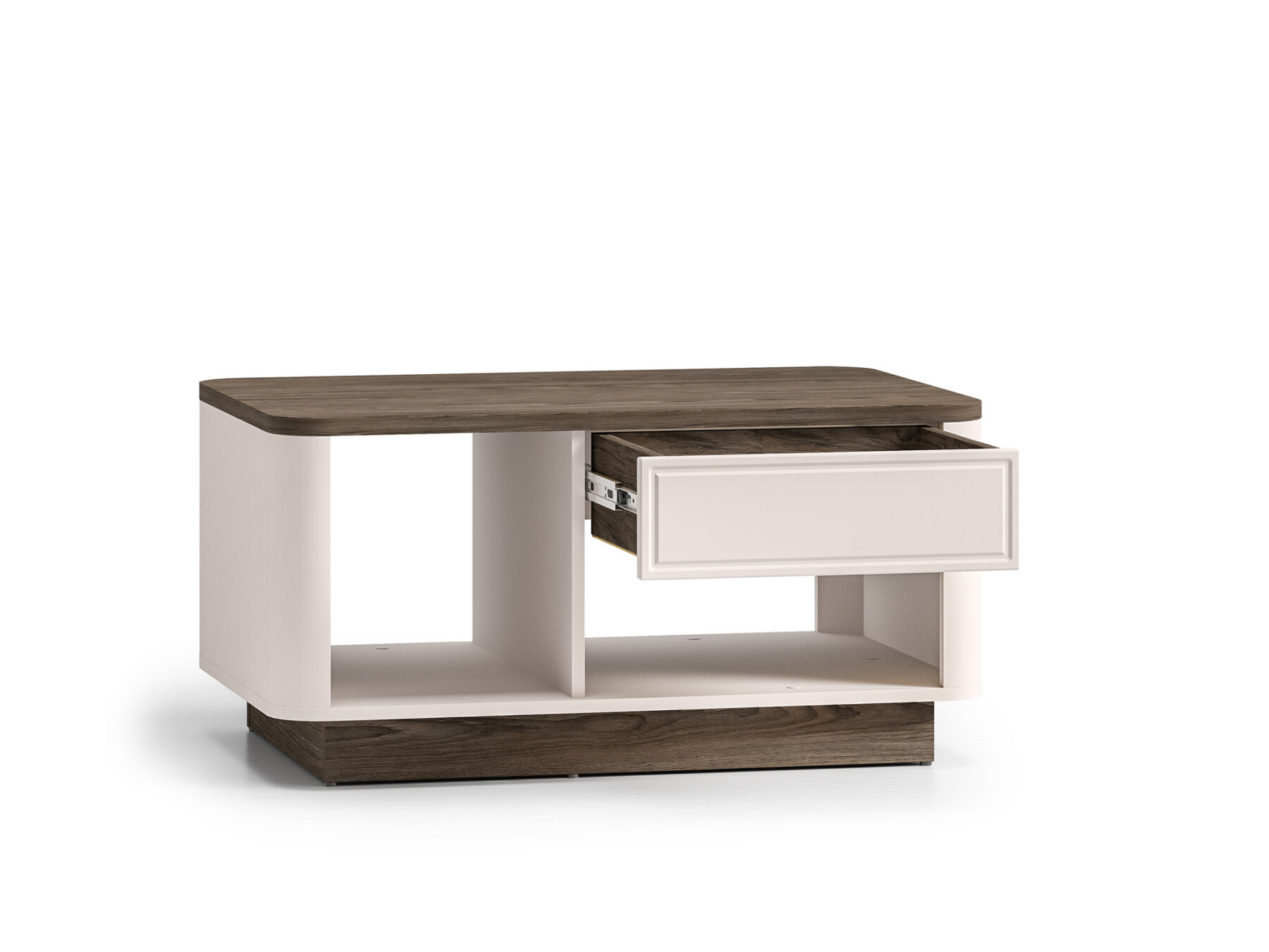 Lauaplaadi all asuvad kaks avarat avatud riiulit, mis sobivad suurepäraselt raamatute või ajakirjade hoiustamiseks. Praktiline sahtel võimaldab peita teleri puldid või muud väiksemad esemed.