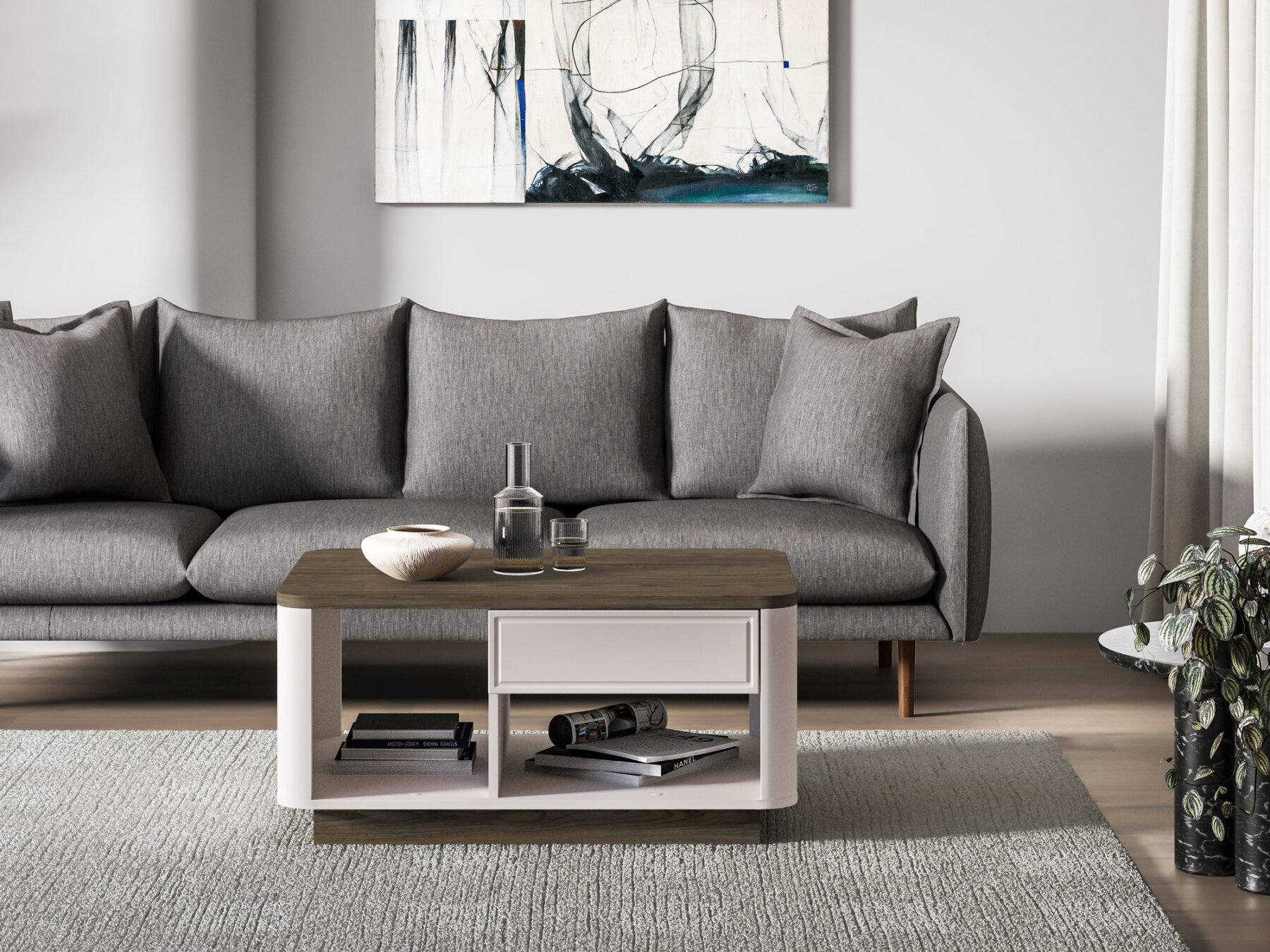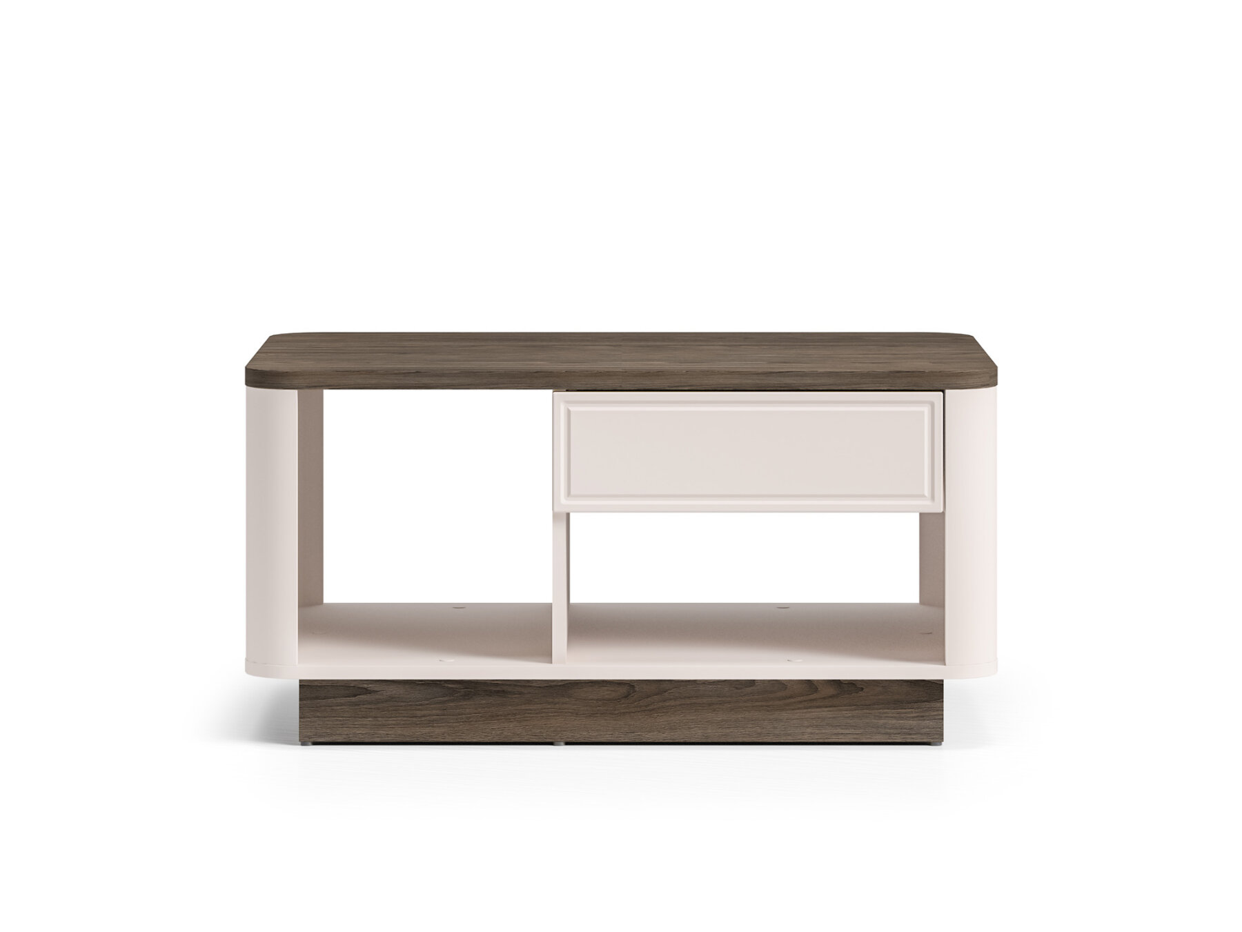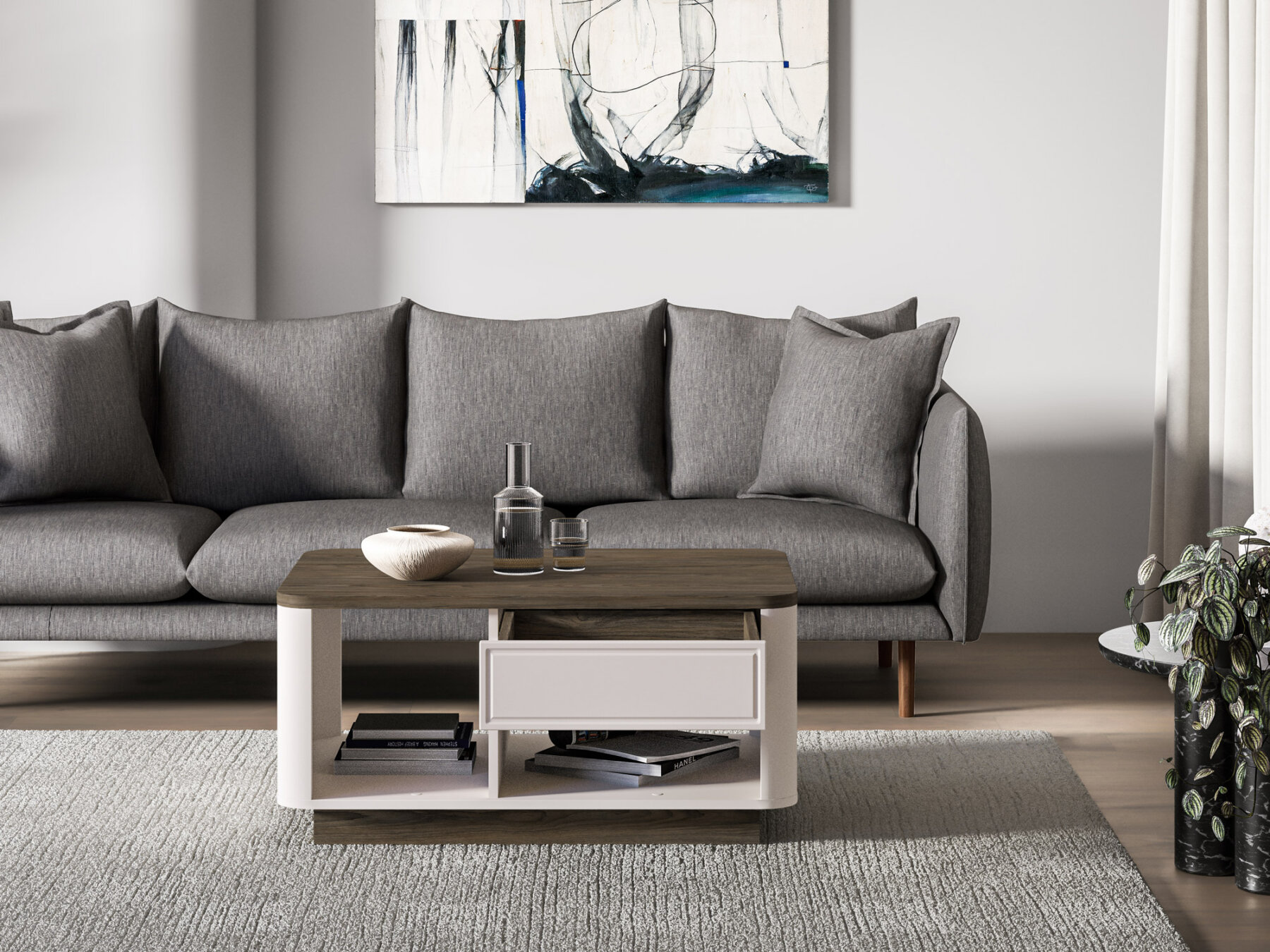 Lauaplaadi all asuvad kaks avarat avatud riiulit, mis sobivad suurepäraselt raamatute või ajakirjade hoiustamiseks. Praktiline sahtel võimaldab peita teleri puldid või muud väiksemad esemed.