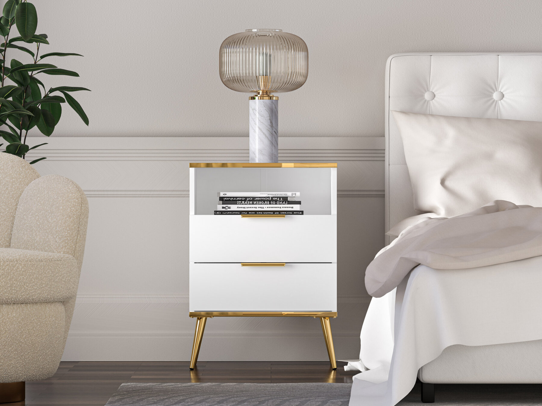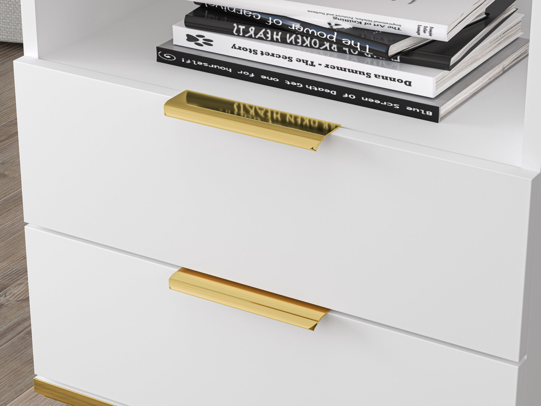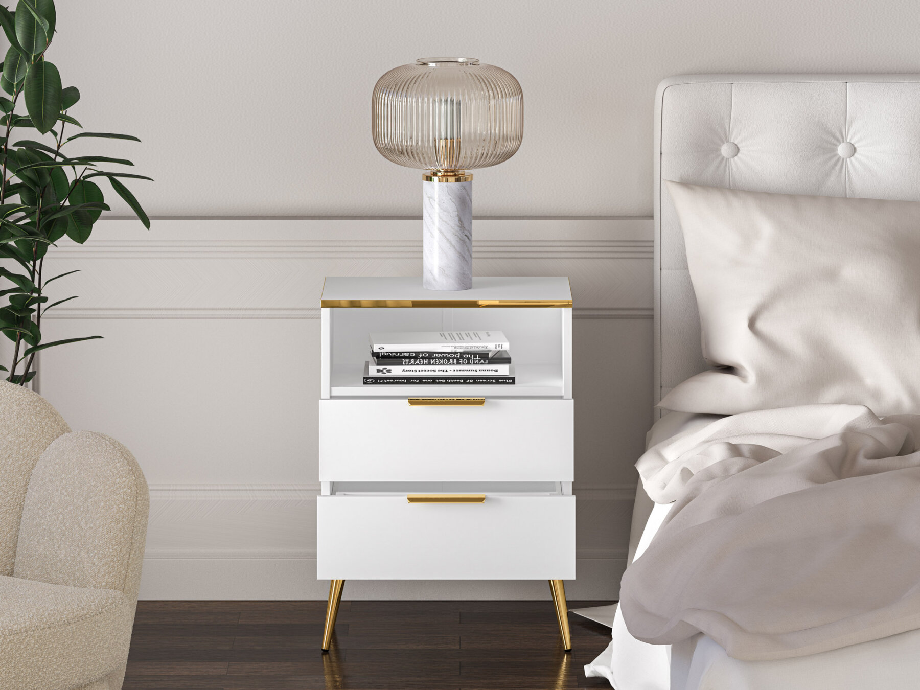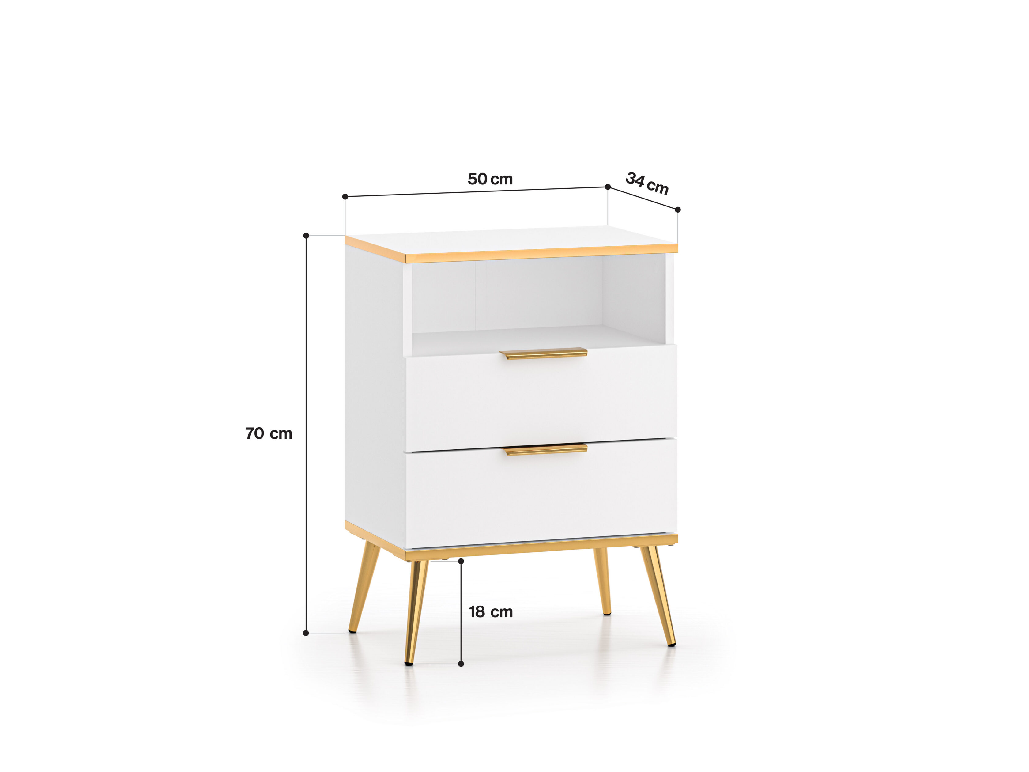 Valge viimistlus, metalljalad ja -käepidemed ning kuldset tooni pealispind on Vitero kollektsiooni iseloomulikud detailid.