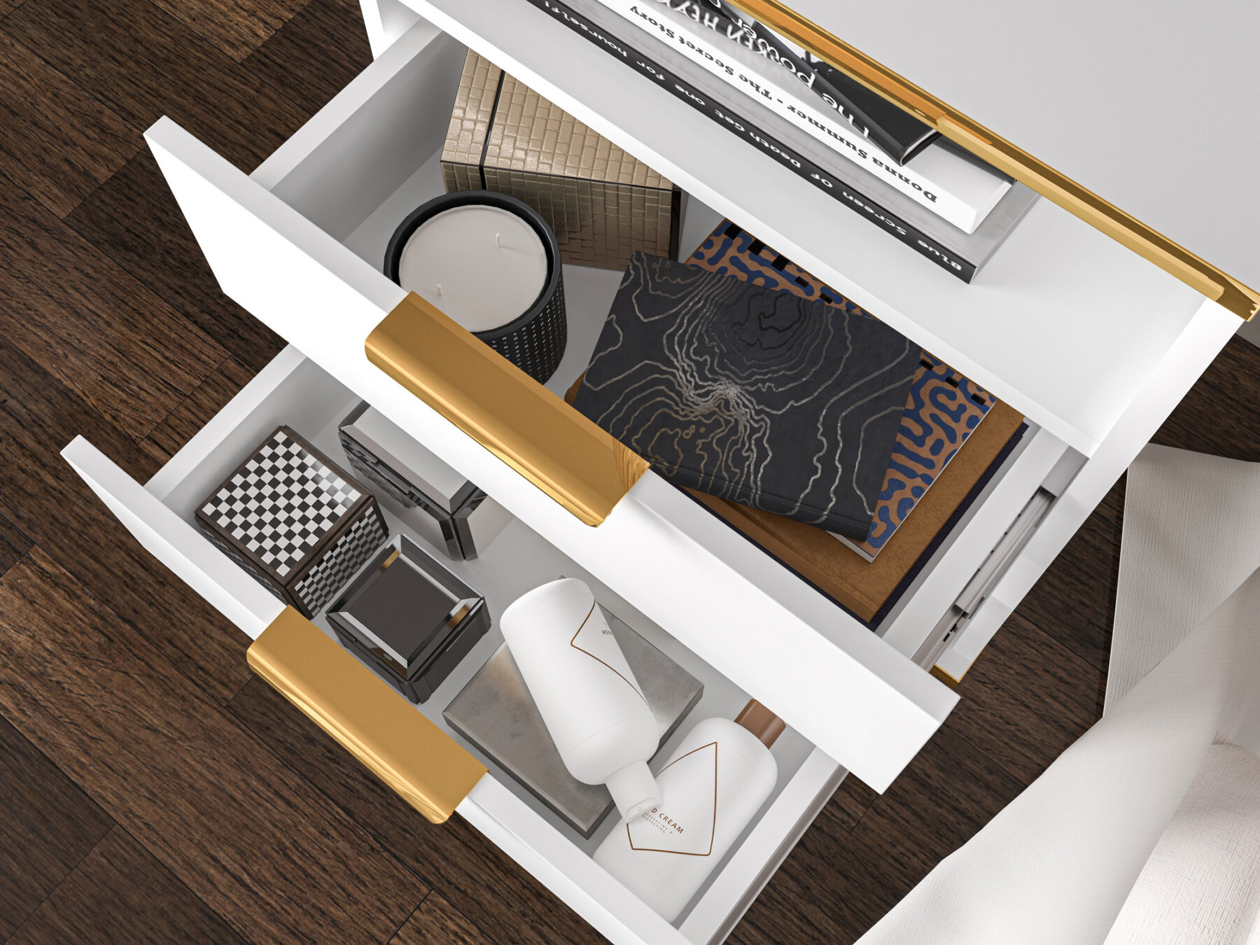 Täiendava hoiuruumi pakuvad kaks täielikult väljatõmmatavat sahtlit, kuhu saad paigutada küünlaid, kosmeetikat või muid voodi kõrval vajalikke esemeid.