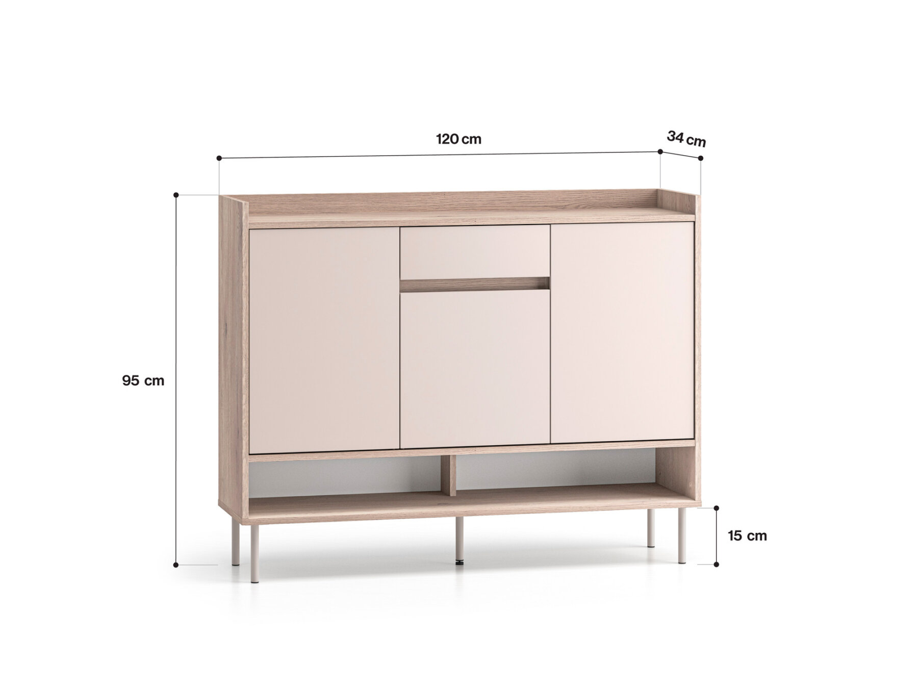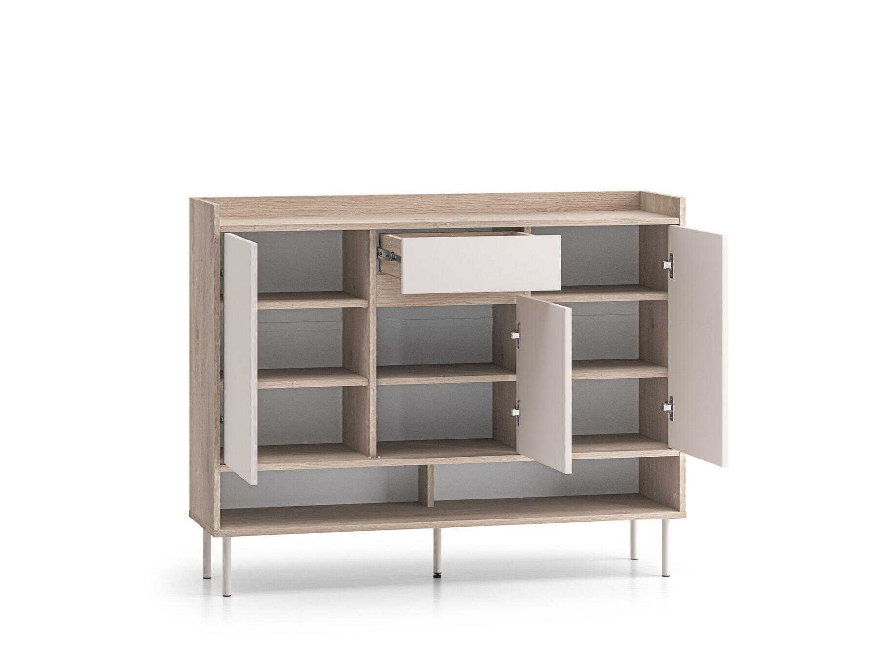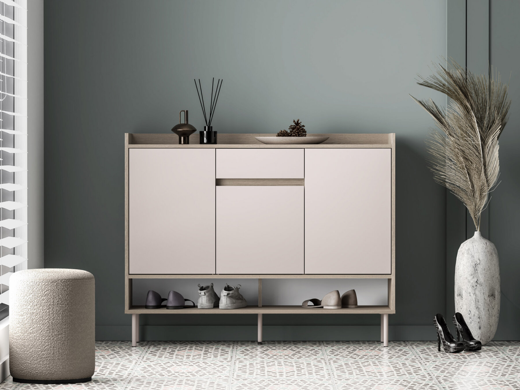 Mööbli alumises osas asub avatud ja lai riiul, mis sobib ideaalselt igapäevaste jalanõude paigutamiseks ning aitab hoida esiku korrastatuna.