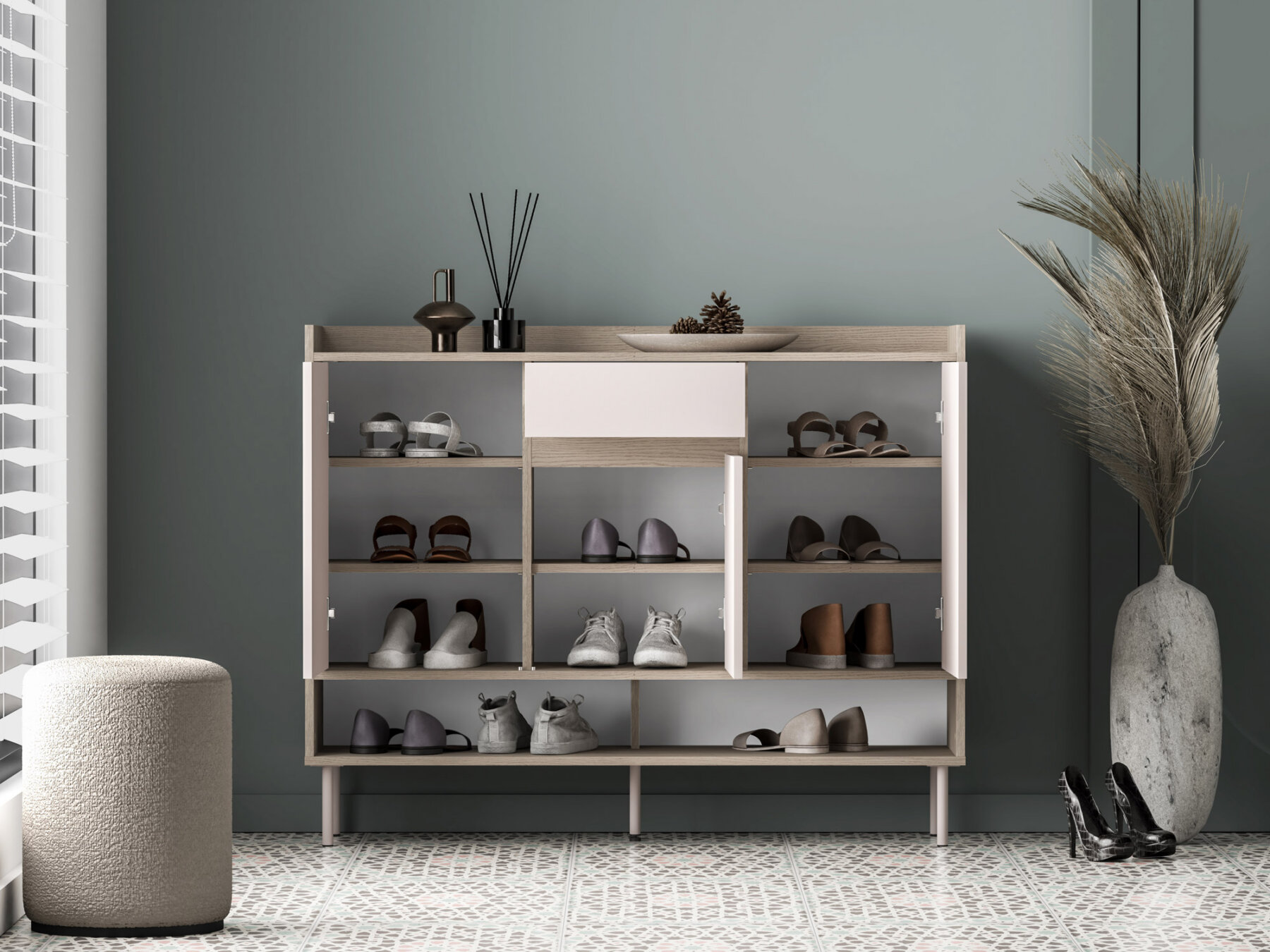 Voog 02 jalatsikapp on avar ja elegantne mööbliese esikusse. Sellel on kaheksa suletud sektsiooni jalanõude hoiustamiseks ning väike sahtel igapäevaste pisiesemete või autovõtmete jaoks.