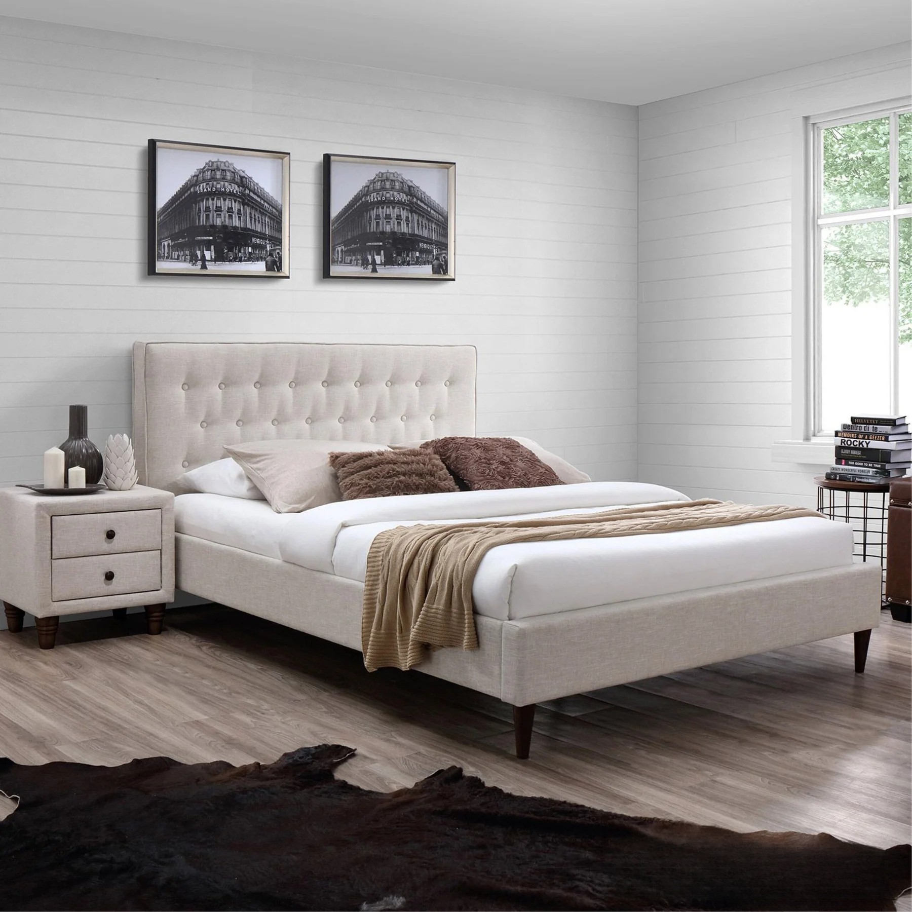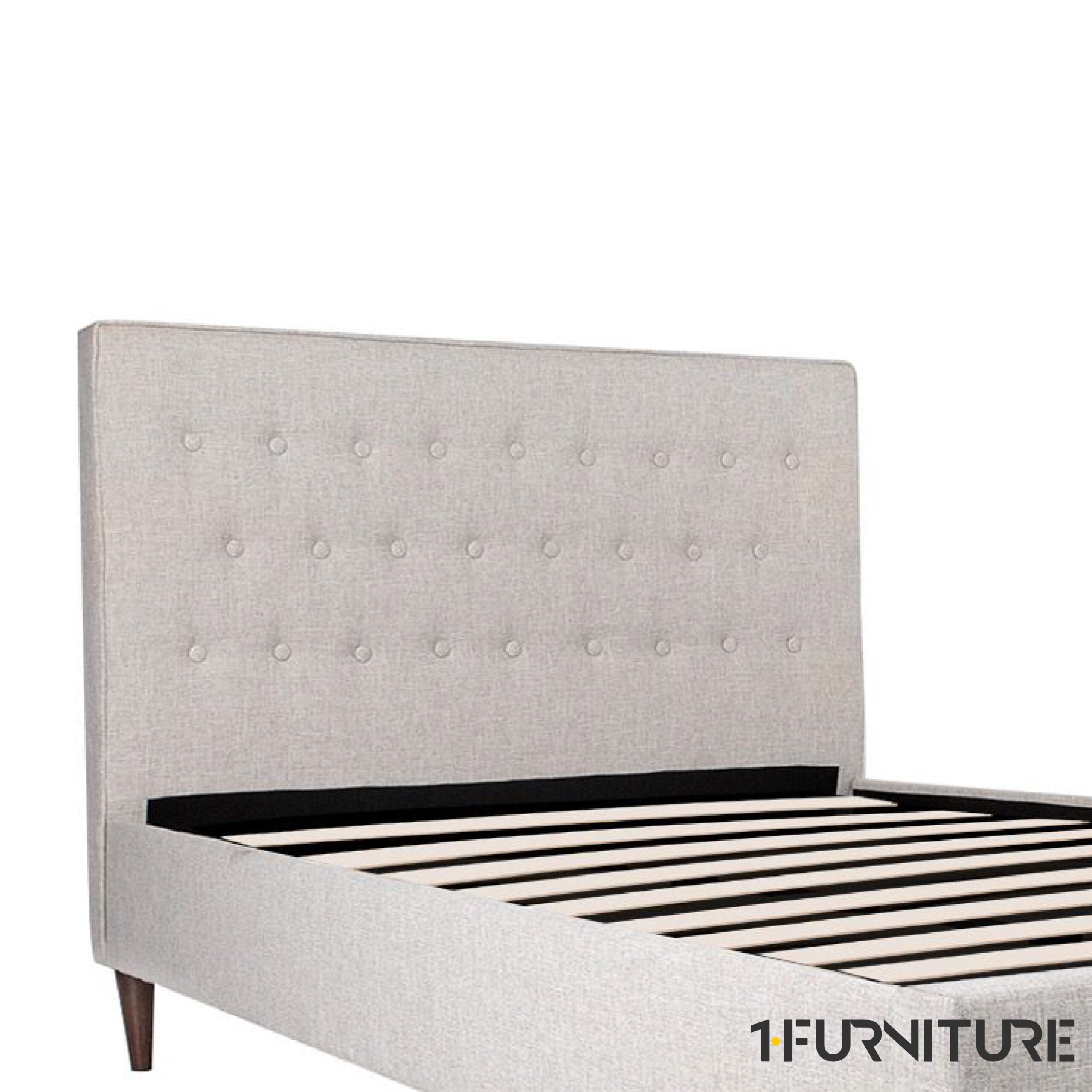 - Voodi korpus on valmistatud kvaliteetsest MDF-plaadist, mis tagab tugevuse ja pikaealisuse, ning on kaetud pehme ja vastupidava beeži polüesterkangaga, pakkudes luksuslikku ja hubast ilmet.