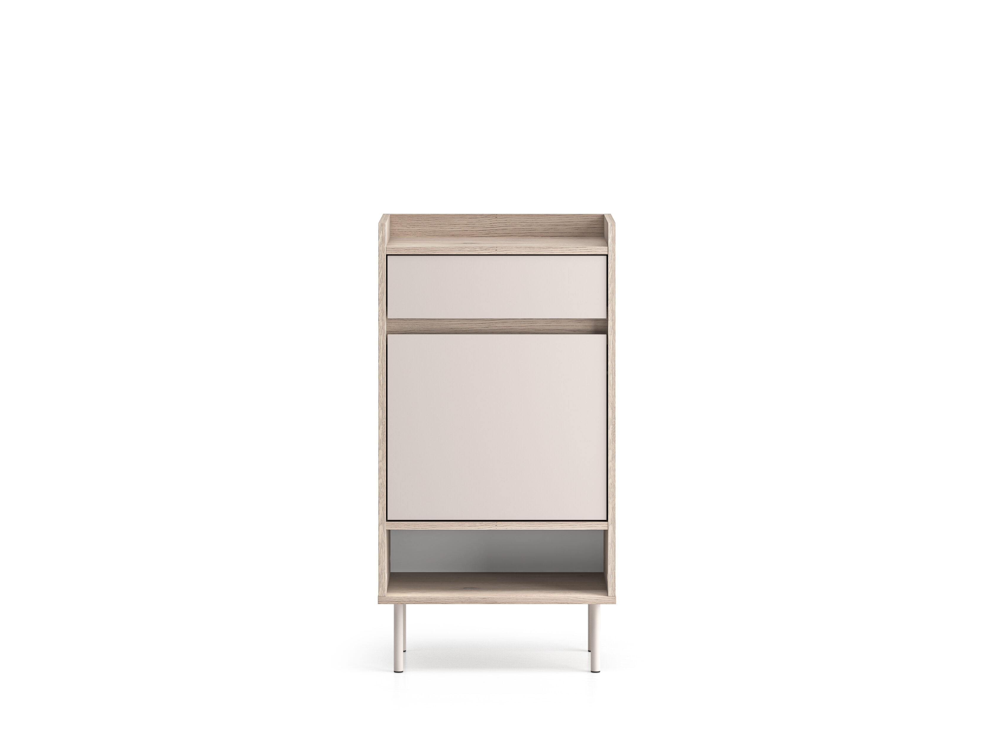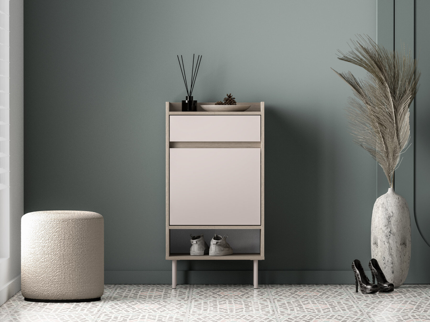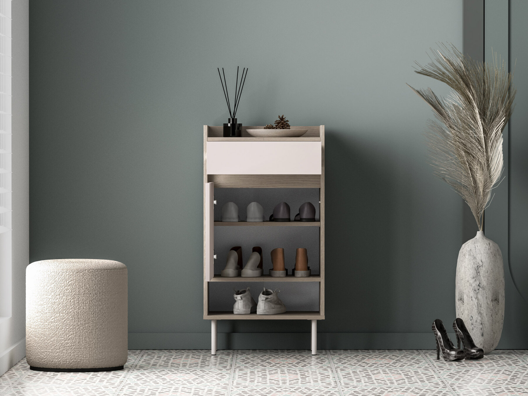 Sellel on kaks mahukat suletud sektsiooni jalanõude hoiustamiseks ning ülaosas avar sahtel võtmete või igapäevaste dokumentide jaoks. Allapoole langetatud pealispind on nii stiilne kui ka praktiline lahendus — võtmed või paberid ei kuku kunagi kapi taha.